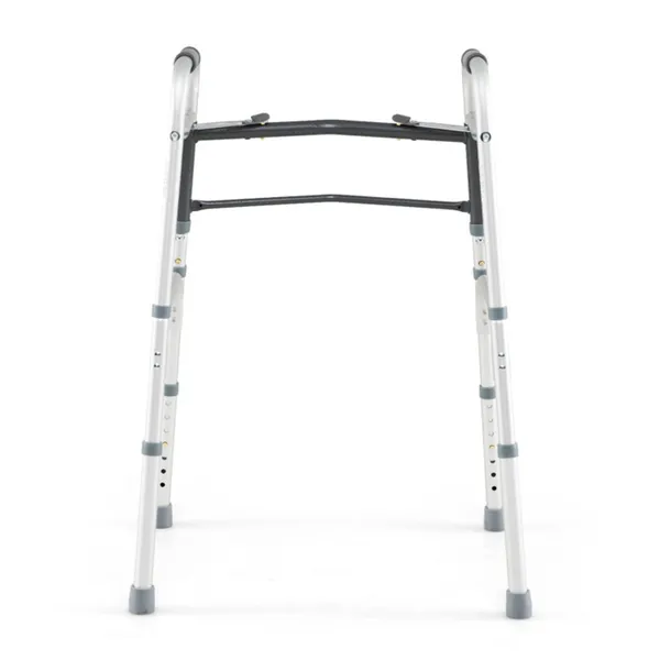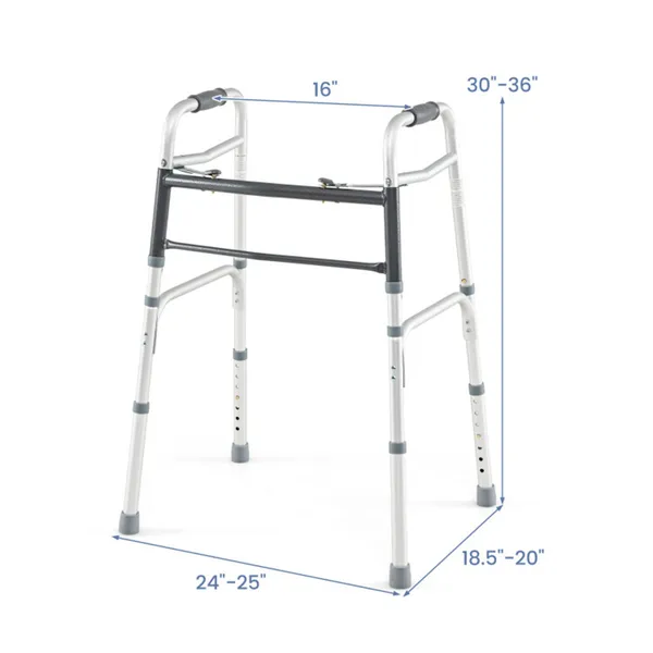 • Foldable & Portable Design: With a unique 2-button mechanism, this folding walker collapses into a flat size within seconds. It is a game-changer for seniors and caregivers seeking grab-and-go convenience for the car trunk or tight closet storage. • Adjustable Height & Width: Enjoy effortless, tool-free adjustment with 7-level height range (30"-36") and easy pinch-free push buttons. The numerically labeled sides of this standard foldable walker ensure both sides stay perfectly aligned for wobble-free support. • Lightweight Strength: Engineered from robust aluminum with a reinforced double-bar structure, this lightweight walker ensures exceptional stability and supports up 350 lbs.Moreover, it remains easy to lift and maneuver - an ideal companion for seniors and caregivers alike. • Safe Steps, Clean Floors: Outfitted with premium rubber foot pads, this mobility aid prevents slipping and is perfect for most floors, from plush carpets to polished tiles, wooden floors, and sidewalks. It offers peace of mind with every step, indoors or outdoors. • Empower Independent Life: Designed with comfortable grip handles, this walking aid is the perfect choice for seniors, disabled, or post-surgery users seeking daily mobility and long-lasting ease, ensuring freedom and comfort during every journey.