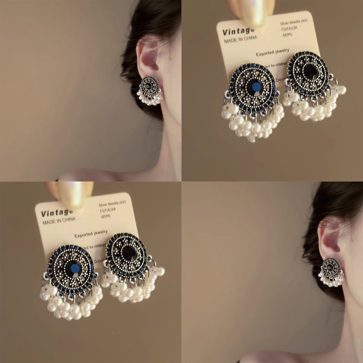 Silver Needle Retro Geometric Tassel Pearl Earrings