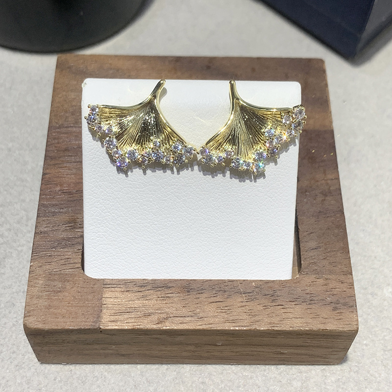 Silver Needle Studded Diamond Metal Ginkgo Leaf Earrings