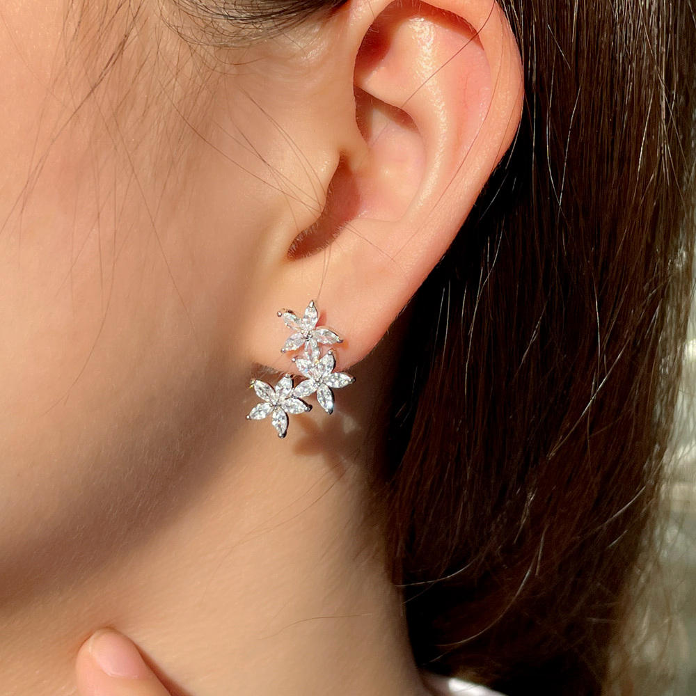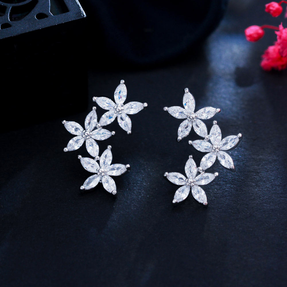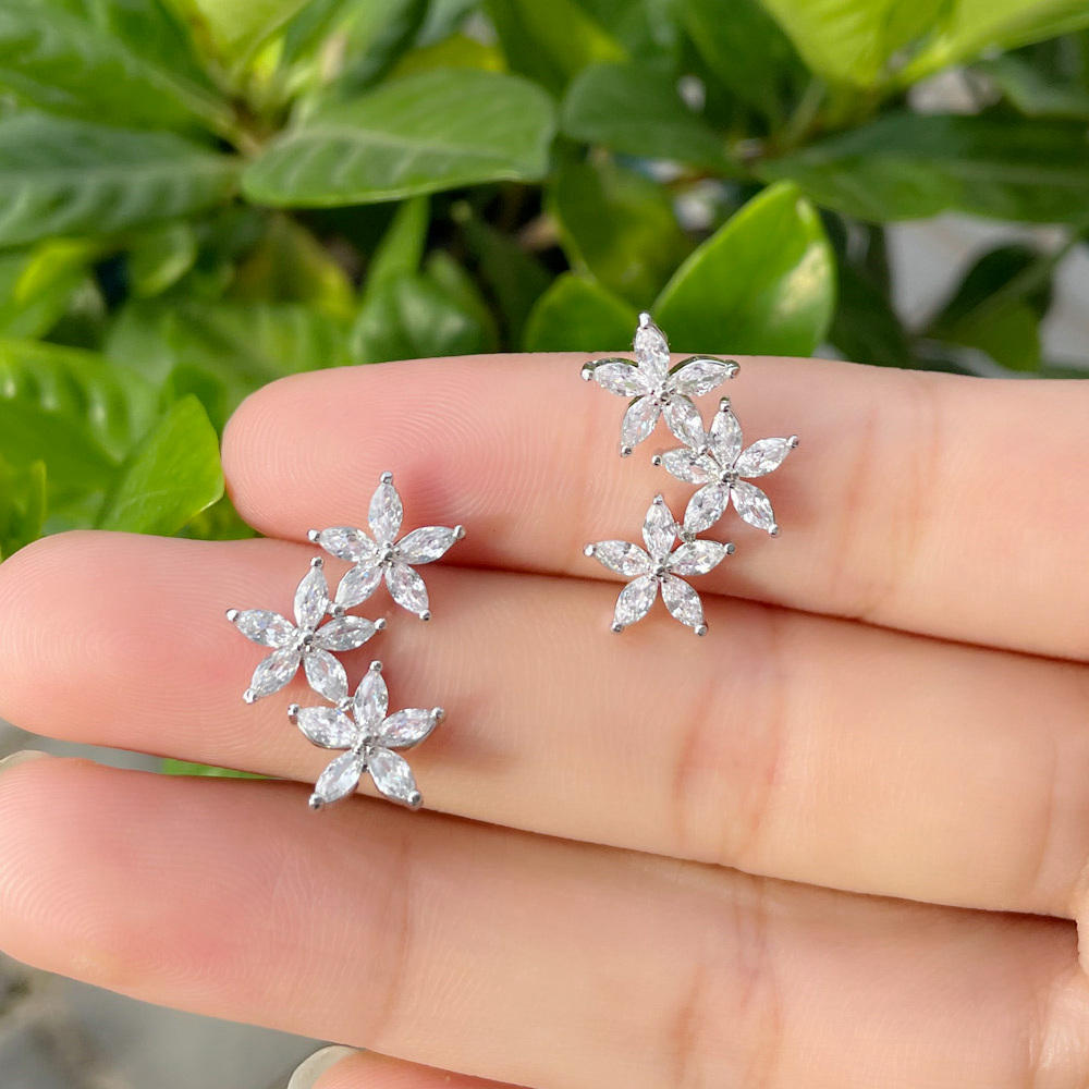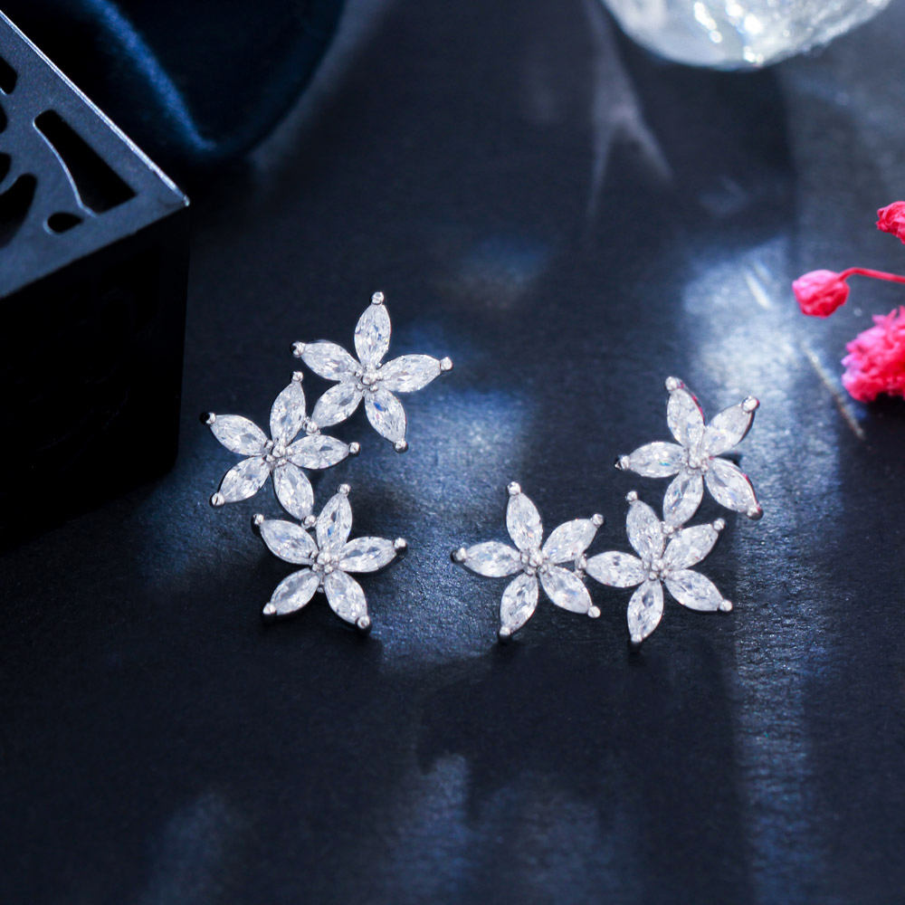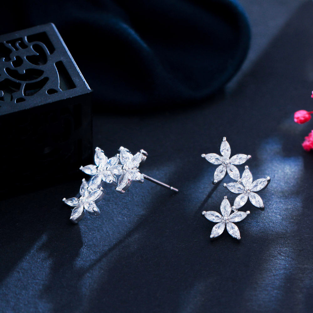 Silver-Plated Cubic Zirconia Cluster Flower And Leaf Stud Earrings
