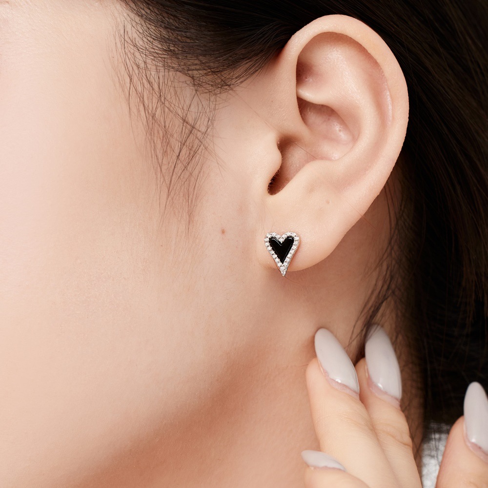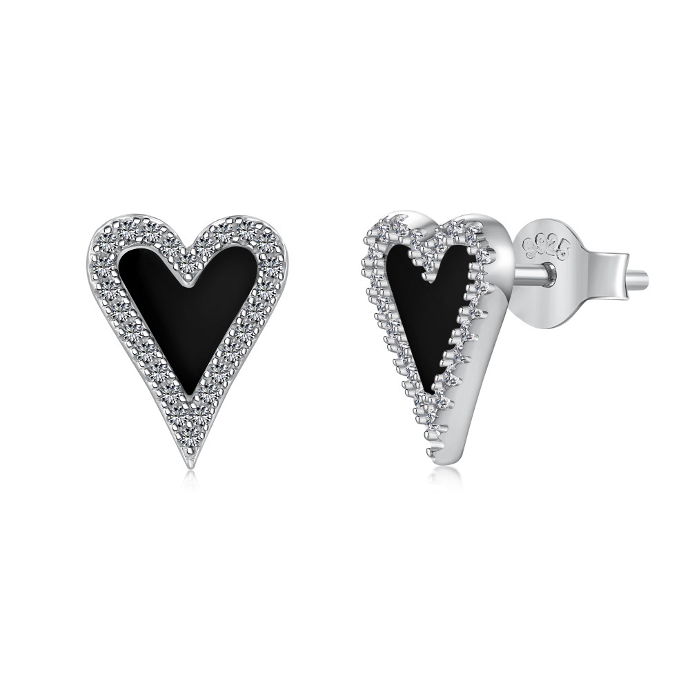 Silver S925 Black Agate Heart-shaped White Stud Earrings