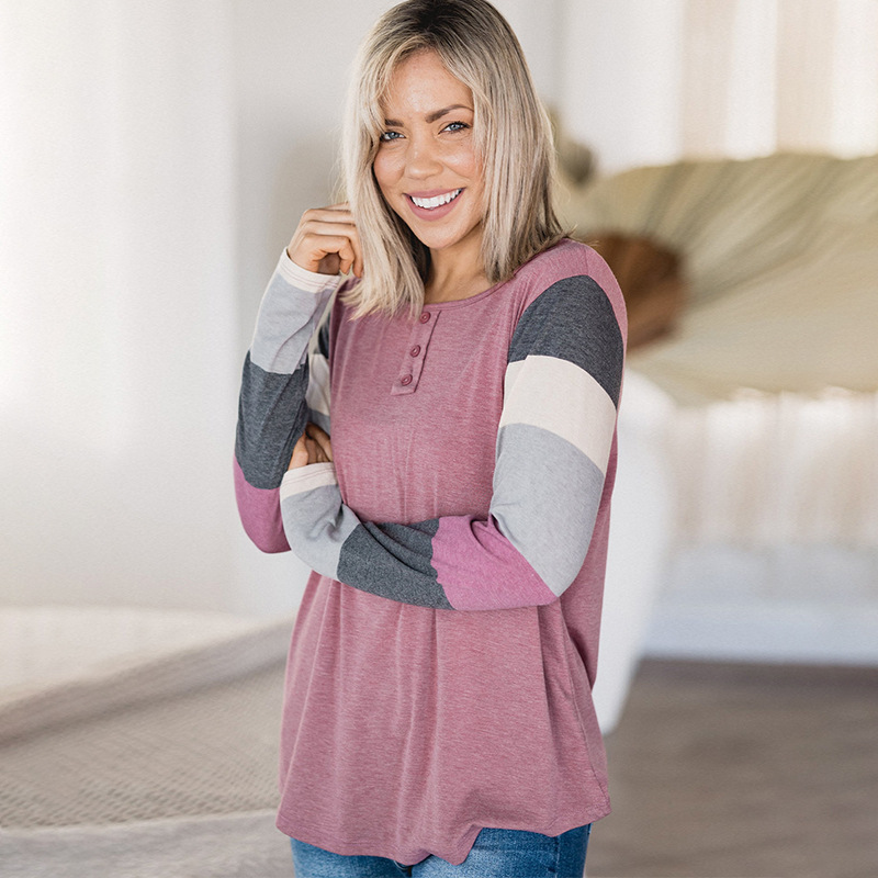Popular elements: sleeve contrast color round neck fastener decoration pullover T-shirt