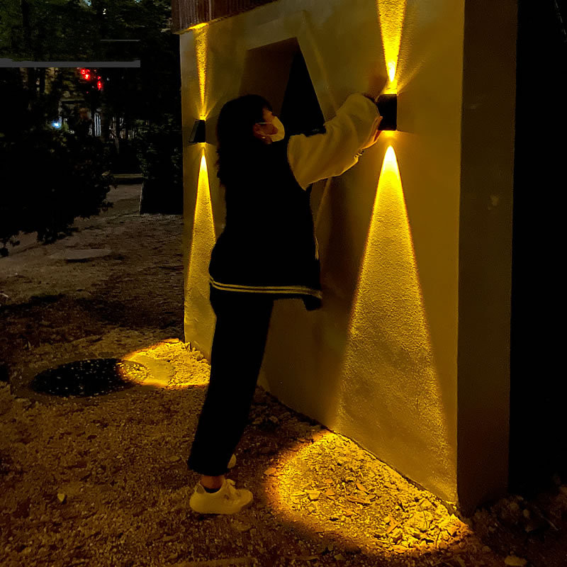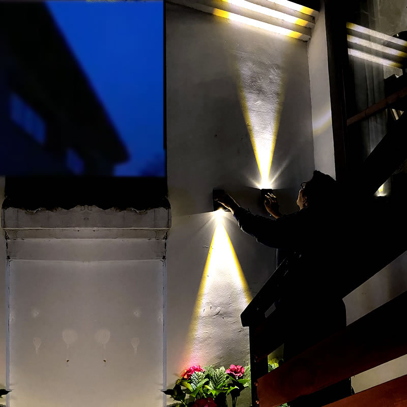 Solar panel: 1.3W 5V tempered glass laminated solar panel (up to 20-25 years lifespan) Description: Upper and lower dual light sources, glass laminated solar panel, lens wall wash effect, automatic day and night switching.