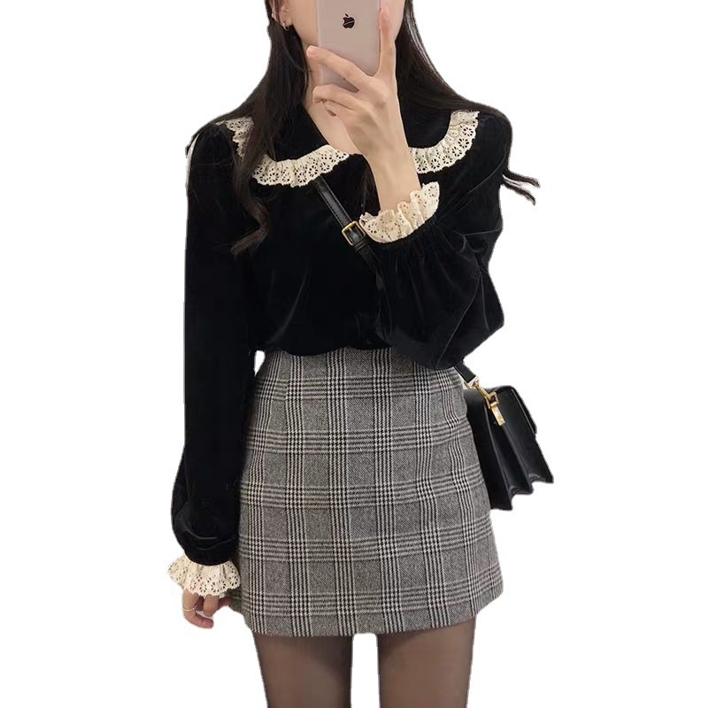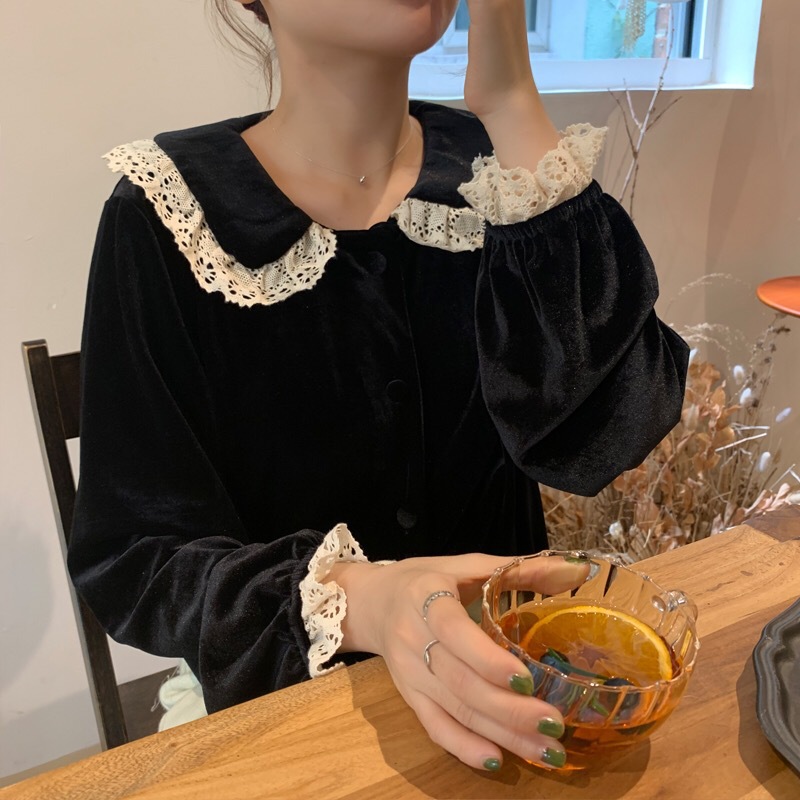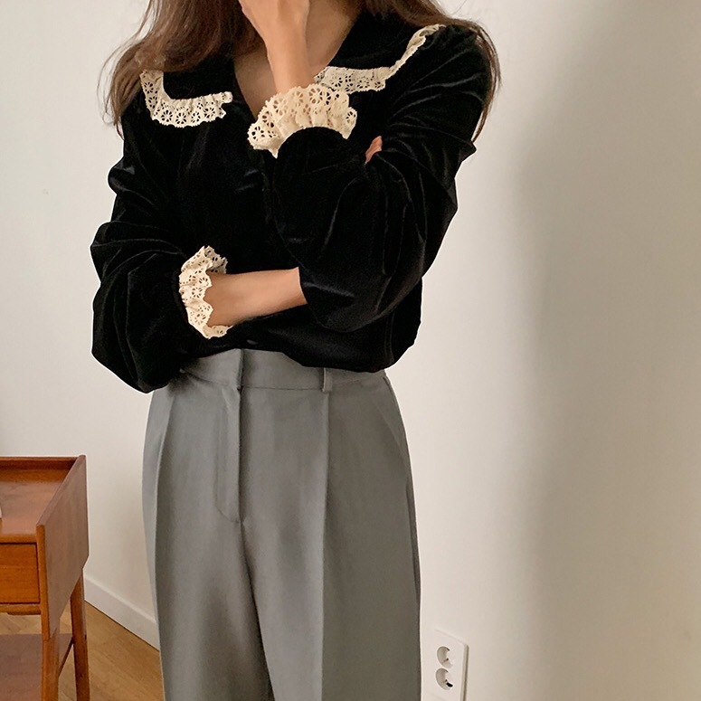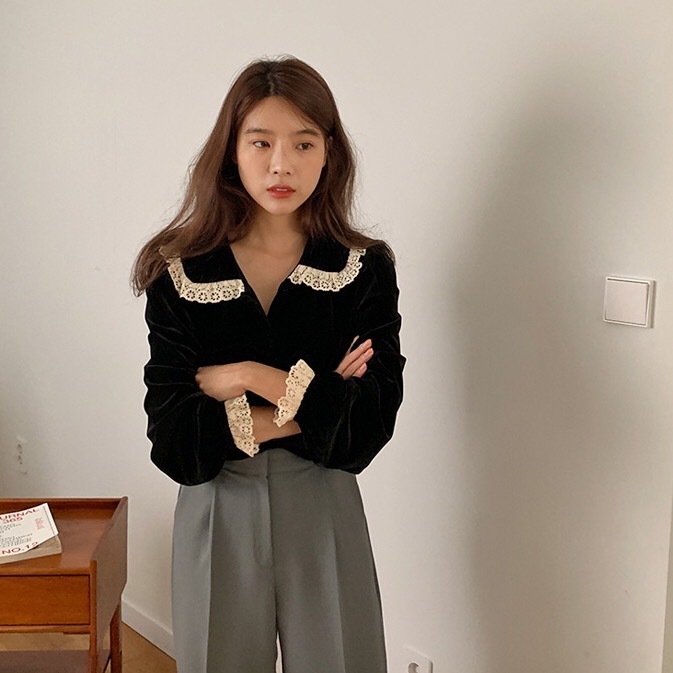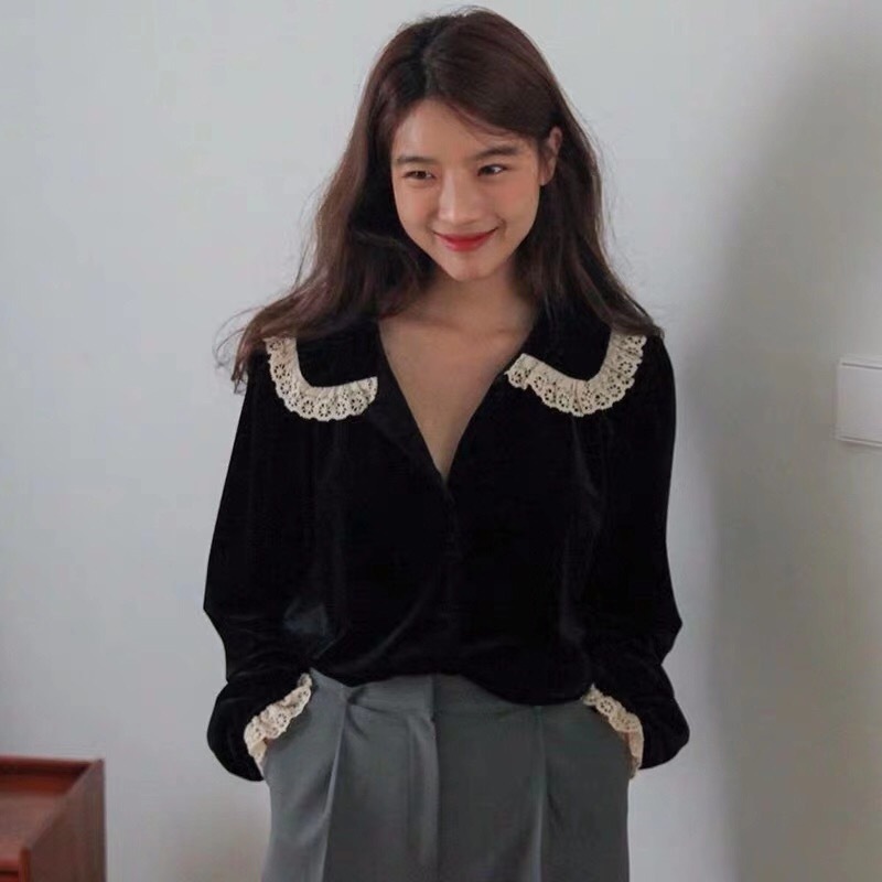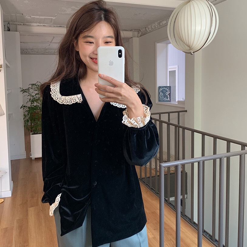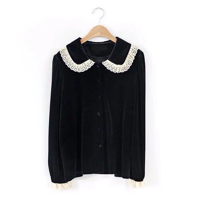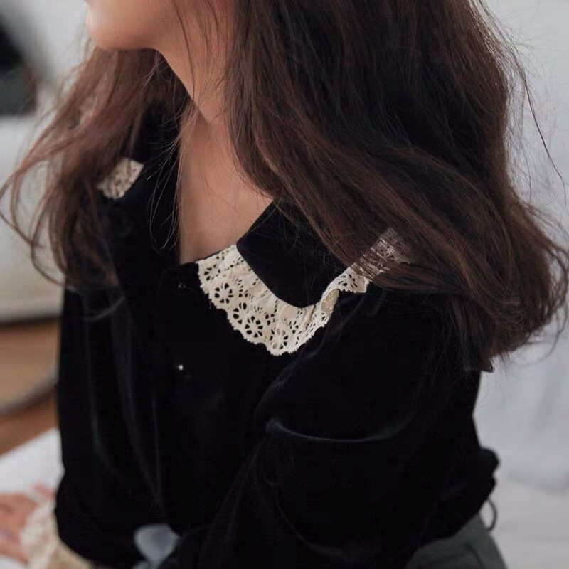 Simple Lace Stitching Lapel Single Breasted Velvet Shirt