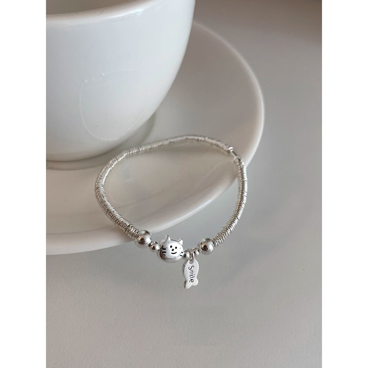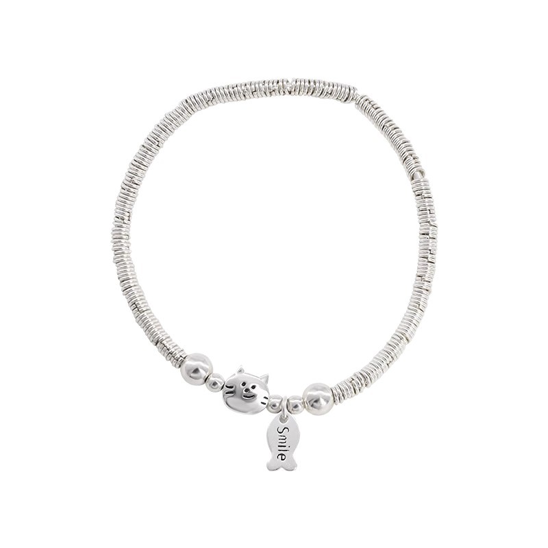 Simple Sterling Silver Small Plate Wrapped With Cat And Fish Eating Bracelet
