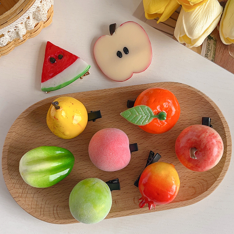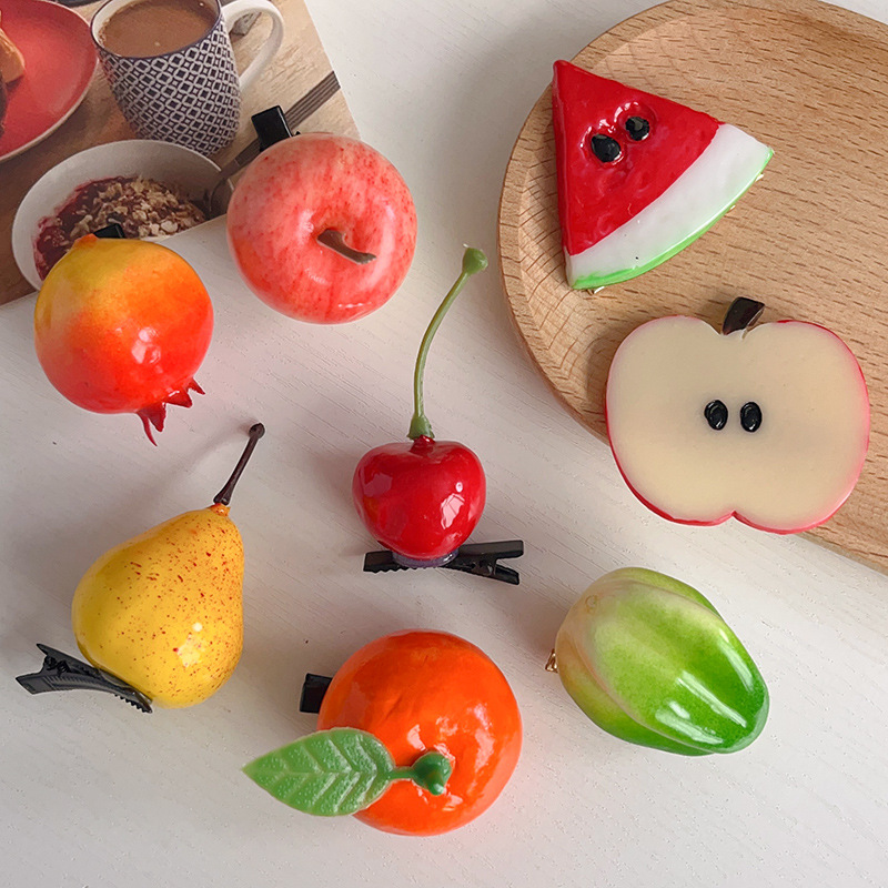 Color: red cherry barrettes, orange barrettes, peach barrettes, pear barrettes, pomegranate barrettes, Red Apple barrettes, lime barrettes, apple slices barrettes, watermelon slices barrettes, orange slices barrettes, orange slices barrettes, lime Lemon slice barrettes, banana barrettes, carambola barrettes, lemon barrettes