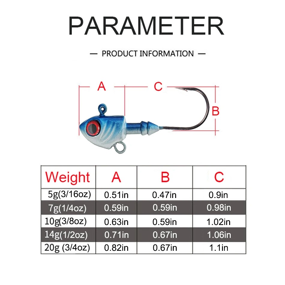 Specifications: 3.5g fish type lead head hook, 5g fish type lead head hook, 7g fish type lead head hook, 10g fish type lead head hook, 14g fish type lead head hook, 20g fish type lead head hook, 28g fish type lead head hook