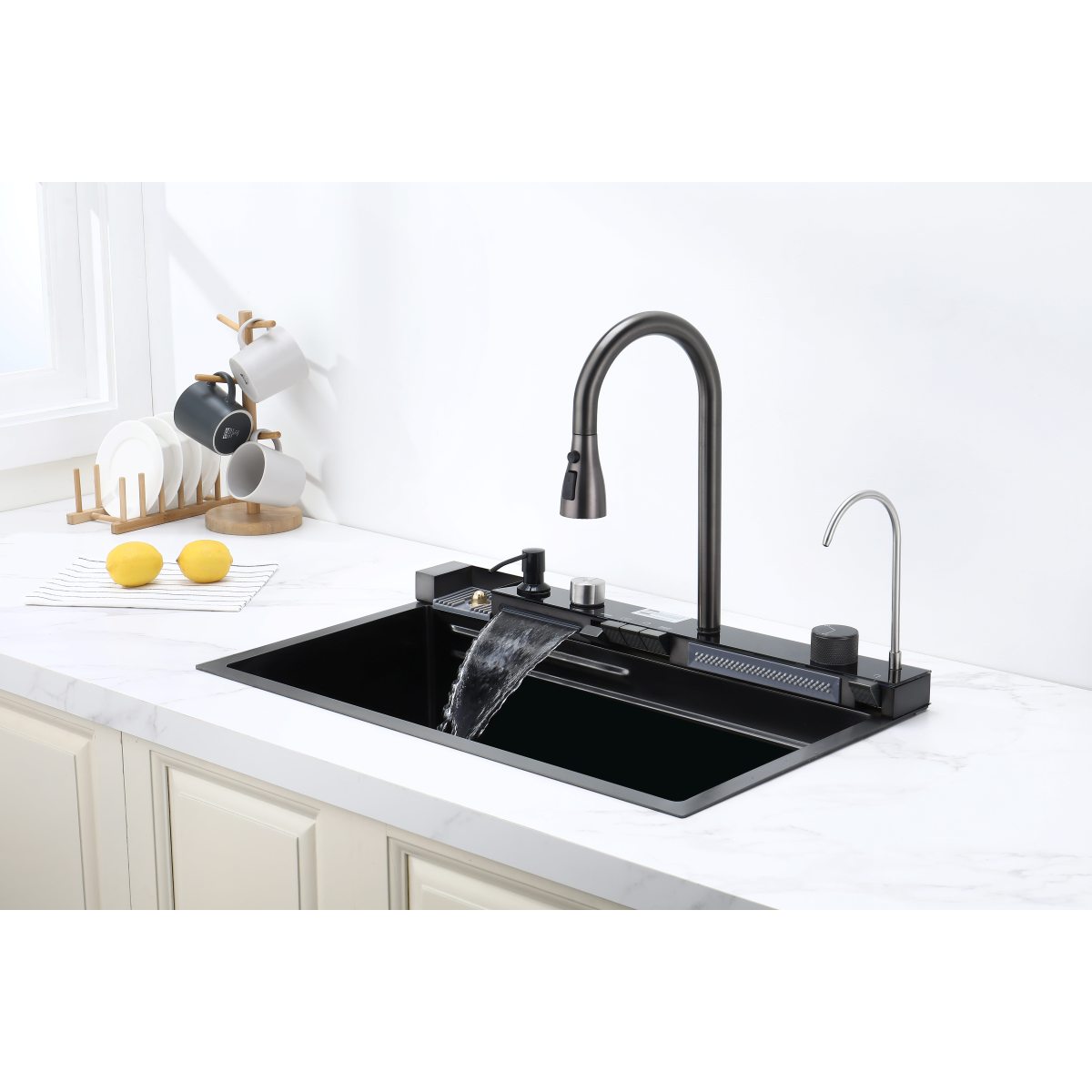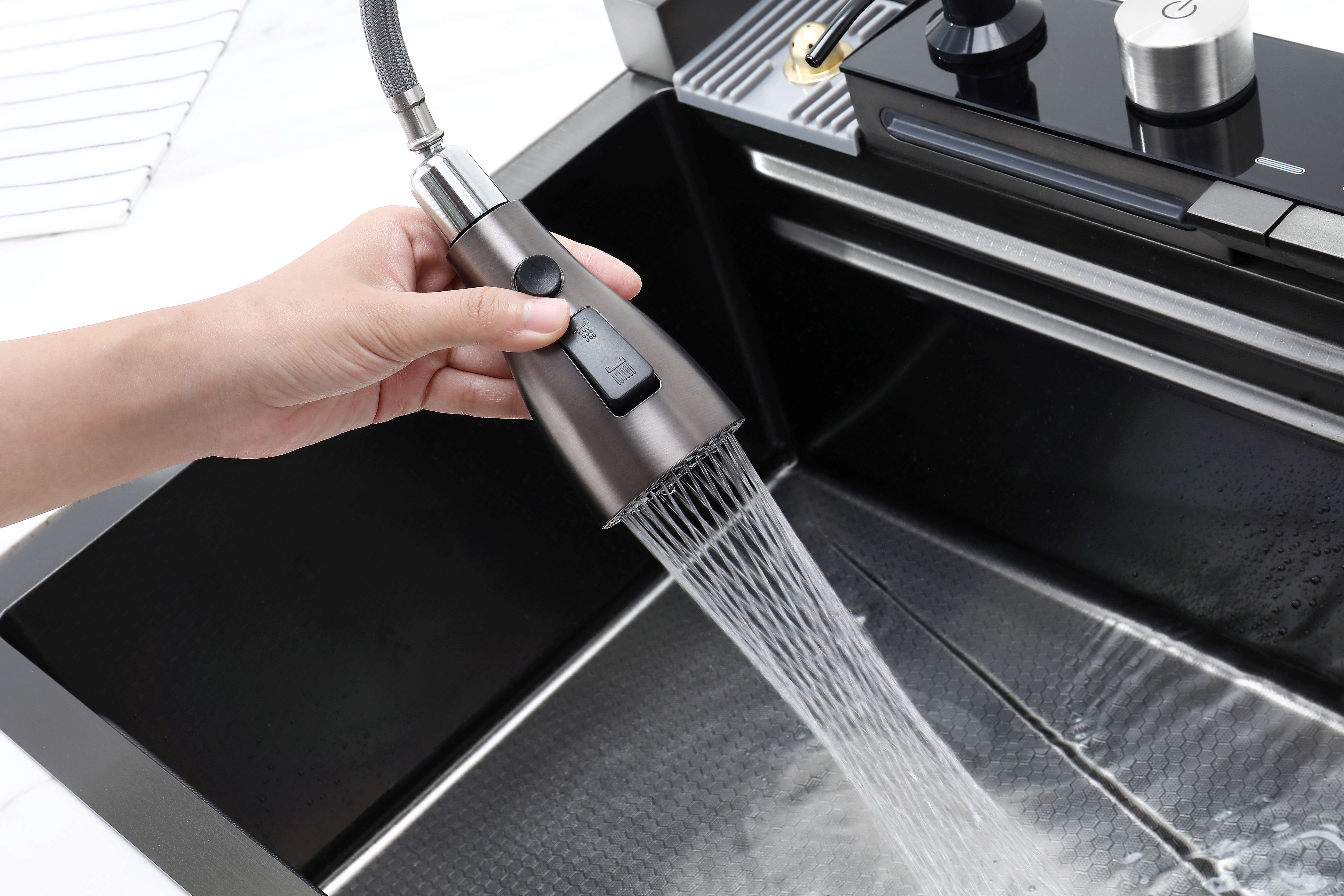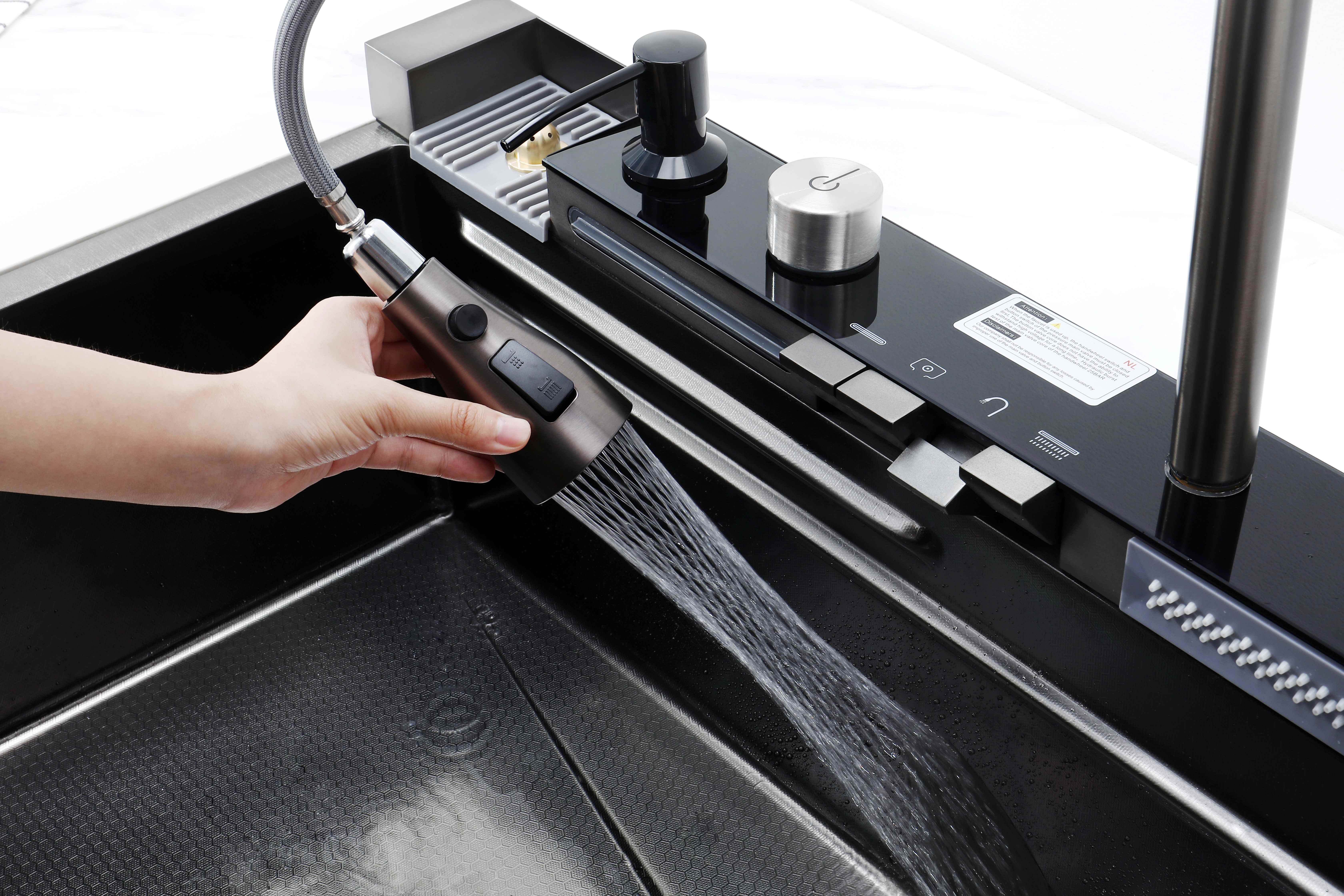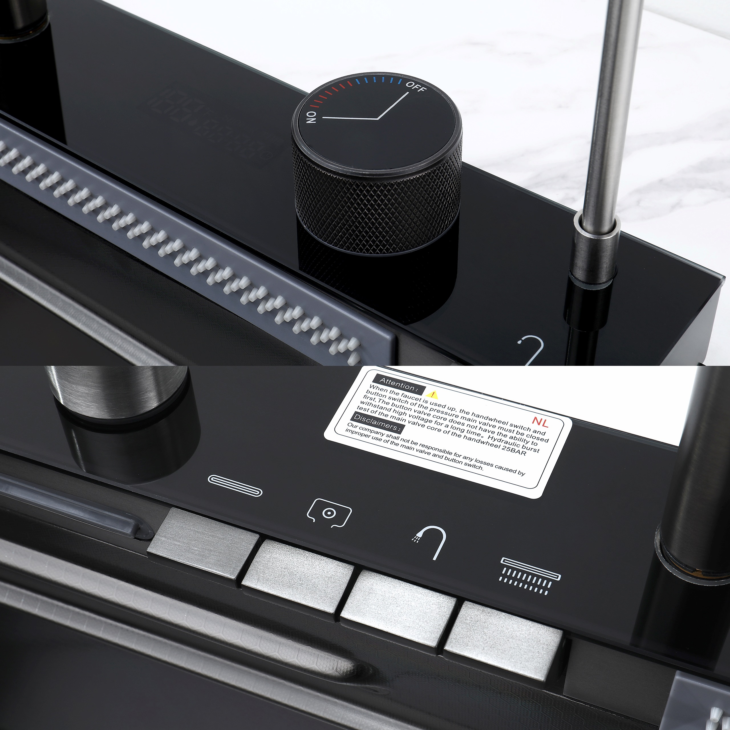 Smart Control: The digital screen shows the water temperature (℉) and time of use in real time. Creative piano buttons for independent control of waterfalls outlet, cup washer, pull-out faucet and raindance water flow. Paired with a soap dispenser, it simplifies all your kitchen cleaning tasks effortlessly.