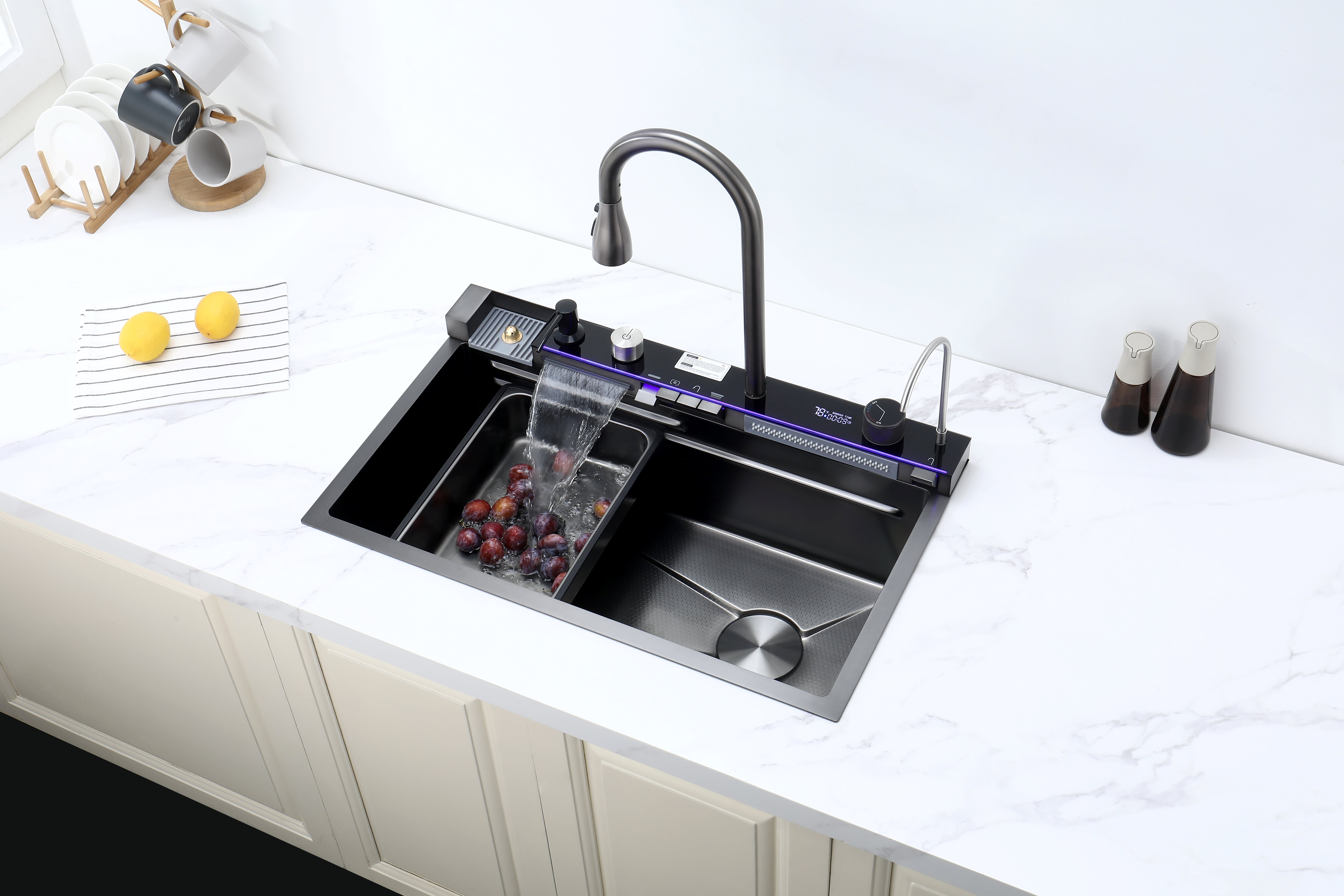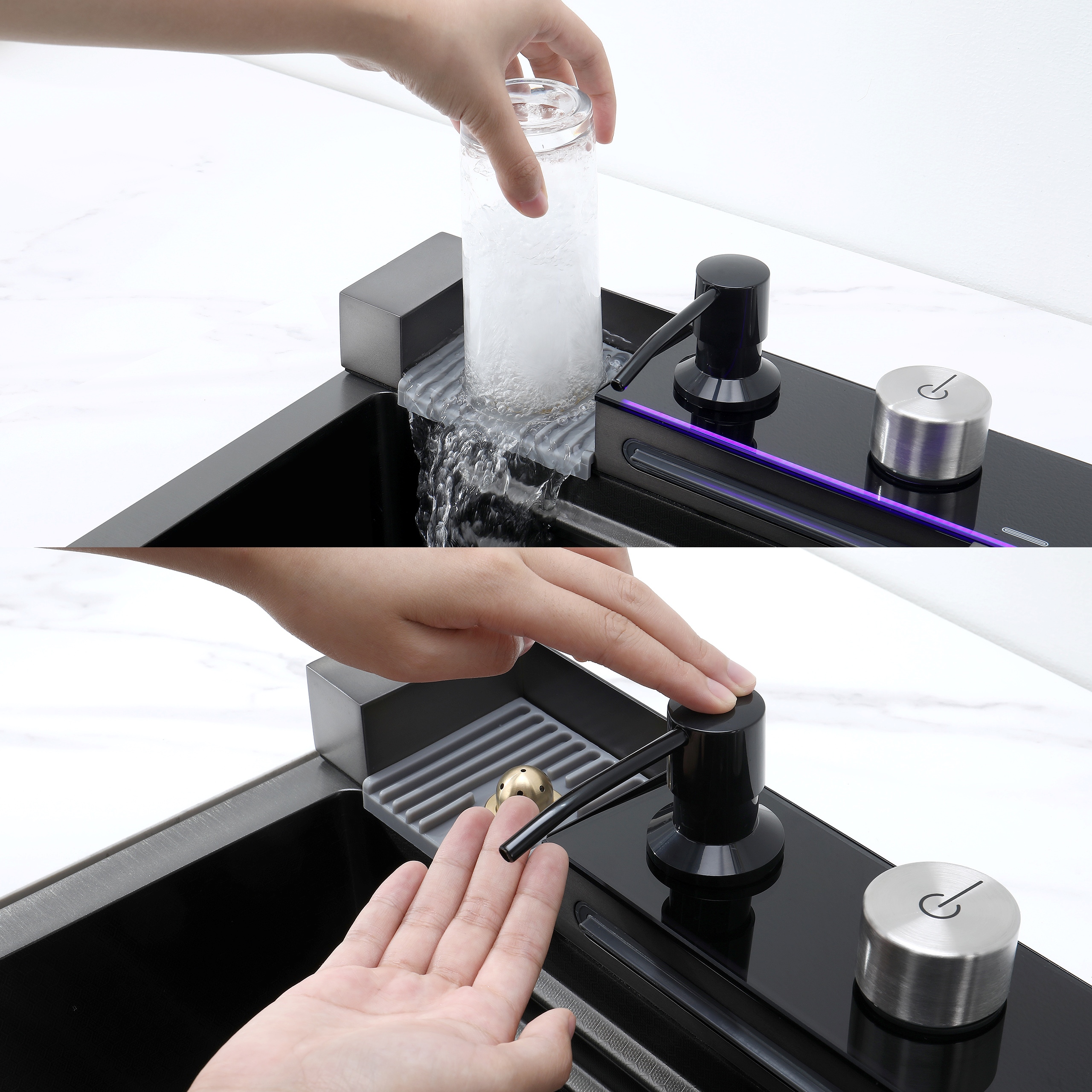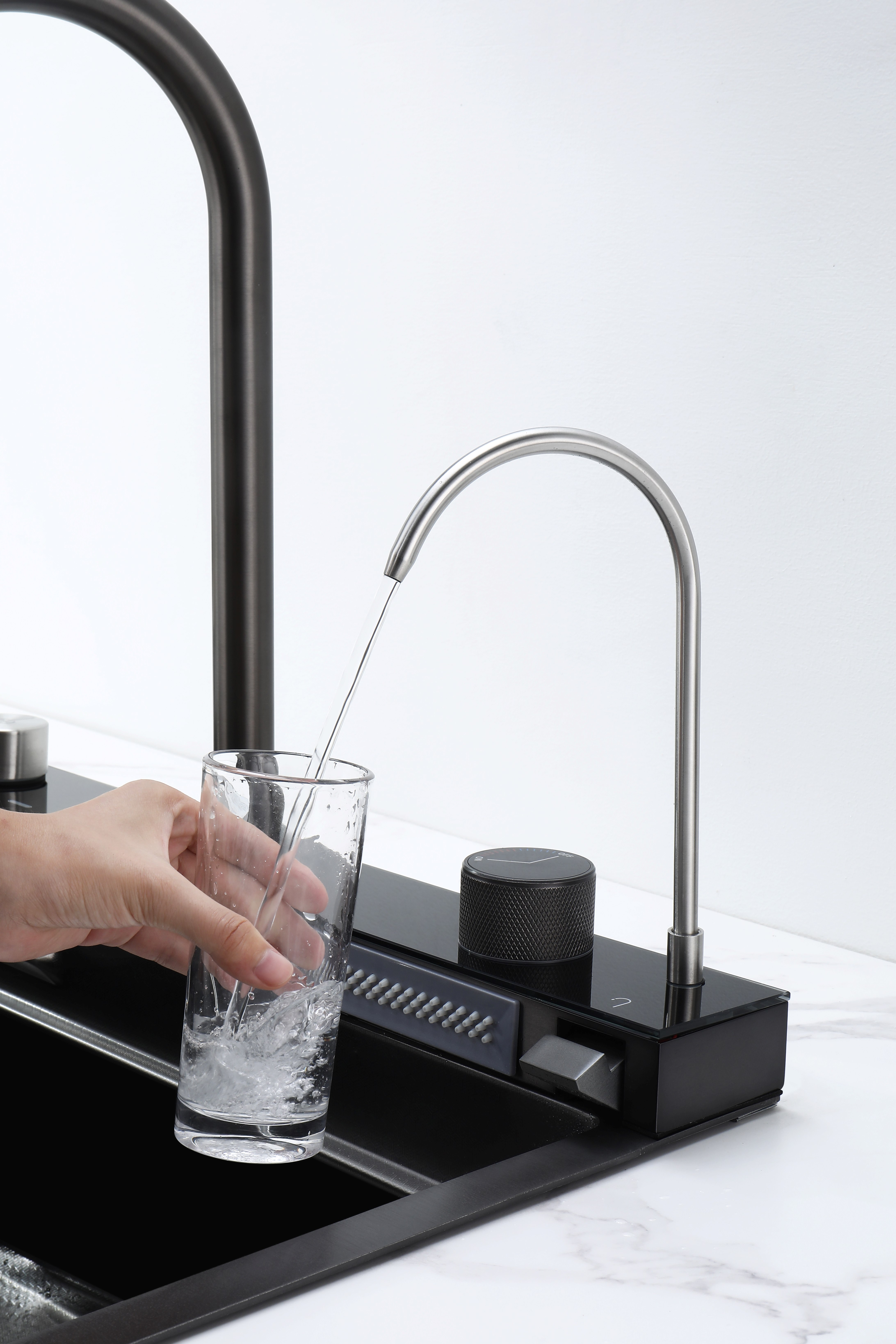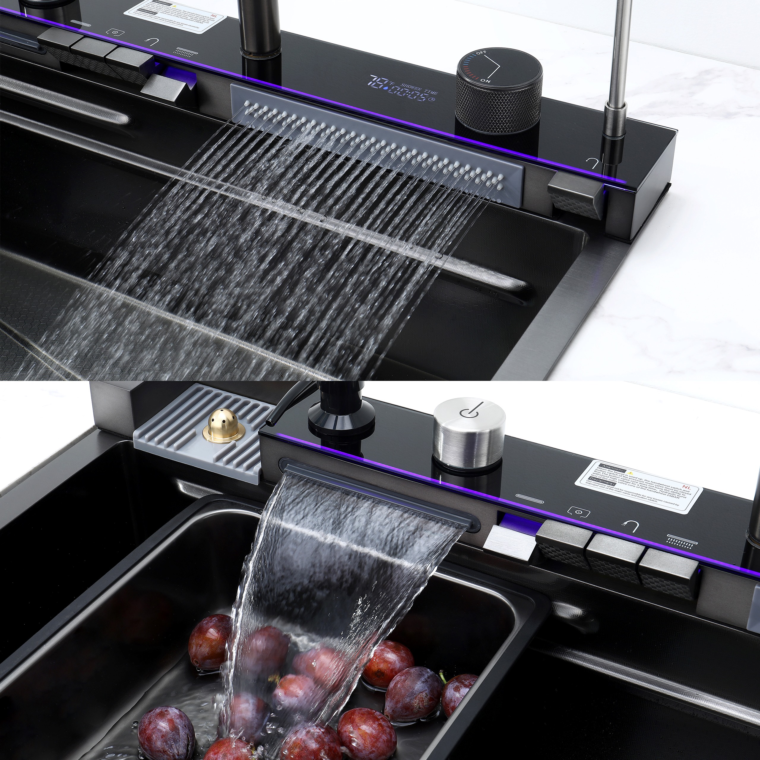 Smart Control: The digital screen shows the water temperature (℉) and time of use in real time. Creative piano buttons for independent control of waterfalls outlet, cup washer, pull-out faucet and raindance water flow. Paired with a soap dispenser, it simplifies all your kitchen cleaning tasks effortlessly.