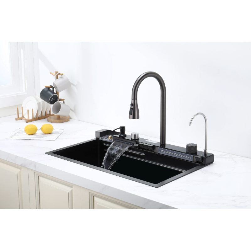 Single Bowl Kitchen Sink With Pull-Out Faucet, 304 Stainless Steel Waterfall Sink, Vegetable & Dish Washing Sink For Kitchen, Laundry Or Utility Use