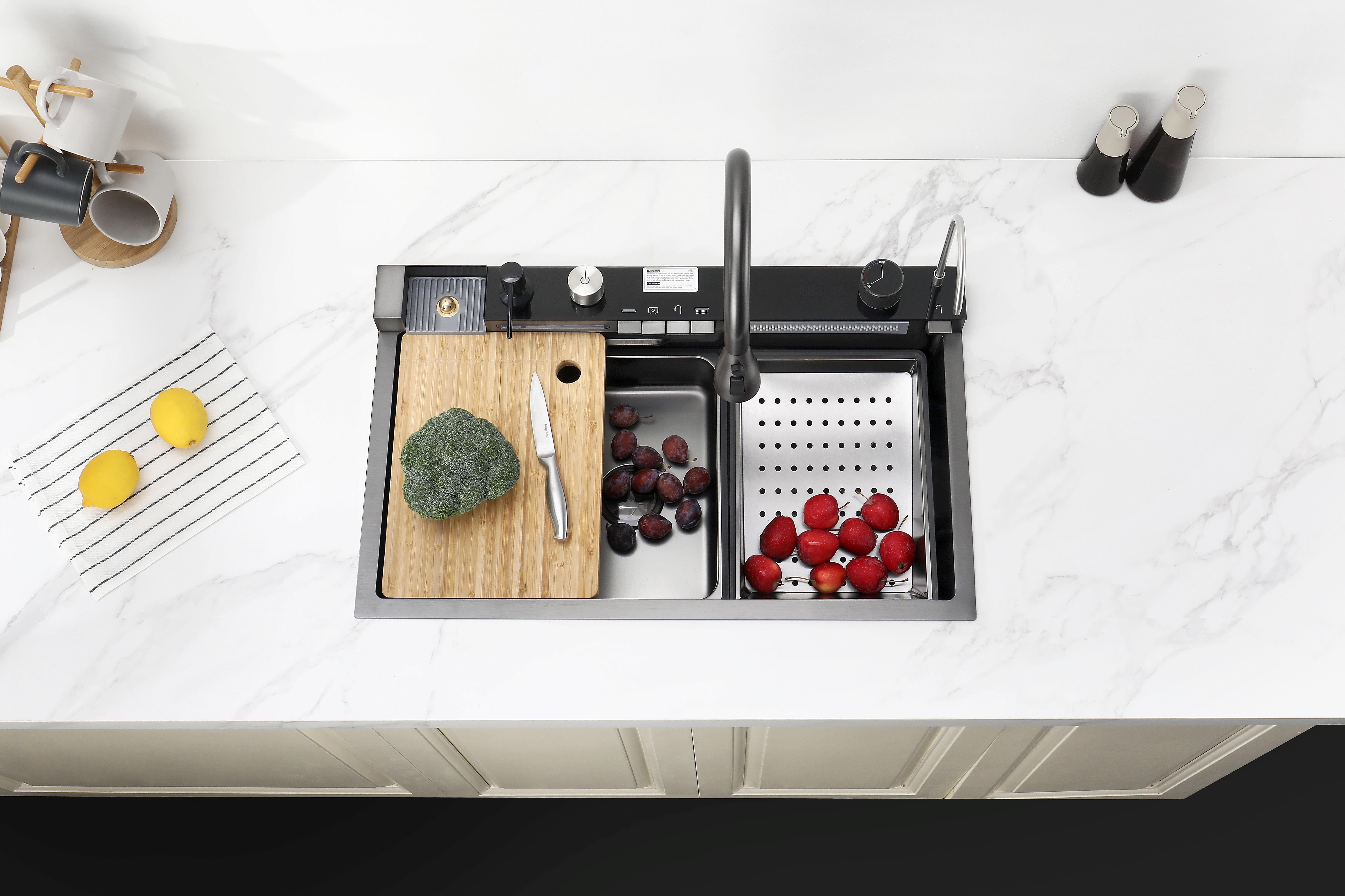 Clean & Space-saving: You can slide all the built-in fittings, including the cutting board, the basin-in-basin and the triangular drainage basket to save more space. All the waste and water can be directly left in the sink instead of flowing everywhere.