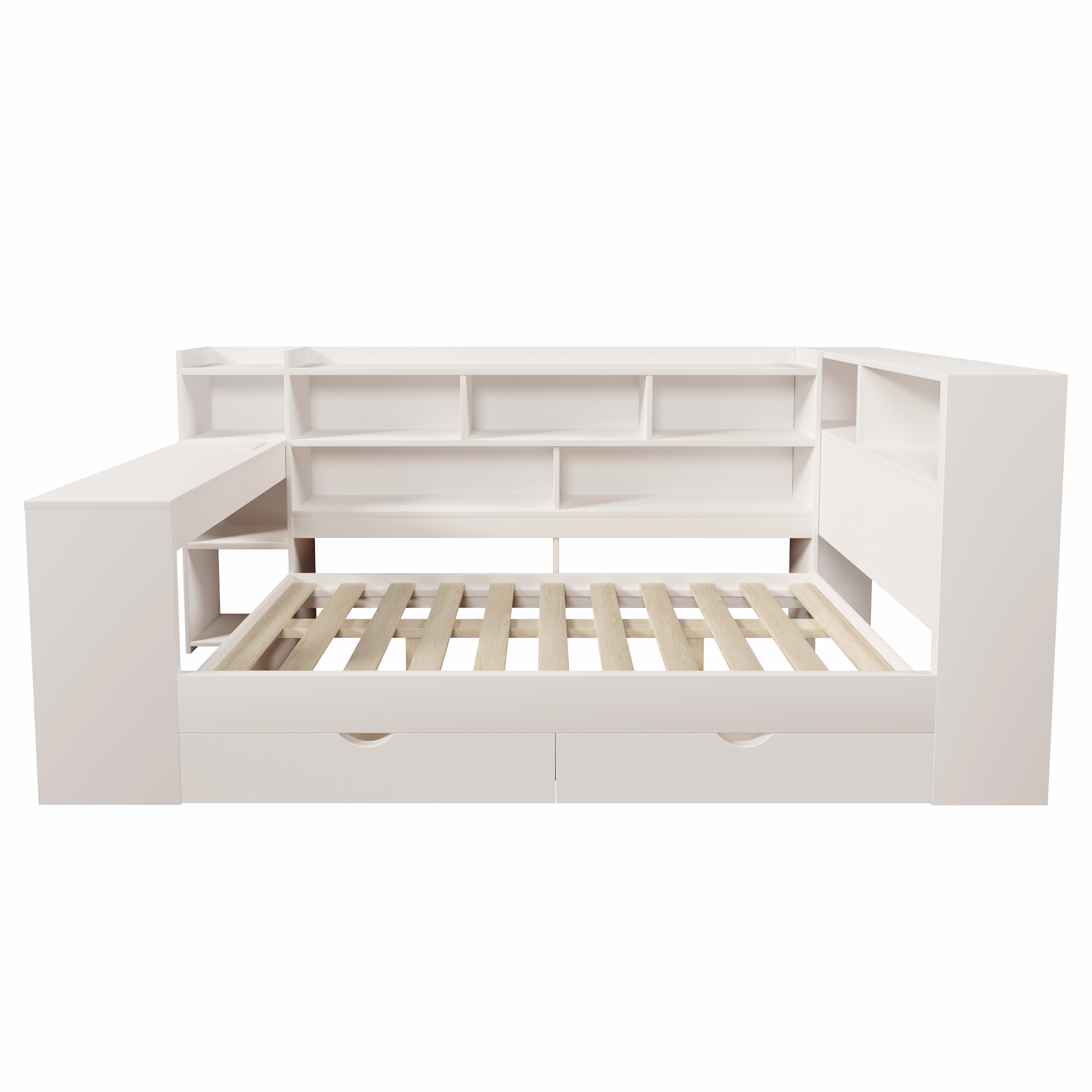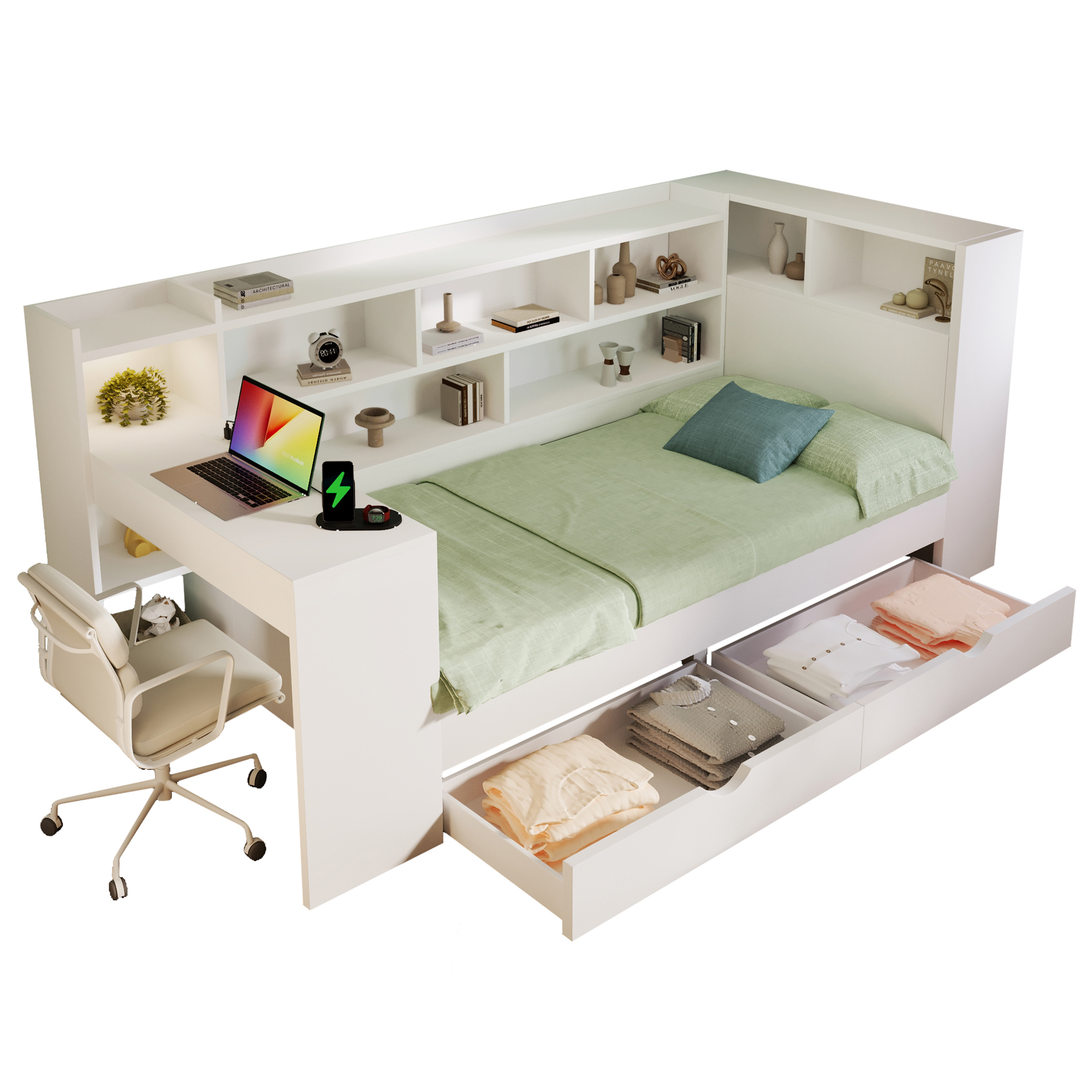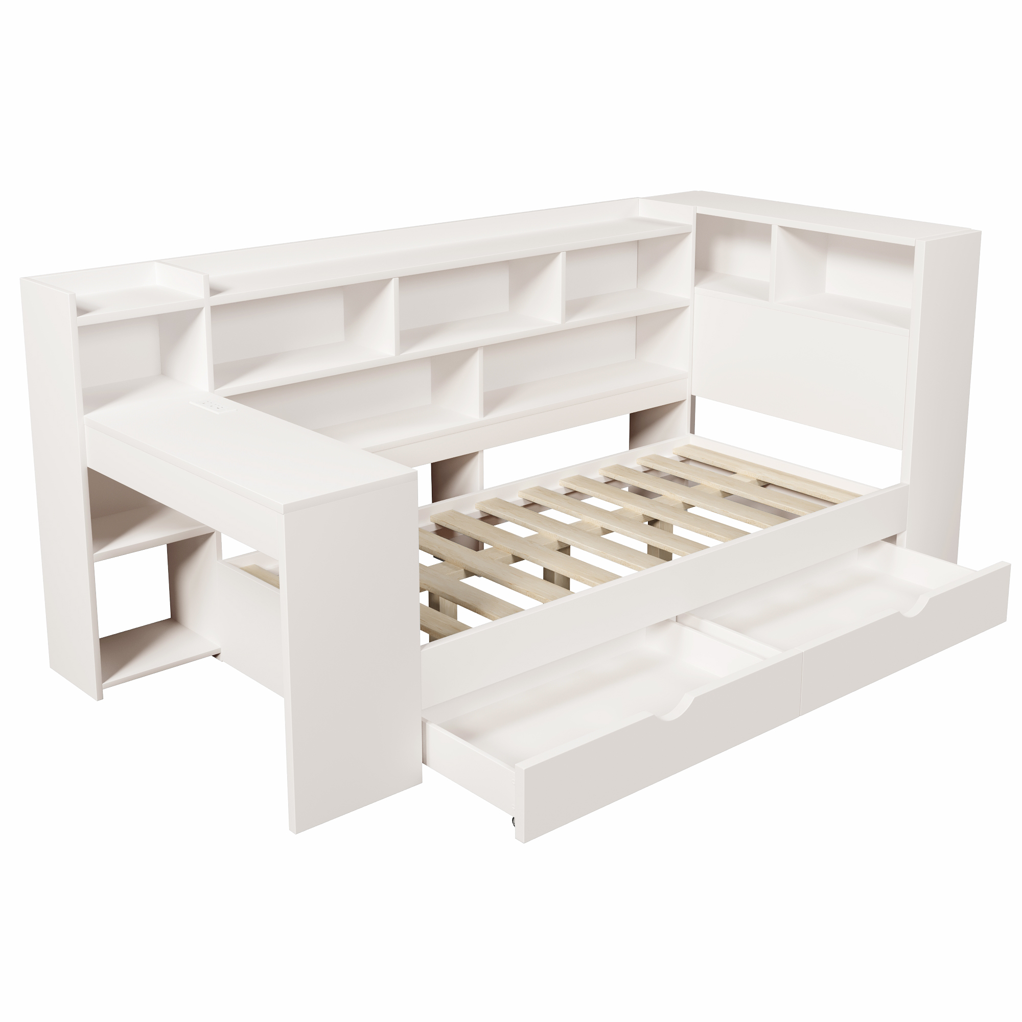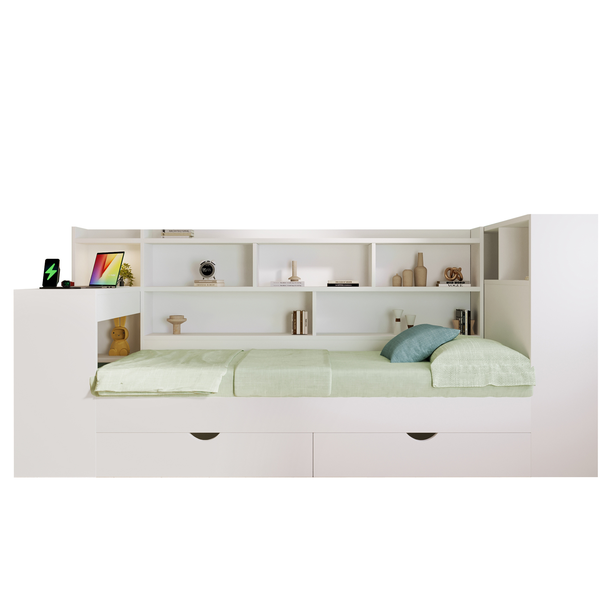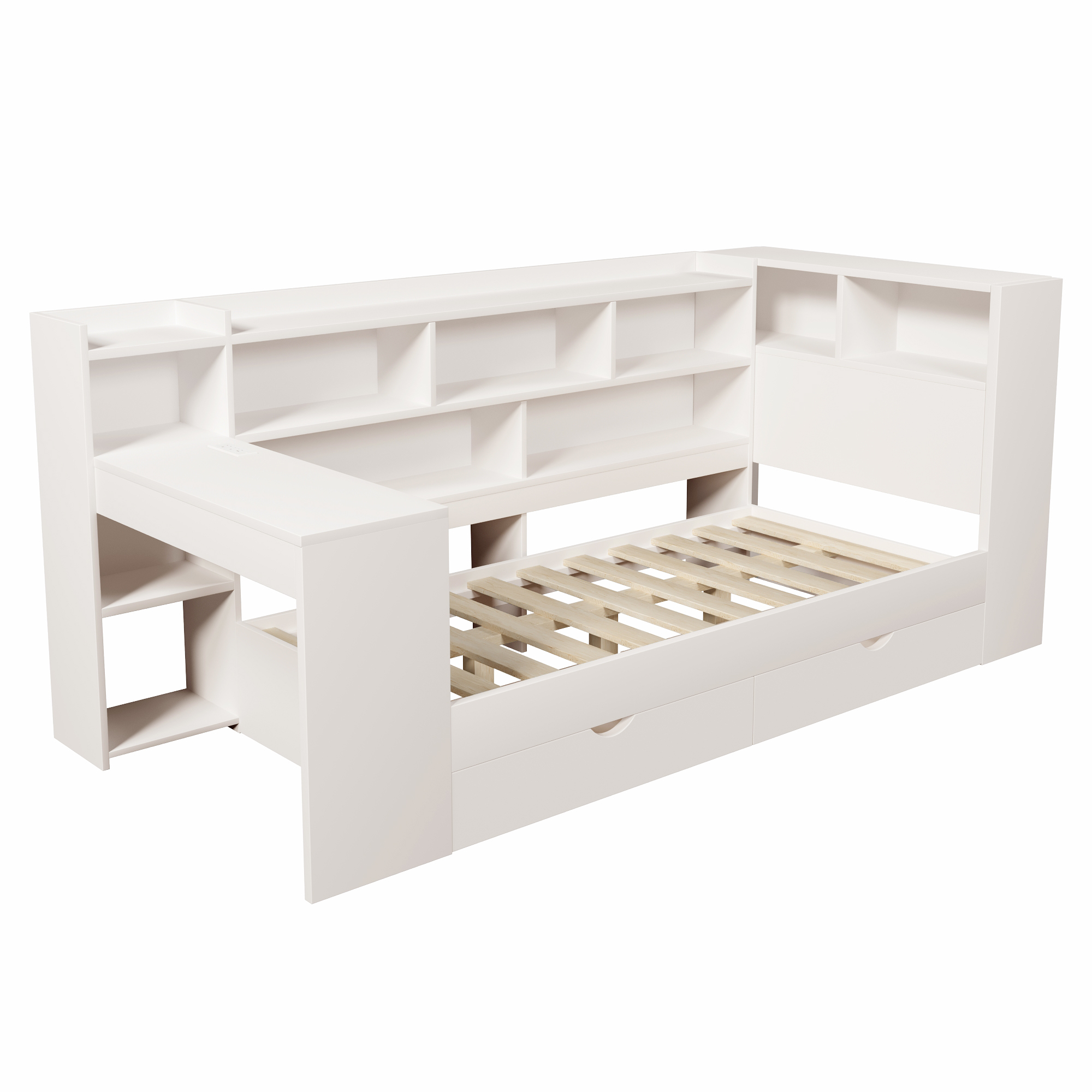 - 【Multi-functional All-in-One Design】This daybed combines a sleeping area, a work/study area, and storage space in one unit. It includes shelves, drawers, and a desk with charging ports. The charging ports include two UK standard sockets, one USB port, and one Type-C port. The modular design maximizes space utilization, making it an ideal space-saving choice for students and working professionals.