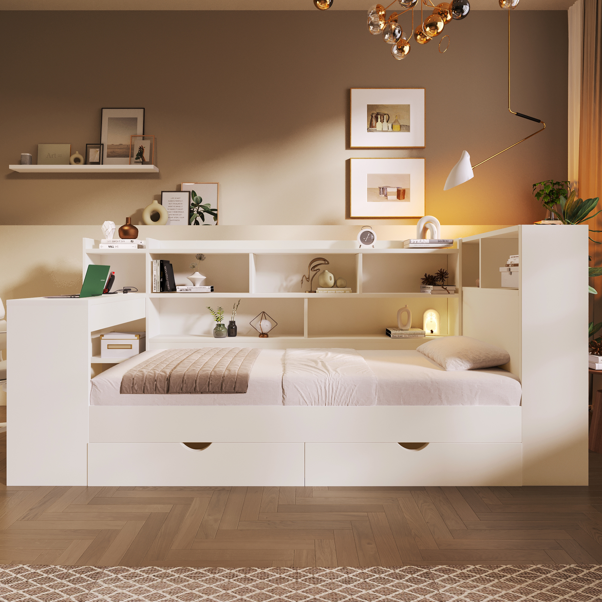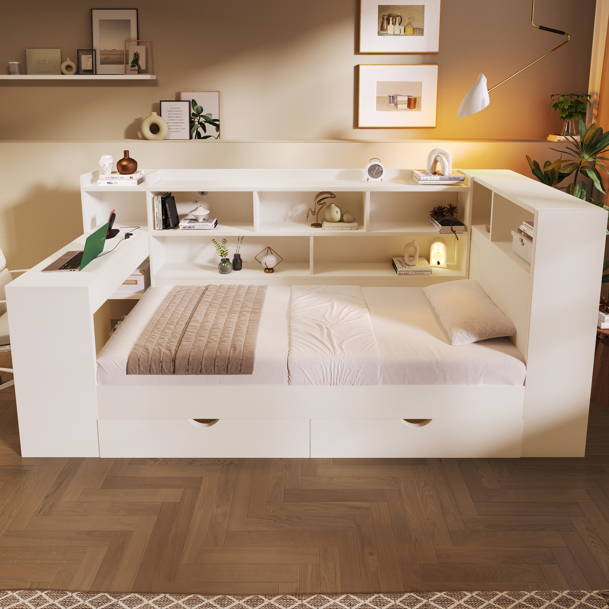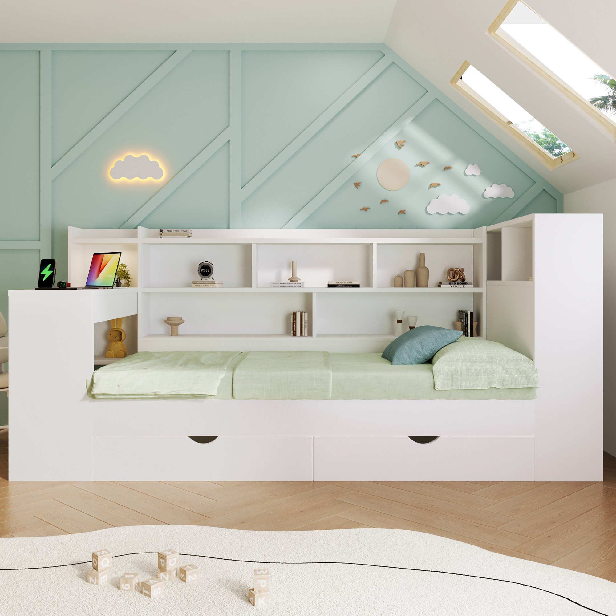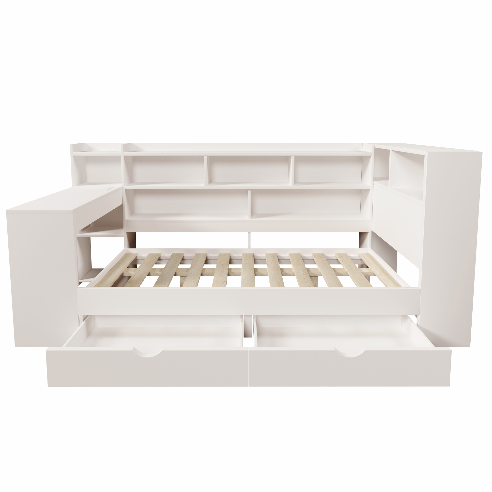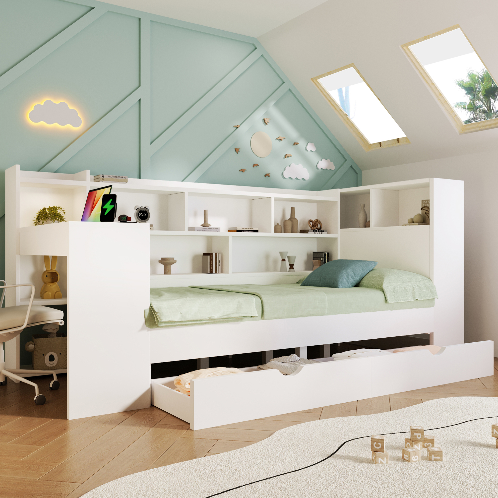 - 【Multi-functional All-in-One Design】This daybed combines a sleeping area, a work/study area, and storage space in one unit. It includes shelves, drawers, and a desk with charging ports. The charging ports include two UK standard sockets, one USB port, and one Type-C port. The modular design maximizes space utilization, making it an ideal space-saving choice for students and working professionals.