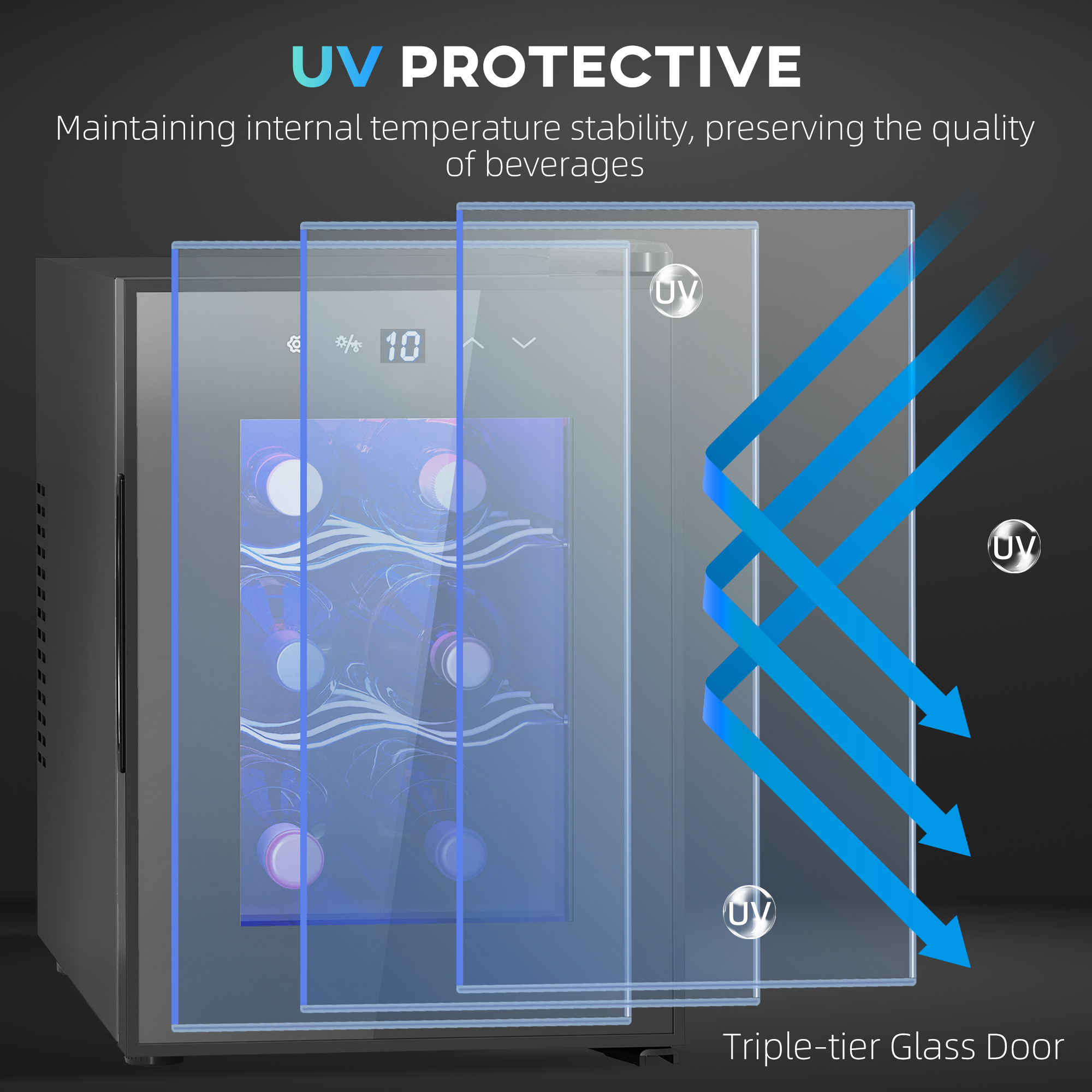 Chill your cherished bottles to perfection in this wine fridge. Two full-length chrome racks hold six bottles; also adjustable to fit larger bottles when needed. Adjust the temperature between 8-18℃ to find the coolness best for you. Complete with a triple glass door, which is also resistant to damaging UV rays.