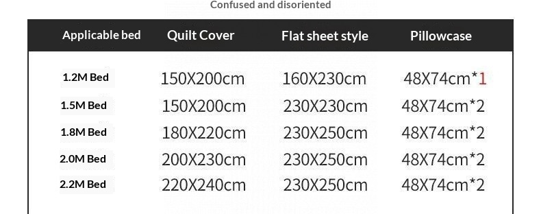 Size Specifications: 1.2 Rectangular Bed Sheet Three-Piece Set: Duvet Cover 1.5x2.0m; 1.5 Rectangular Bed Sheet Four-Piece Set: Duvet Cover 1.5x2.0m; 1.8 Rectangular Bed Sheet Four-Piece Set: Duvet Cover 1.8x2.2m; 2.0 Rectangular Bed Sheet Four-Piece Set: Duvet Cover 2.0x2.