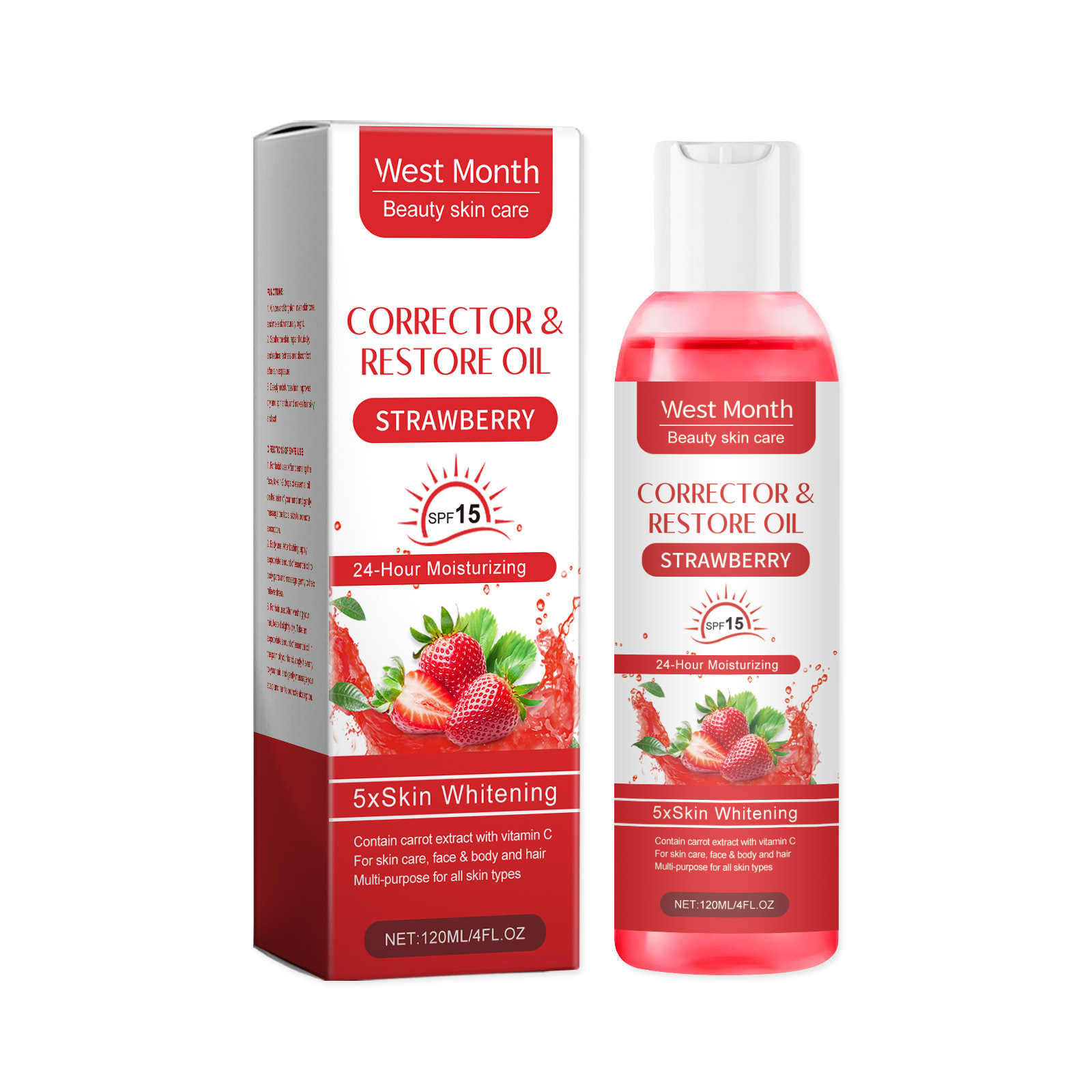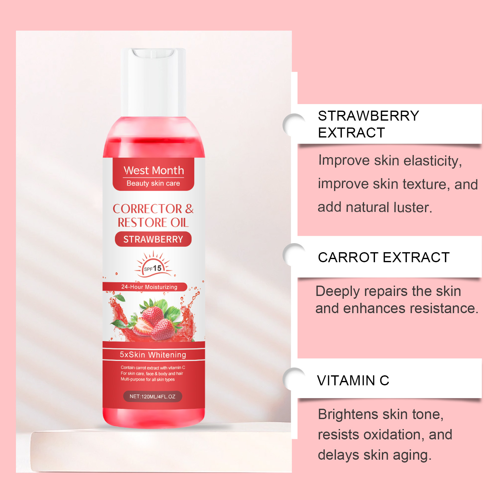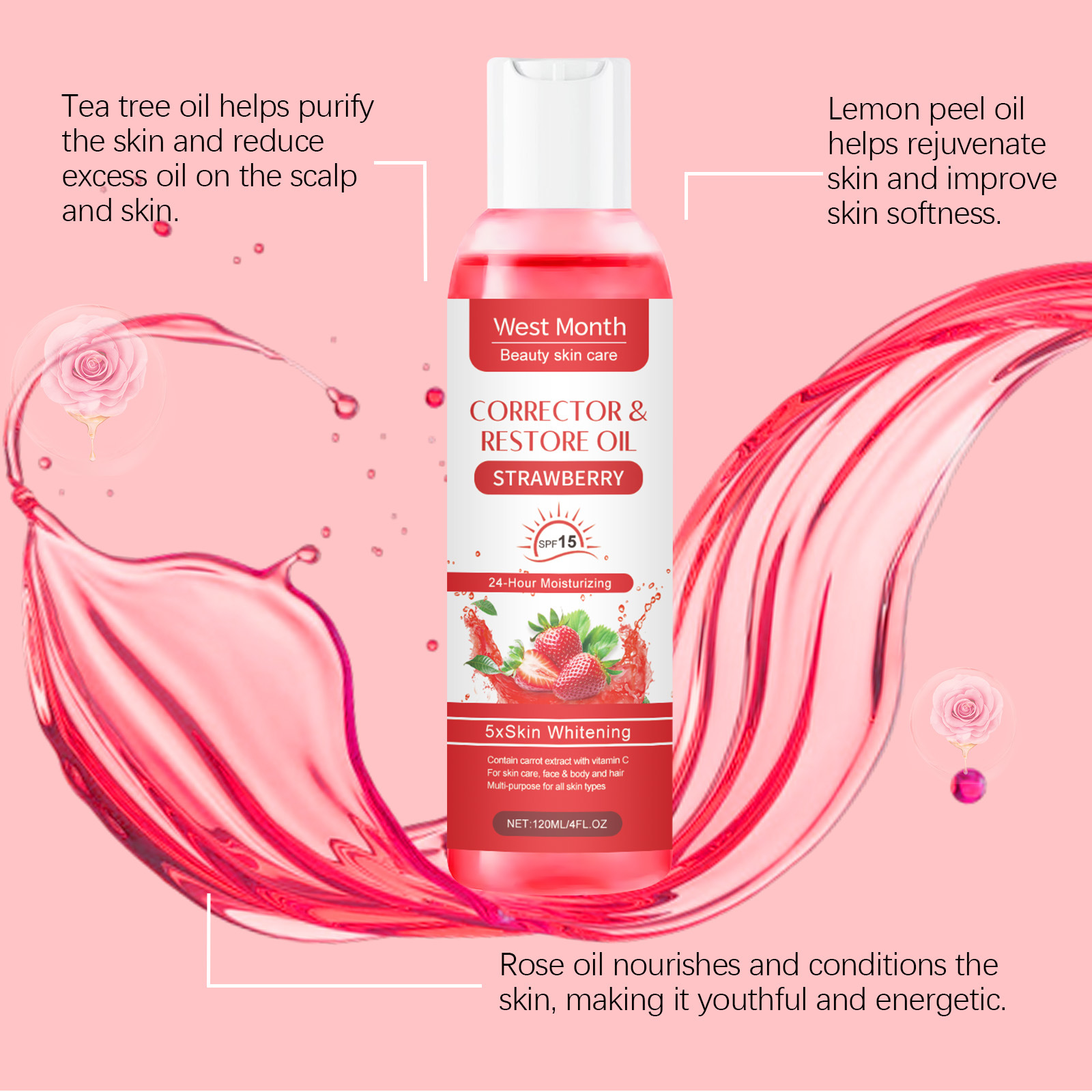 Ingredients: mineral oil, butylated hydroxytoluene, rose flower oil, tea tree oil, lemon fruit peel oil, strawberry extract, carrot extract, vitamin C