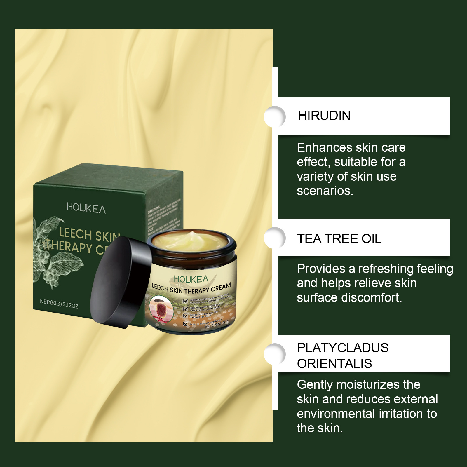 Ingredients: active ingredients: hirudin, tea tree oil, Chinese arborvitae twig inactive ingredients: water, glycerin, Glyceryl stearate, mineral oil, carbomer, triethanolamine, allantoin, salicylate