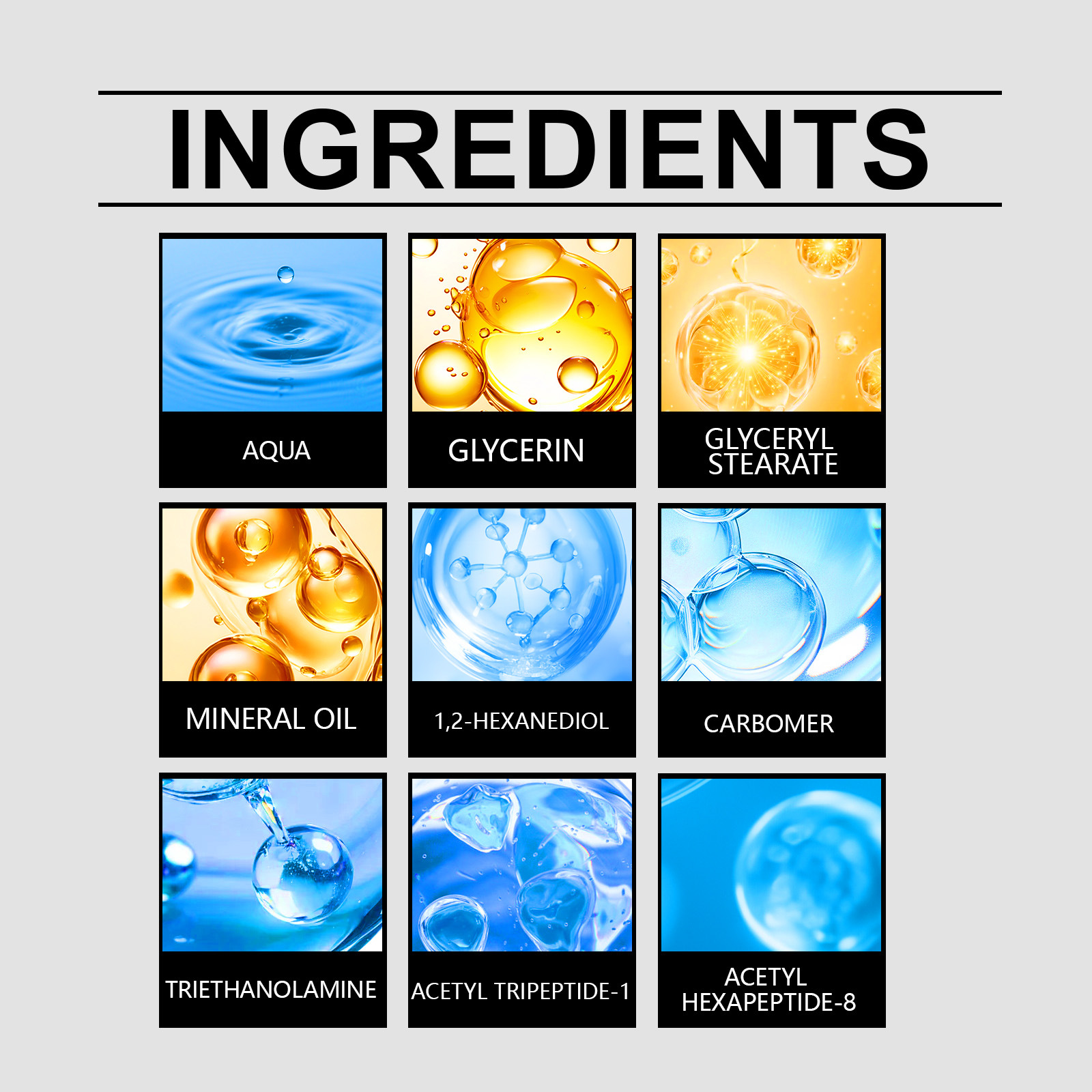 Ingredients: water, glycerin, glyceryl stearate, mineral oil, 1,2-hexanediol, carbomer, triethanolamine, acetyl tripeptide -1, acetyl hexapeptide -8.