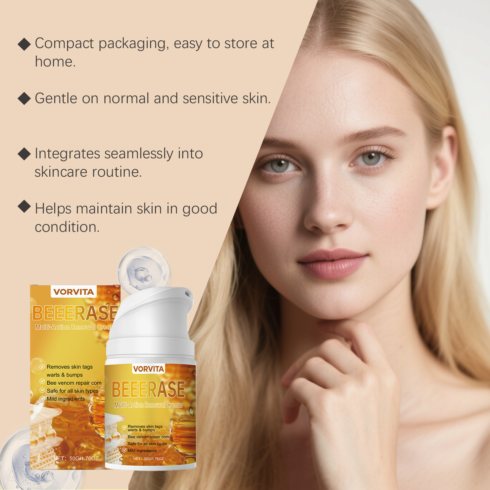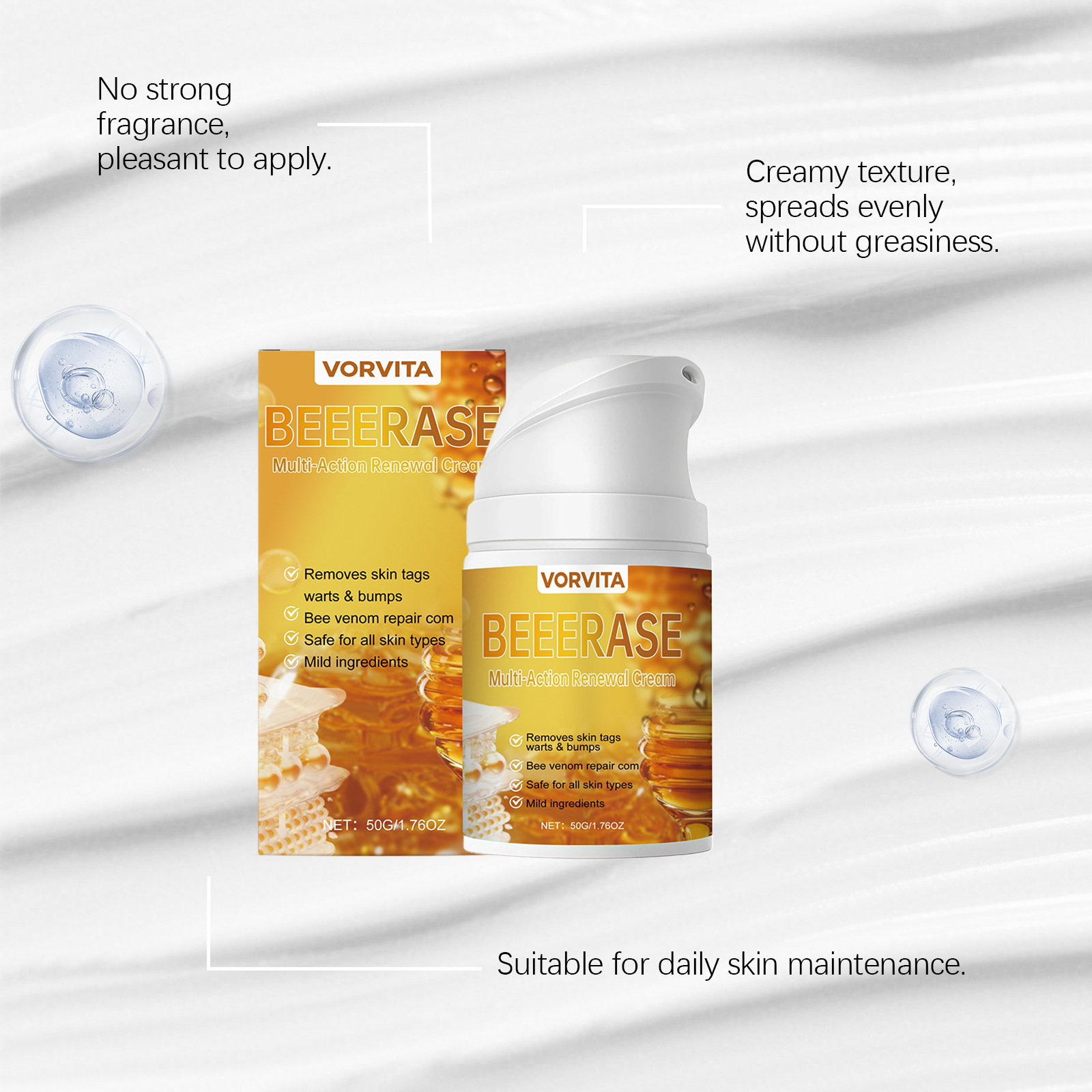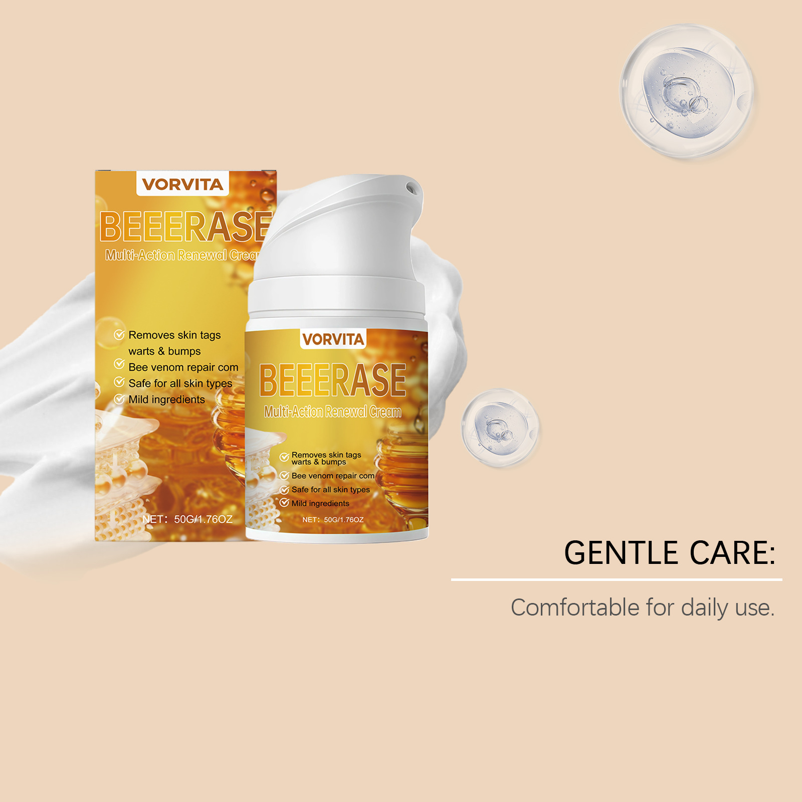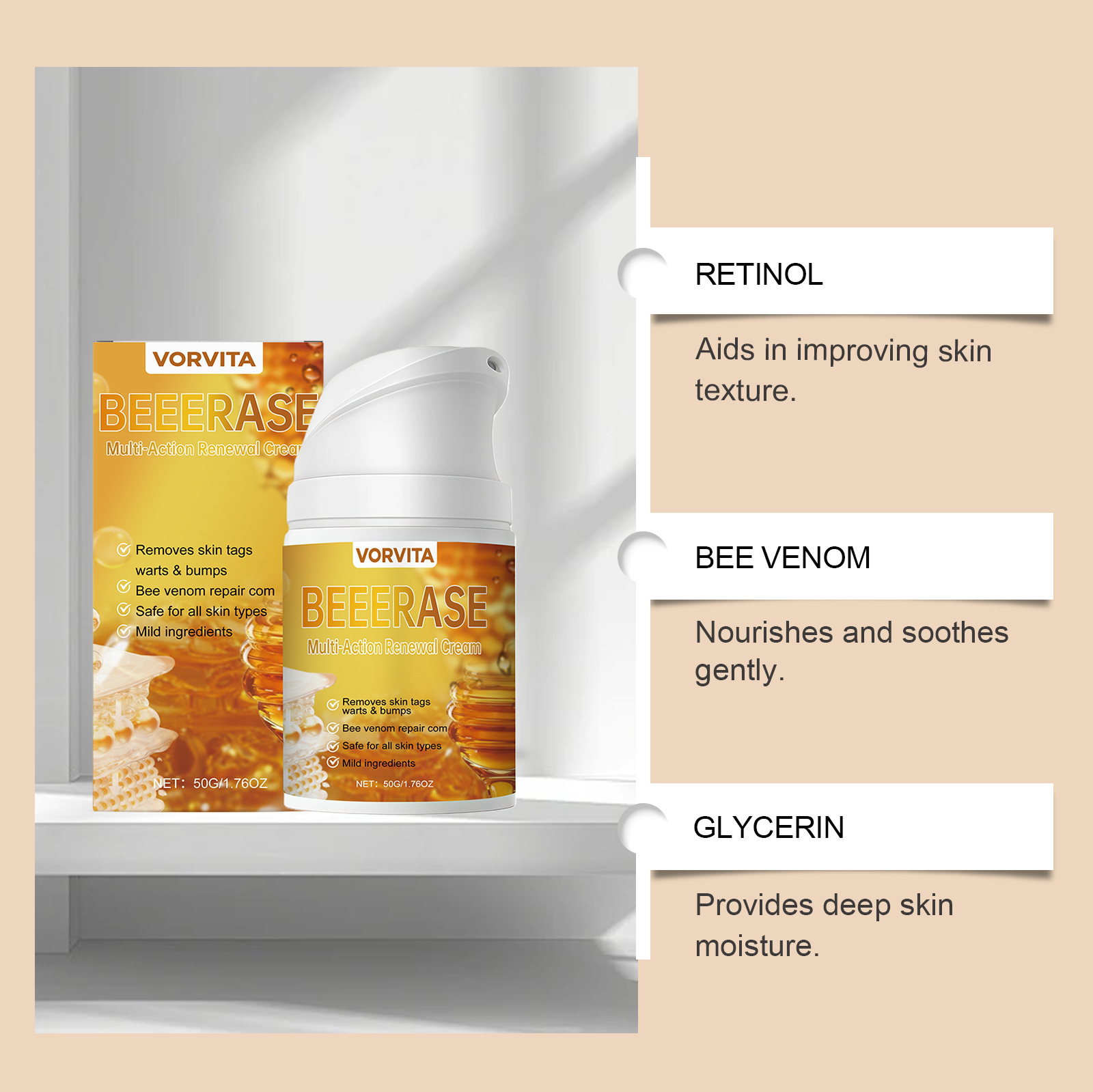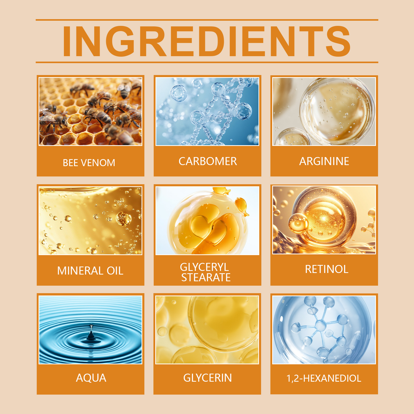 Ingredients: water, mineral oil, glycerin, glycerol stearate, 1,2- hexanediol, carbomer, arginine, allantoin, bee venom.