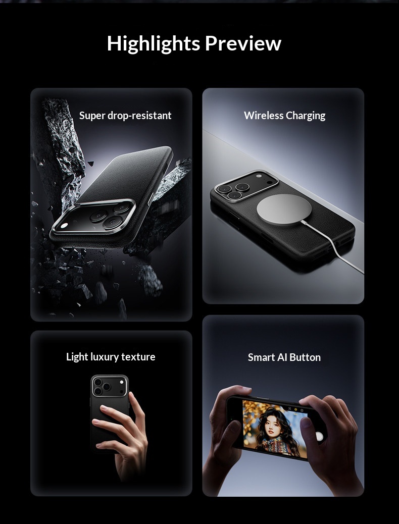 Trendy features: One-piece solid-color genuine leather strap paired with an AI button—supports GD wireless charging and functions as a drop-resistant phone back cover