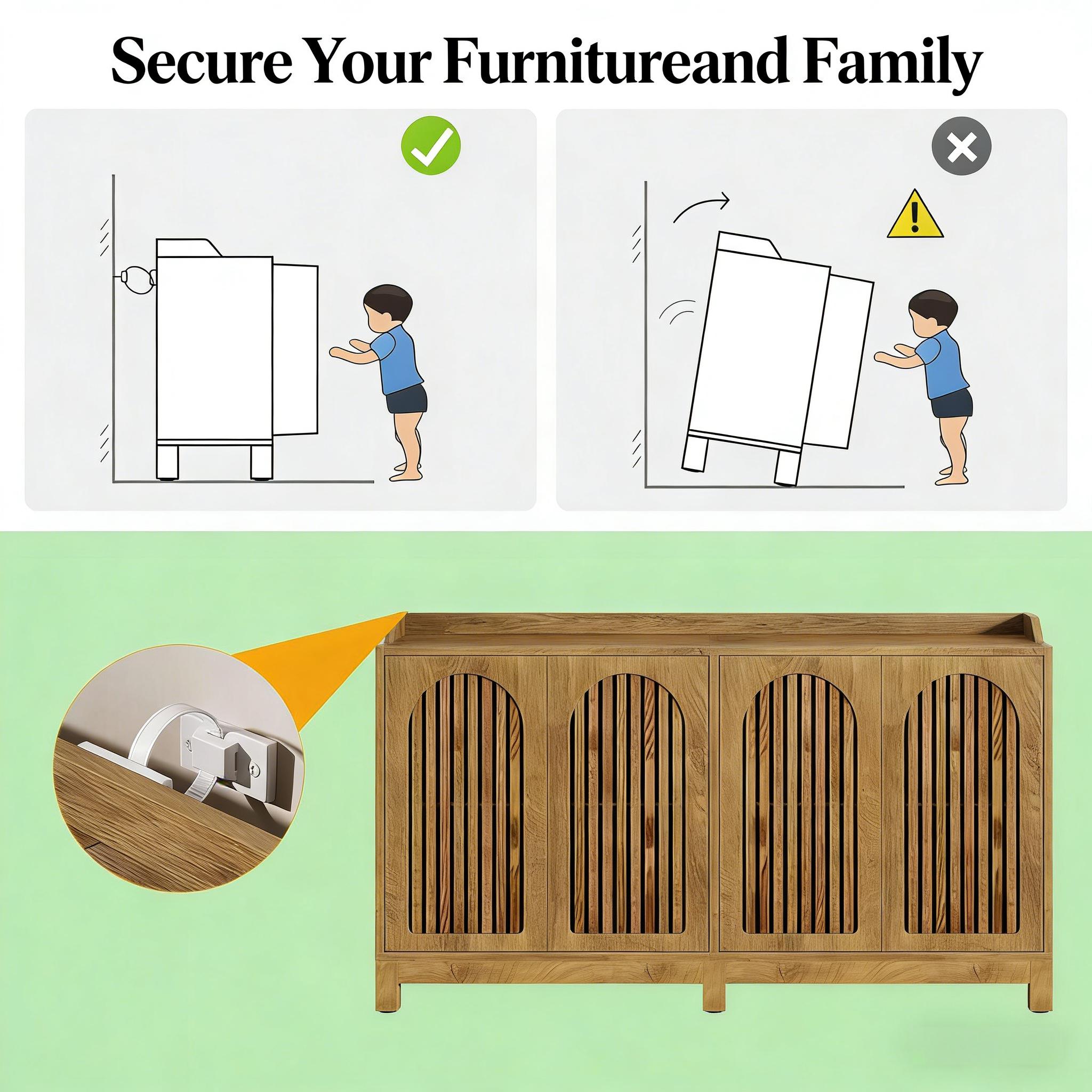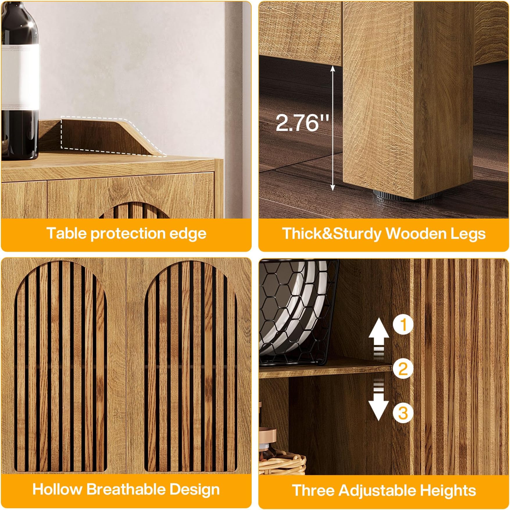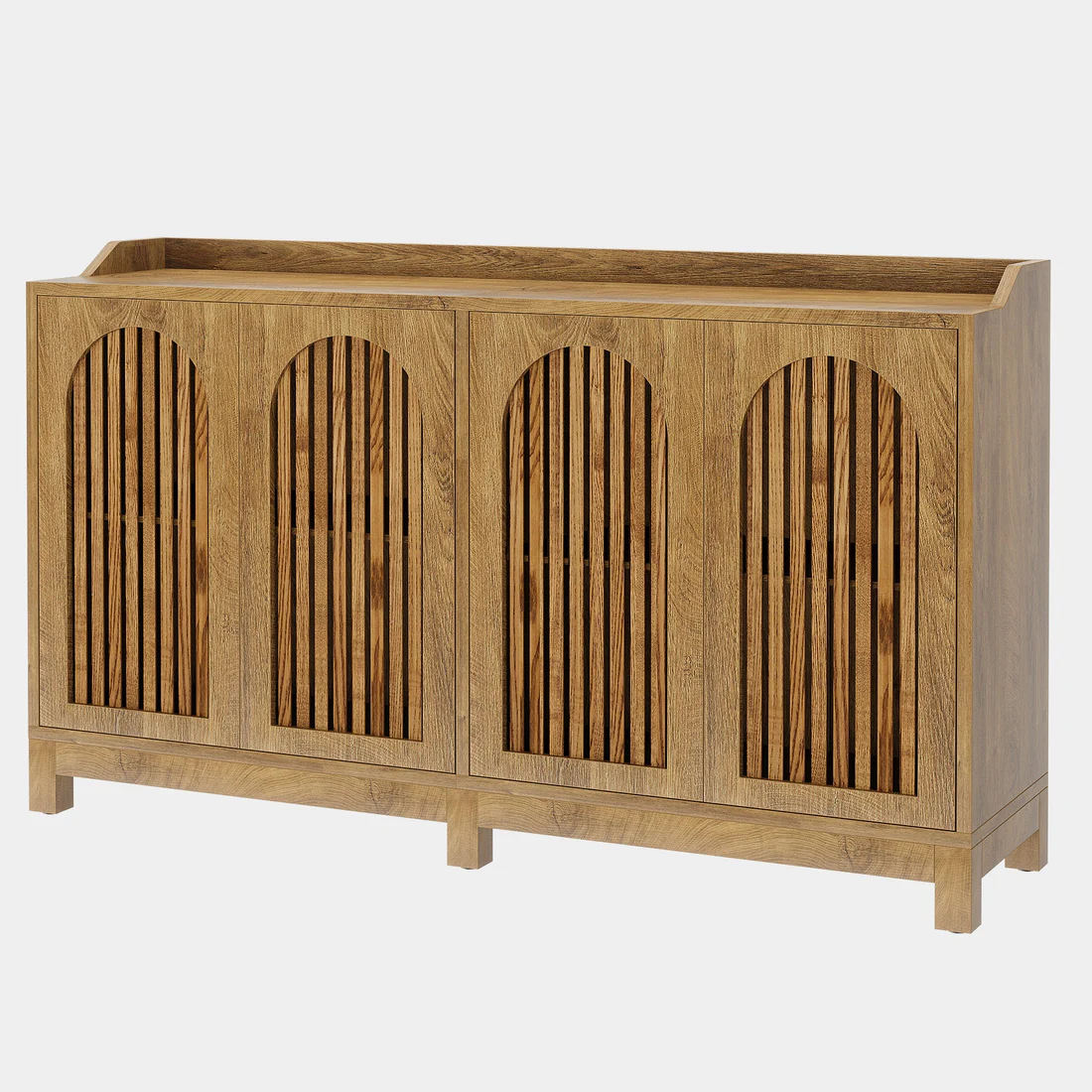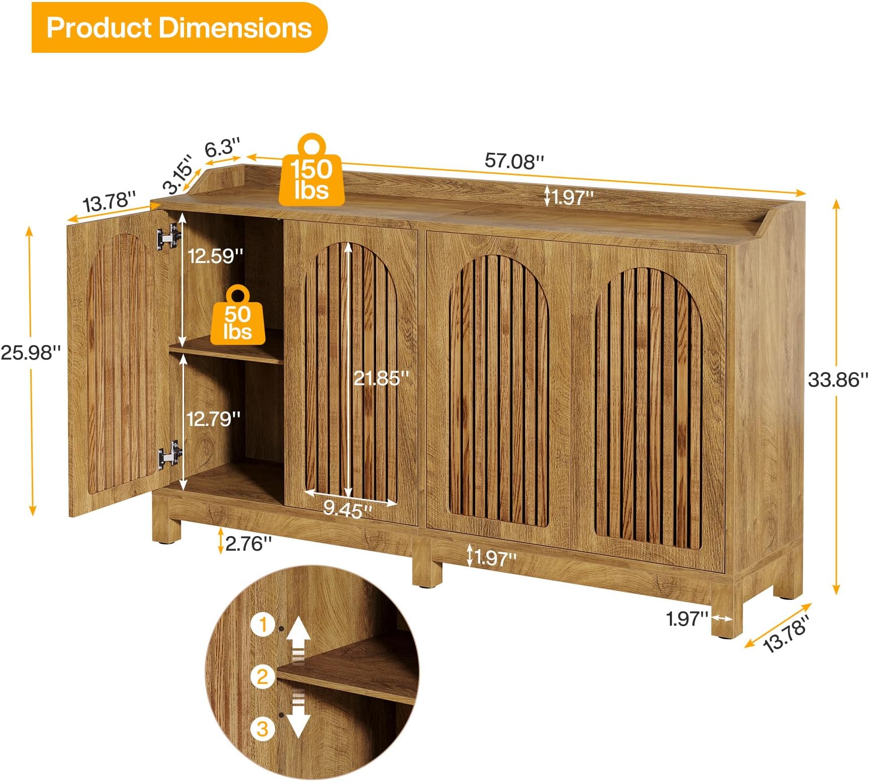 Important Reminder!!! 1) Attention: All products in our store do not support Canada self pickup ordering. Please do not create shipping labels for Canada. Our American products do not support self pickup to Canada 2)We do not ship to Alaska, Hawaii, US protectorates (e.g., Puerto Rico), P.O. boxes, or APO/FPO addresse 3)We don’t accept non-defective remorse returns Vintage Shutter Doors - Our buffet sideboard boasts a stylish brown wood grain surface and shutter doors, offering a touch of vintage elegance to your interior. Not only aesthetically pleasing, the shutter door design ensures ventilation, making our sideboard cabinet the most practical and stylish choice. Optimal Storage Solution - With dimensions measuring 57"L x 13.77"W x 33.4"H, our buffet features a four-door cabinet and combines a spacious tabletop with ample internal storage space. From storing dinnerware, wine bottles, cutlery, to other essentials, this buffet cabinet is the ultimate solution to your storage needs. Adjustable Shelves & Spring-Loaded Doors - Equipped with internal spring-loaded doors, this farmhouse storage cabinet ensures easy operation. Its adjustable shelves further enhance functionality, enabling you to customize storage divisions to suit your needs. Premium Quality Construction - Our wood sideboard cabinet is crafted from high-quality MDF and supported by solid wood legs to ensure durability and sturdiness. Its structure makes it an ideal stand for microwaves, blenders, mixers, and coffee machines, distancing the cabinet from the floor to avoid moisture. Easy Assembly & Support - The cabinet arrives with a comprehensive instruction manual and all necessary hardware, ensuring an effortless assembly. In case of queries, our customer support is available round-the-clock to provide immediate solutions.