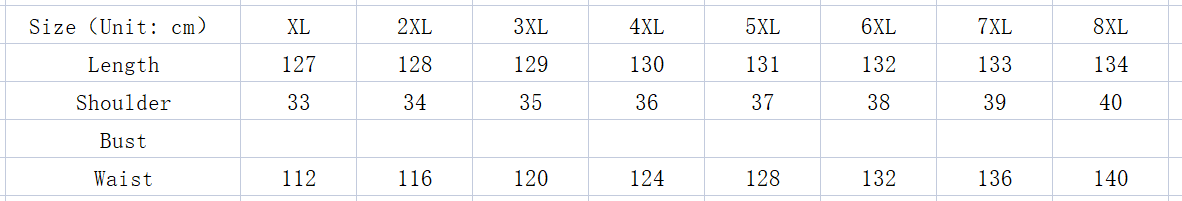 Dimensions: XL,2XL,3XL,4XL,5XL,6XL,7XL,8XL.