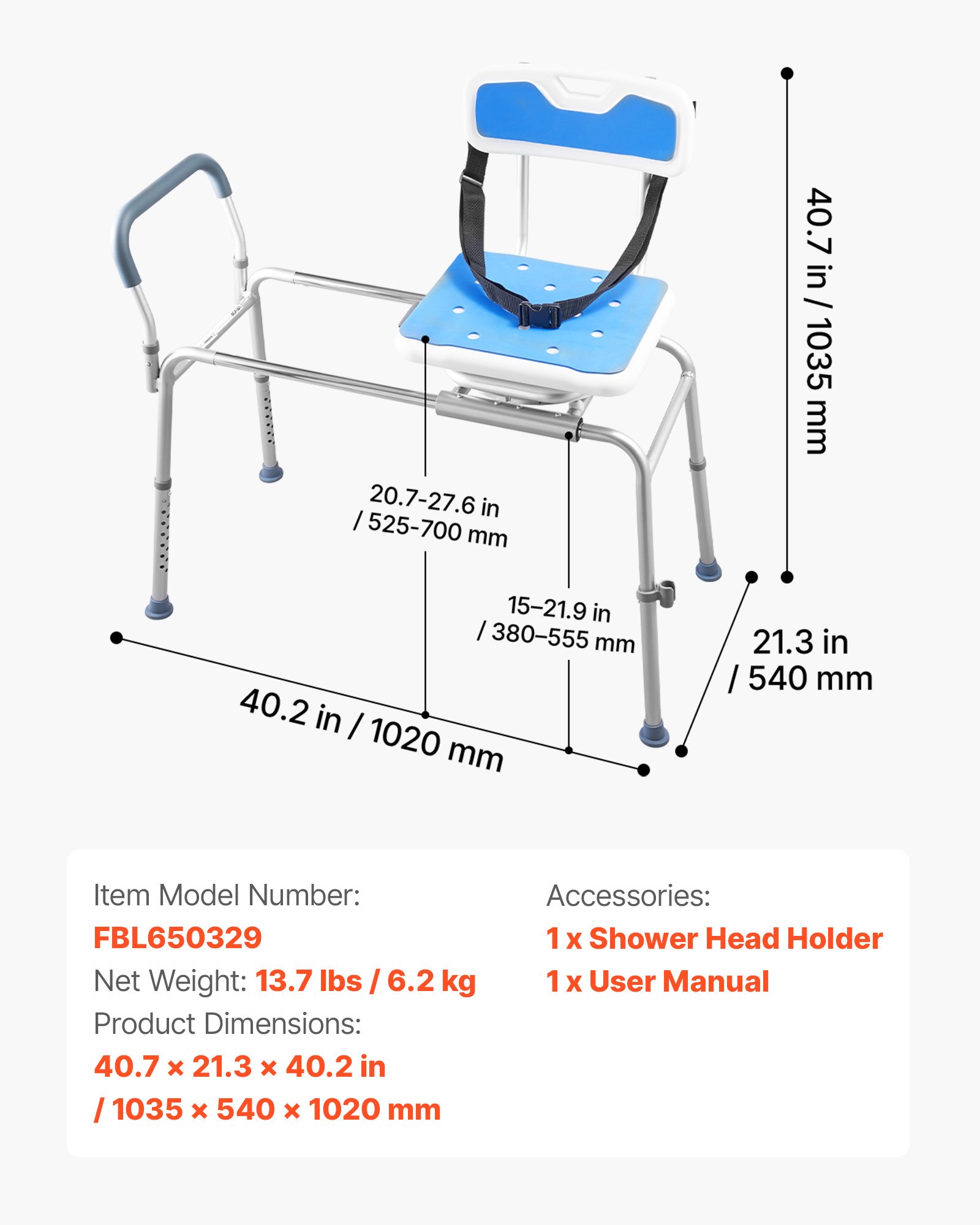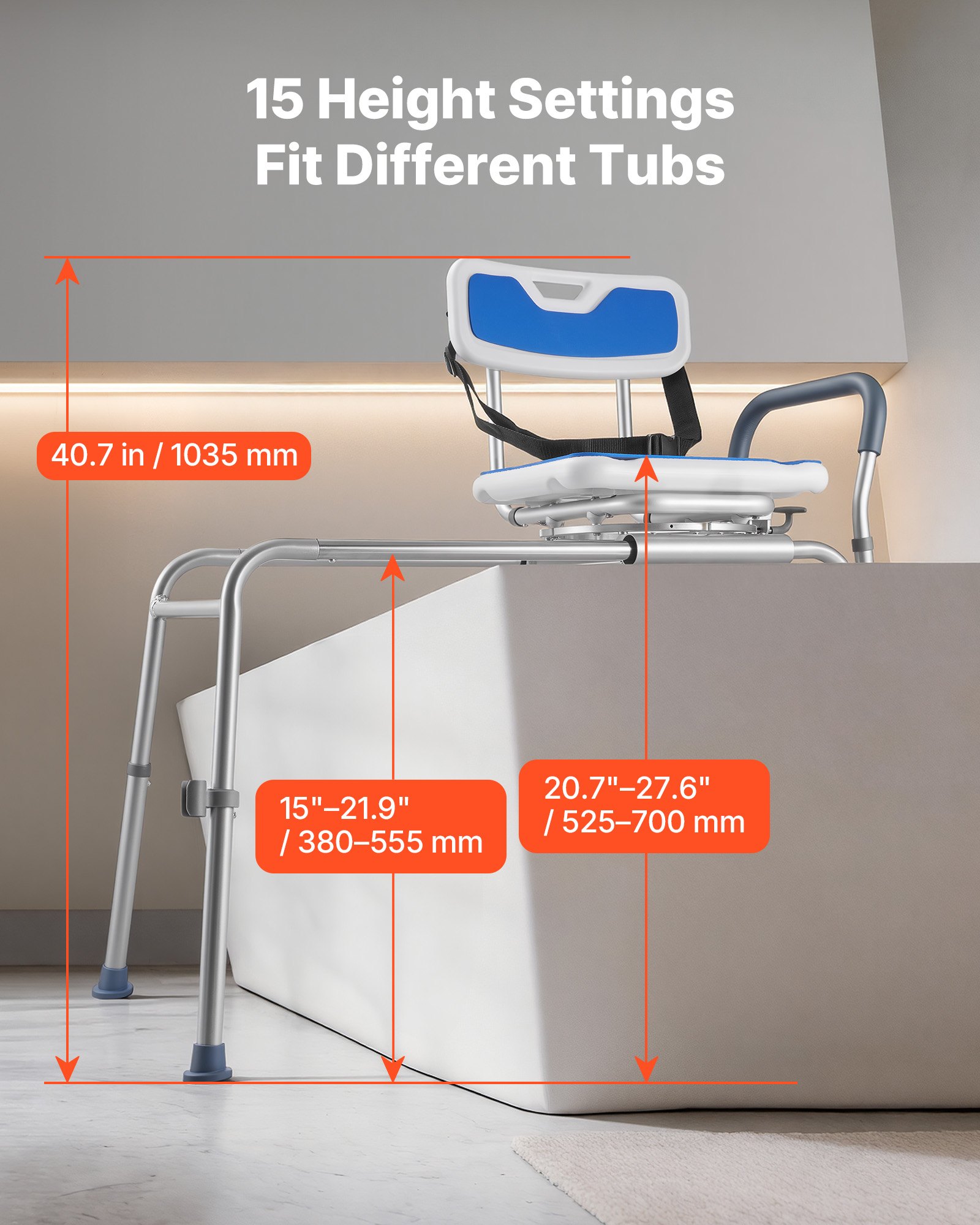 Adjustable Height: Our tub transfer bench provides 15-level push-button height adjustment. Seat-to-floor height ranges from 15" to 21.9" (380–555 mm), suitable for different user heights and bathtubs. Not for tubs over 21.9" (555 mm) or claw-foot tubs