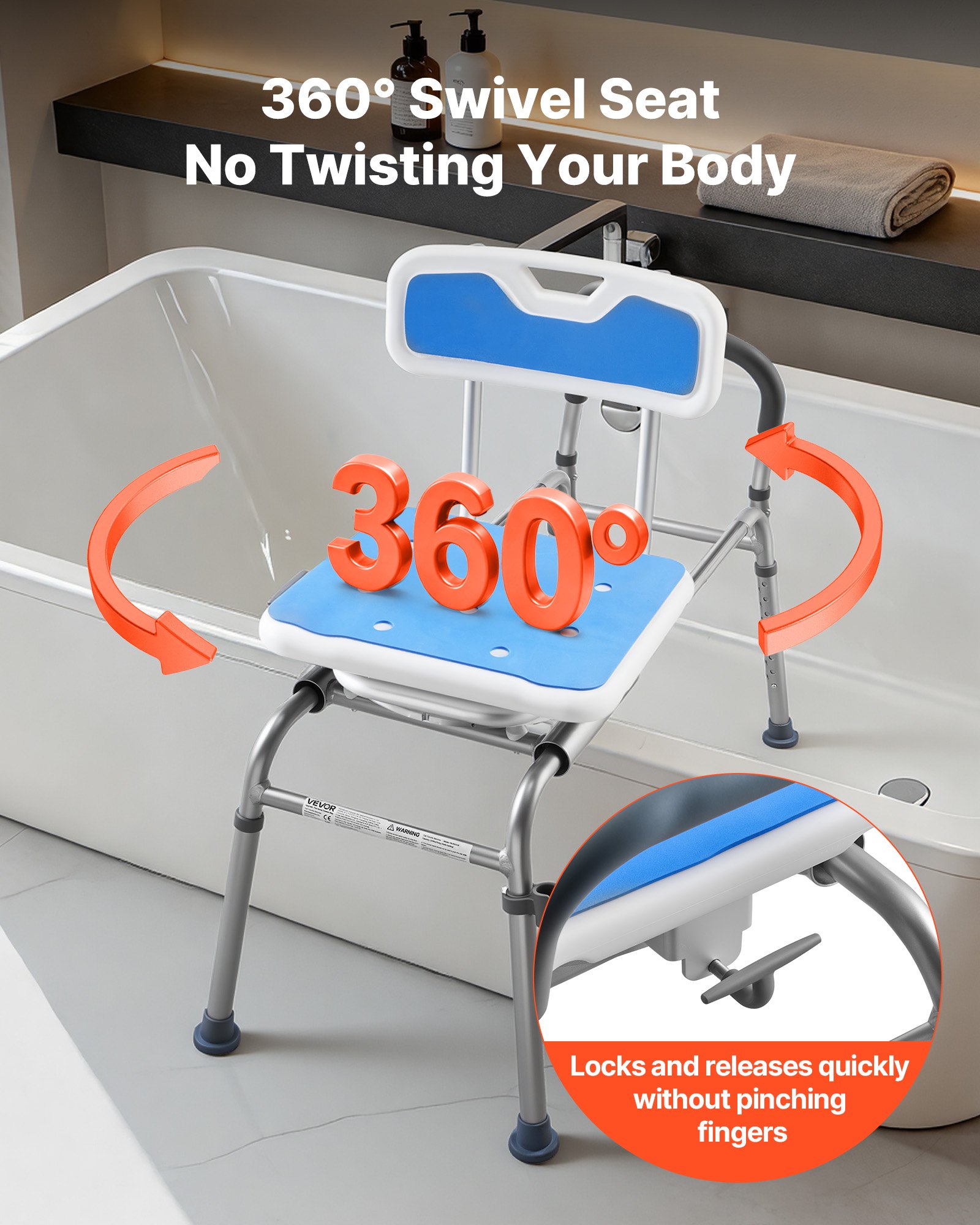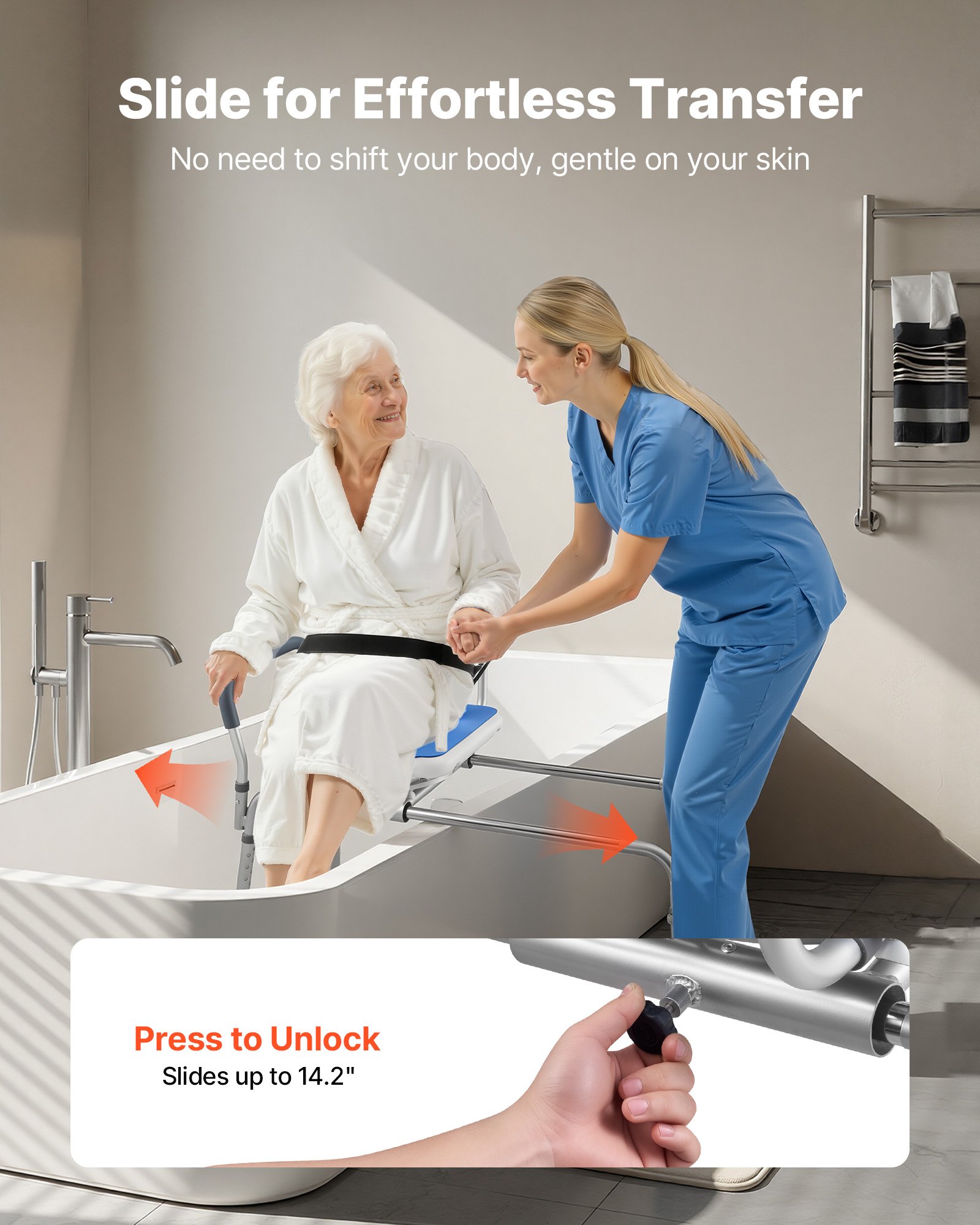 Slide & Swivel Chair: This shower chair combines smooth sliding movement with 360° swivel rotation. A quick-release mechanism allows fast adjustment of the seat position and direction, helping you enter and exit the tub without shifting your body