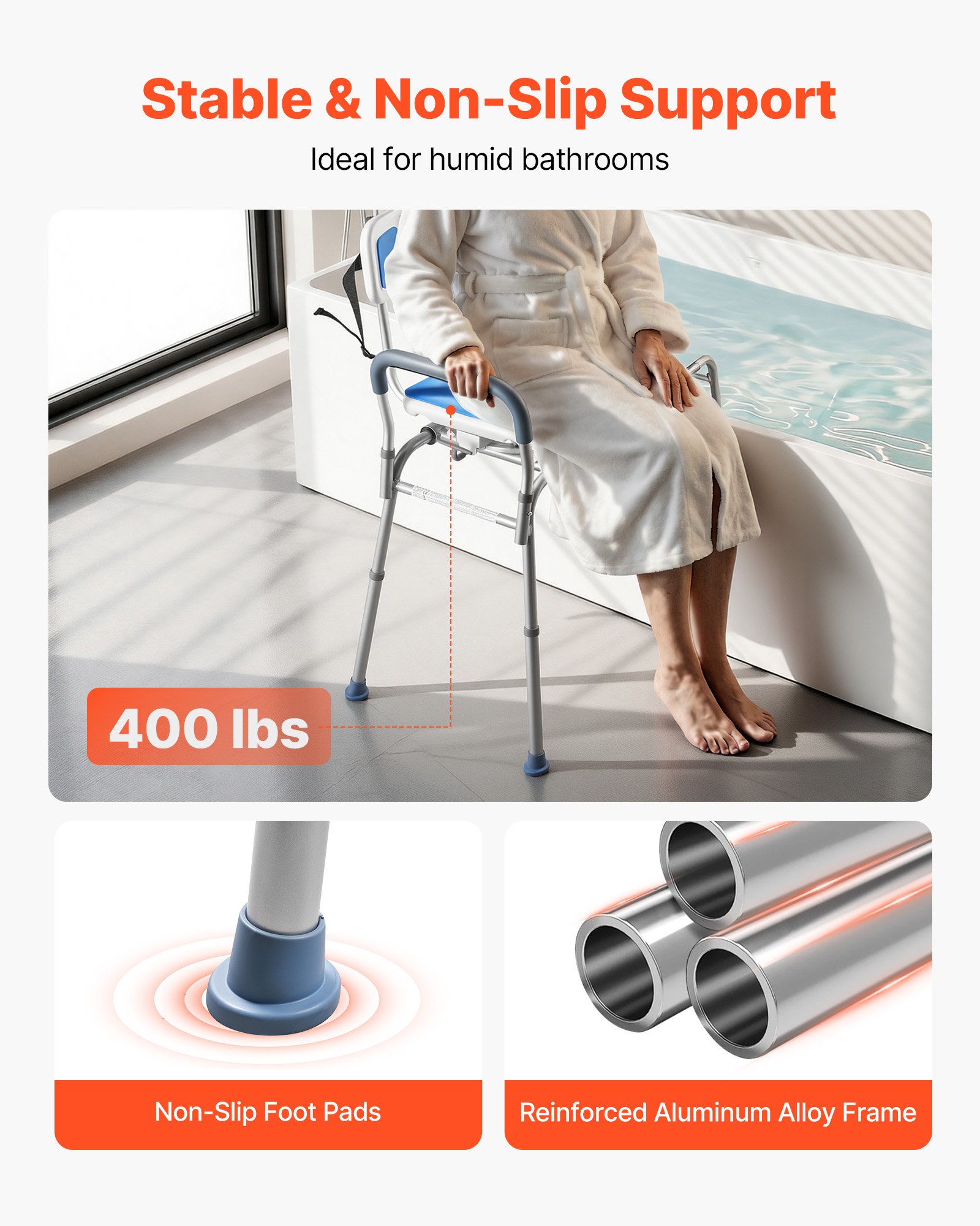 400 lbs Heavy-Duty Capacity: The shower transfer bench is built with thickened aluminum alloy for enhanced stability. It supports up to 400 lbs (180 kg) static load and features four non-slip base feet for steady, wobble-free seating