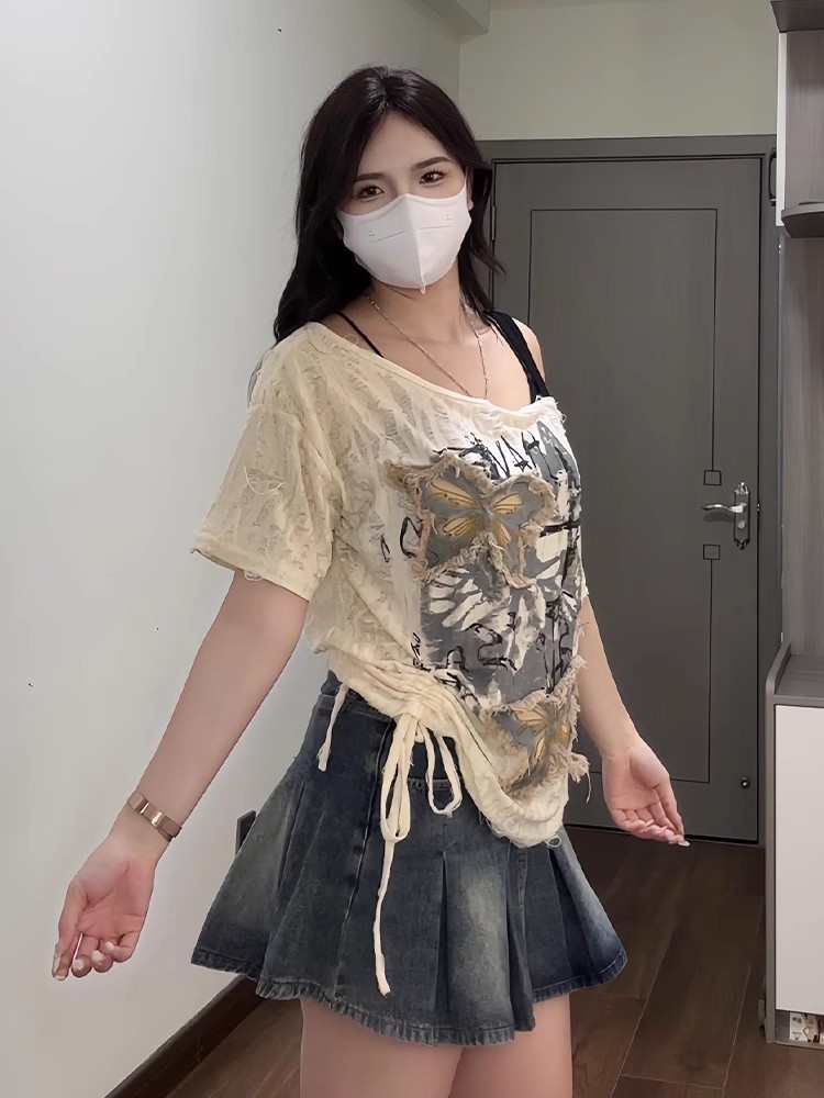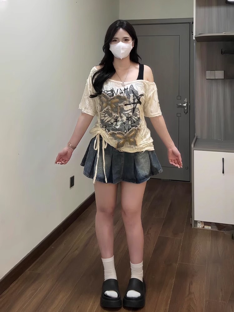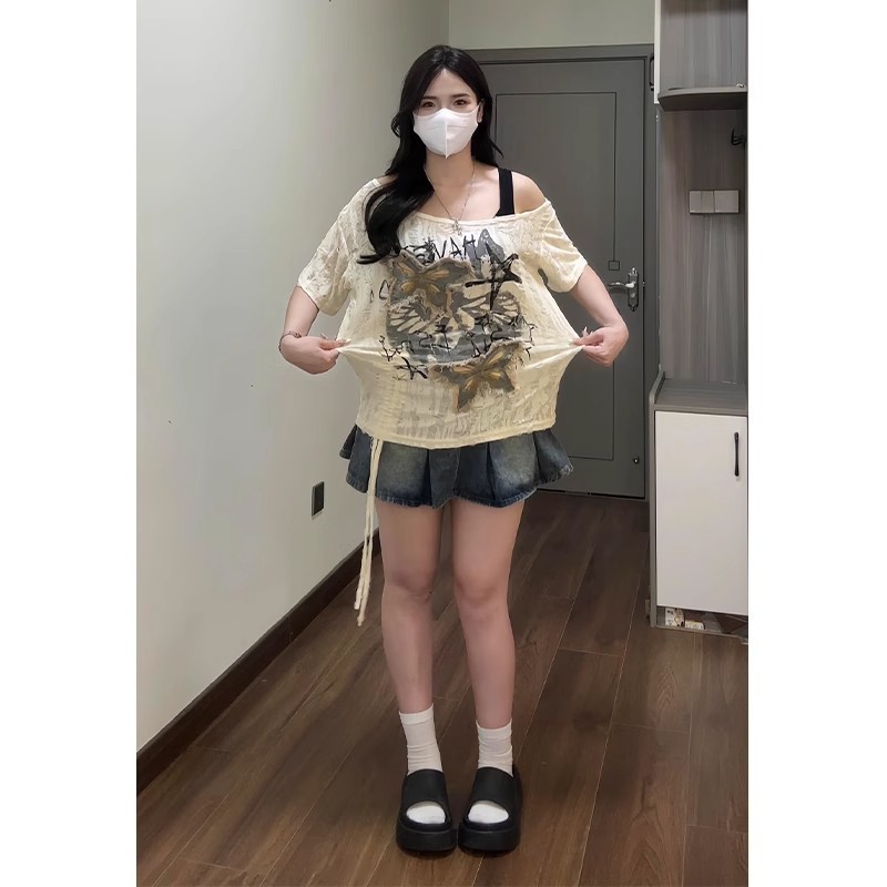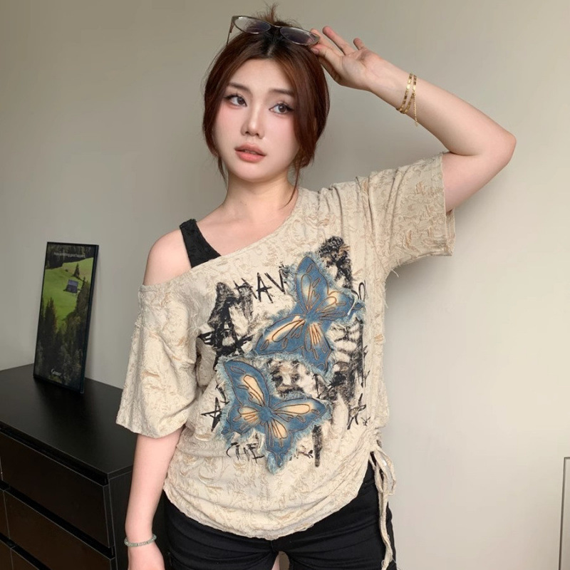 Slightly Fat Beautiful Butterfly Oblique Shoulder Tops Loose Short Sleeve