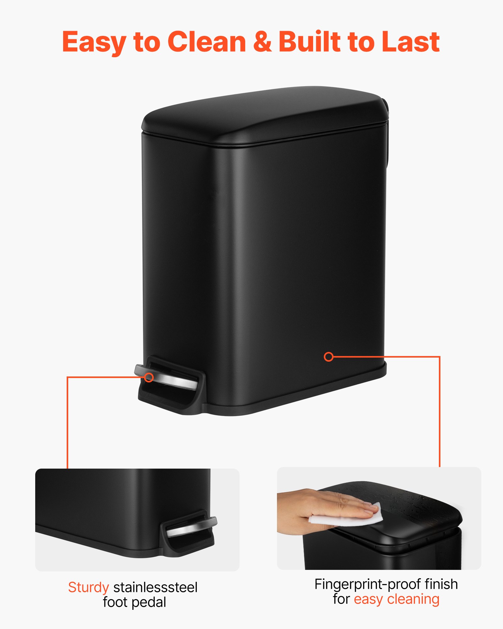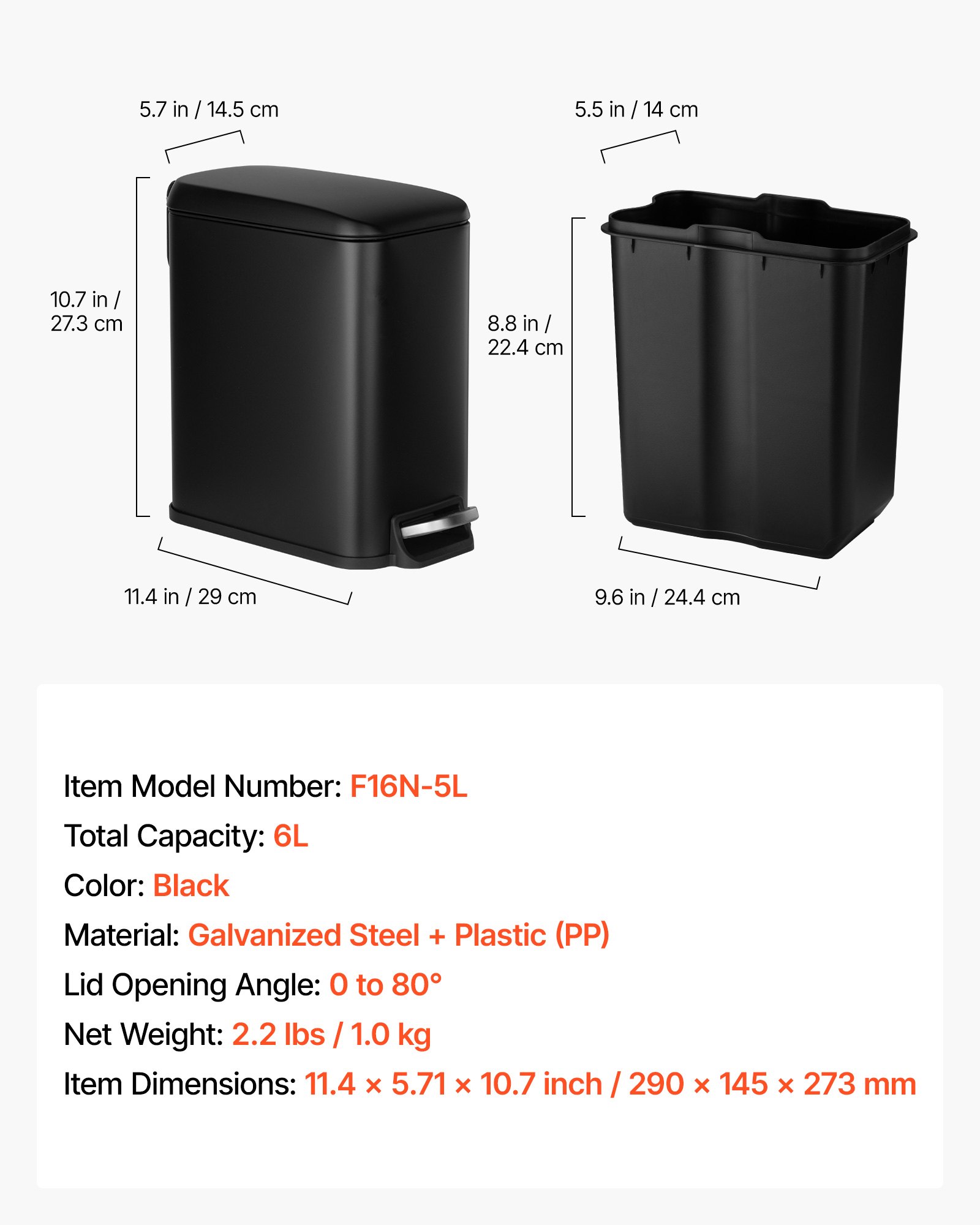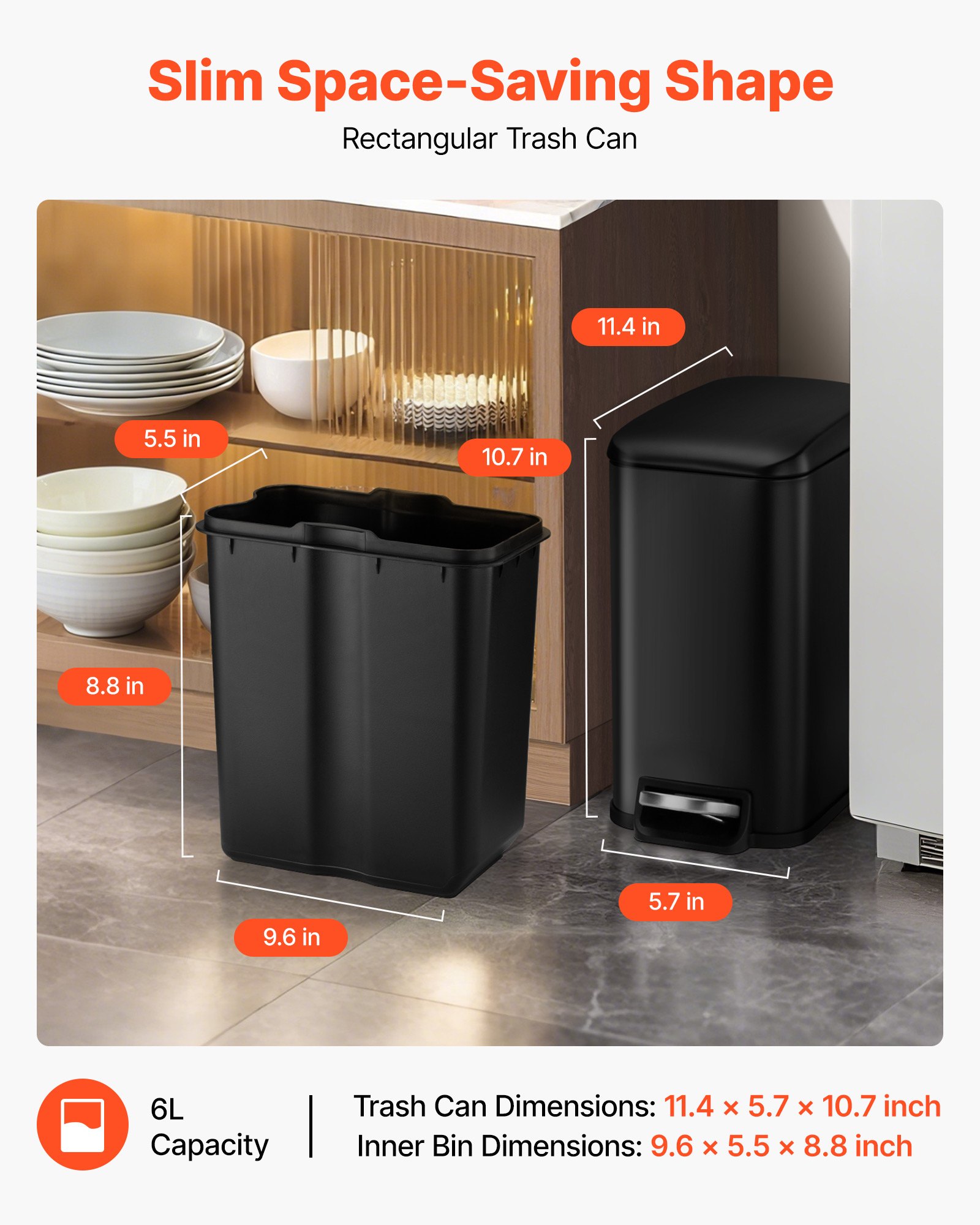 Slim Bathroom Trash Can, 11.4 X 5.71 X 10.7 Inch Small Bedroom Trashcan With Step Pedal & Soft Close Lid, 6L Steel Garbage Can With Detachable Inner Bin, For Kitchen, Home, Dorm, Office, Black