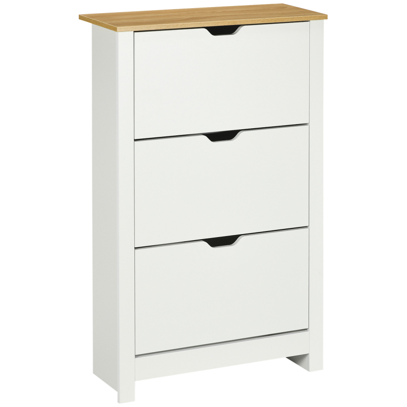 This compact shoe cabinet from will help to keep your home effortlessly decluttered. A particle board construction ensures a tough and solid frame, with a smooth coating so it can be cleaned easily. Each drawer features a two-level shelf - holds up to 9-18 pairs of shoes. Groove handle to open and close easily. Complete with a flat tabletop for extra holding and display space, with feet to keep the unit balanced.