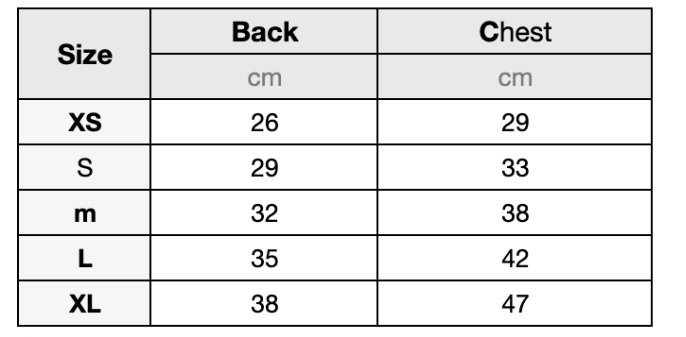 Size: xs Chest 30 back 20 (1-2 pounds), s Chest 35 back 25 (3-4 pounds), m Chest 40 back 30 (5-7 pounds), L Chest 45 back 35 (8-9 pounds), XL Chest 50 back 40 (10-13 pounds)