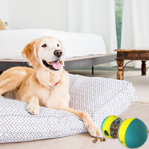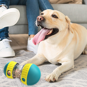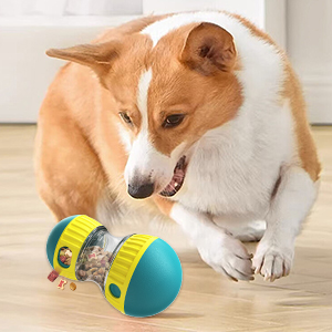 FOOD DISPENSER - The toy, an interactive dog toy for boredom and puppy puzzle, has differently sized spheres at both ends. As dogs push the toy, it moves within a fixed area, allowing dogs to continuously chase and play with it. During movement, food is dispensed from the food holes on both sides of the toy. Your furry friend gets smarter as they play with this dog treat puzzle, learning how to roll the ball to get dog treats to fall out. It's one of the best dog toys to keep them busy.