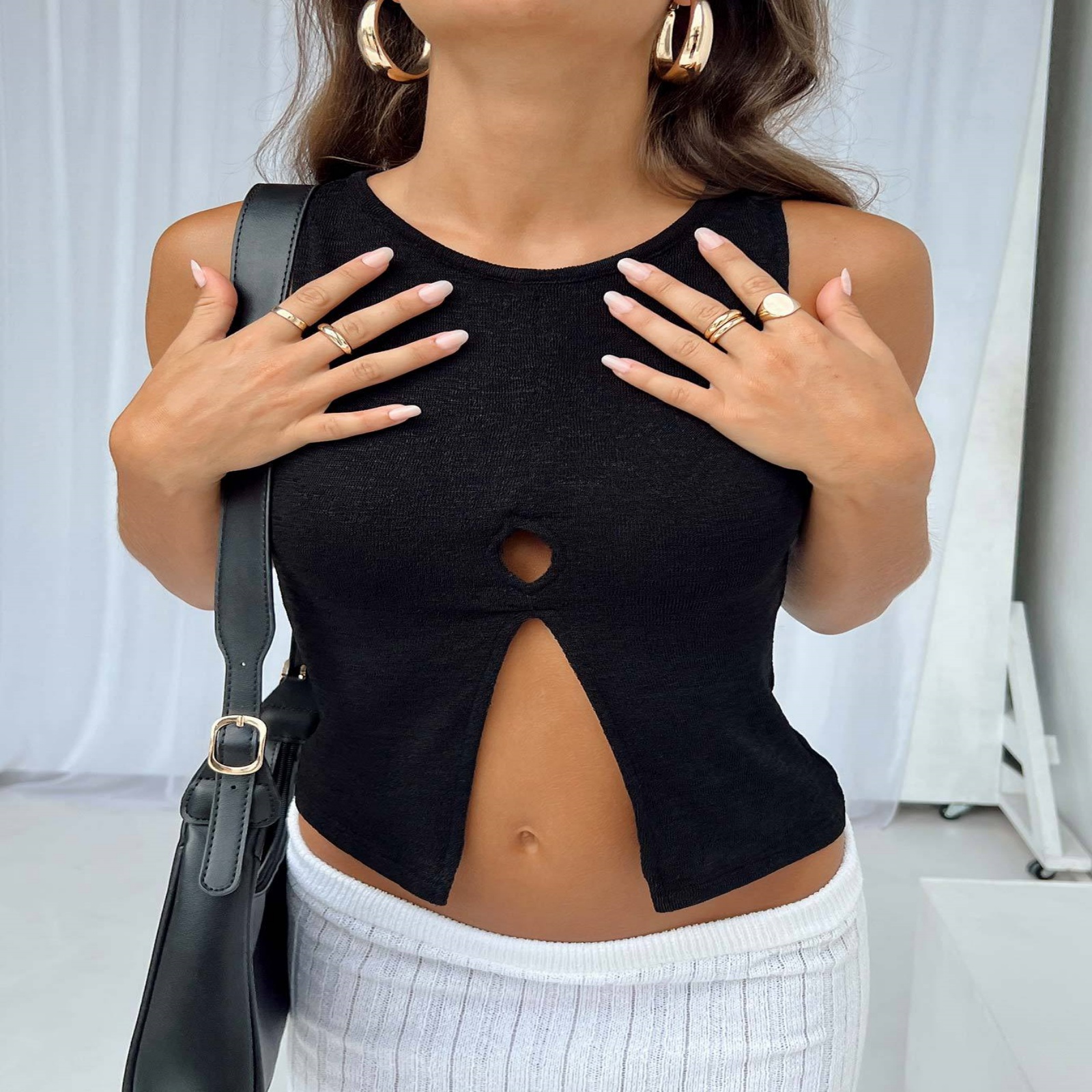 Slub Cotton Hollow-out Split Vest Bottoming Shirt