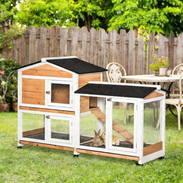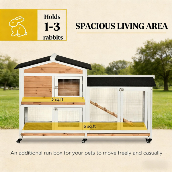 Features: - Solid fir wood frame and asphalt roof made for outdoor use - Steel wire fencing to provide ventilation - Equipped with wheels for easy moving - Ramp allows rabbits to enter the raised housing area quickly - Removable bottom sliding trays under the main house for easy cleaning - Multiple lockable doors for you to easily take care of your animals - Suitable for 1-3 rabbits - Assembly required Specification: - Color: Yellow, Black, White - Material: Fir, Steel, Asphalt - Overall Size: 62" L x 20.75" W x 39.25" H - Living House Size: 29.25" L x 18" W x 20" H - Door Size: 11.75" L x 10.25" W (main house), 11.75" L x 9.75" W (run box under the main house), 11.5" L x 18.75" W (side run box) - Run Box Size: 28.25" L x 18" W x 13.75" H (under the main house) - Run Box Size (side): 28.25" L x 18" W x 24.75" H - Ramp Size: 24" L x 5.75" W - Floor area: 7.17 sq.ft, 57.75" L x 18" W - Suitable for 1-3 rabbits