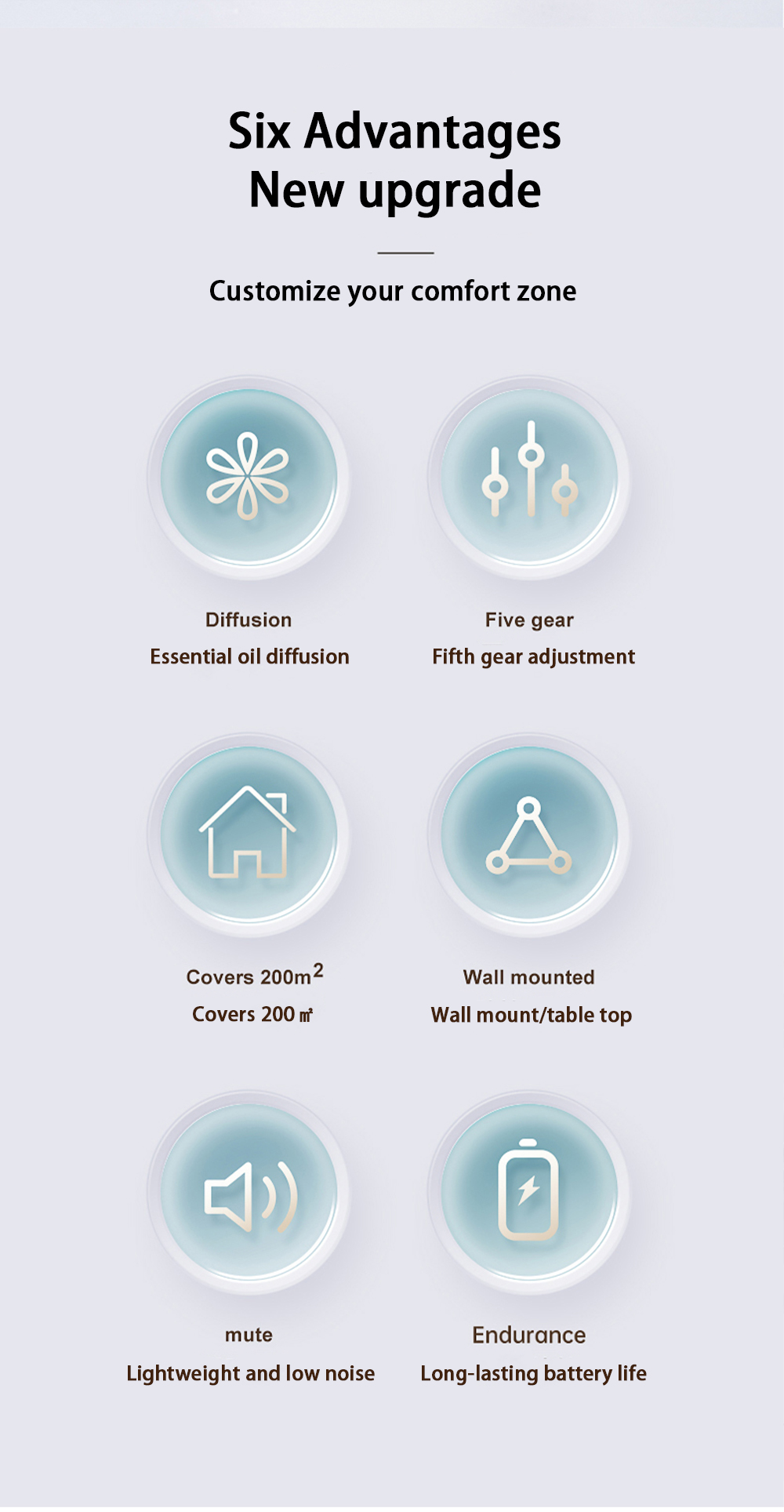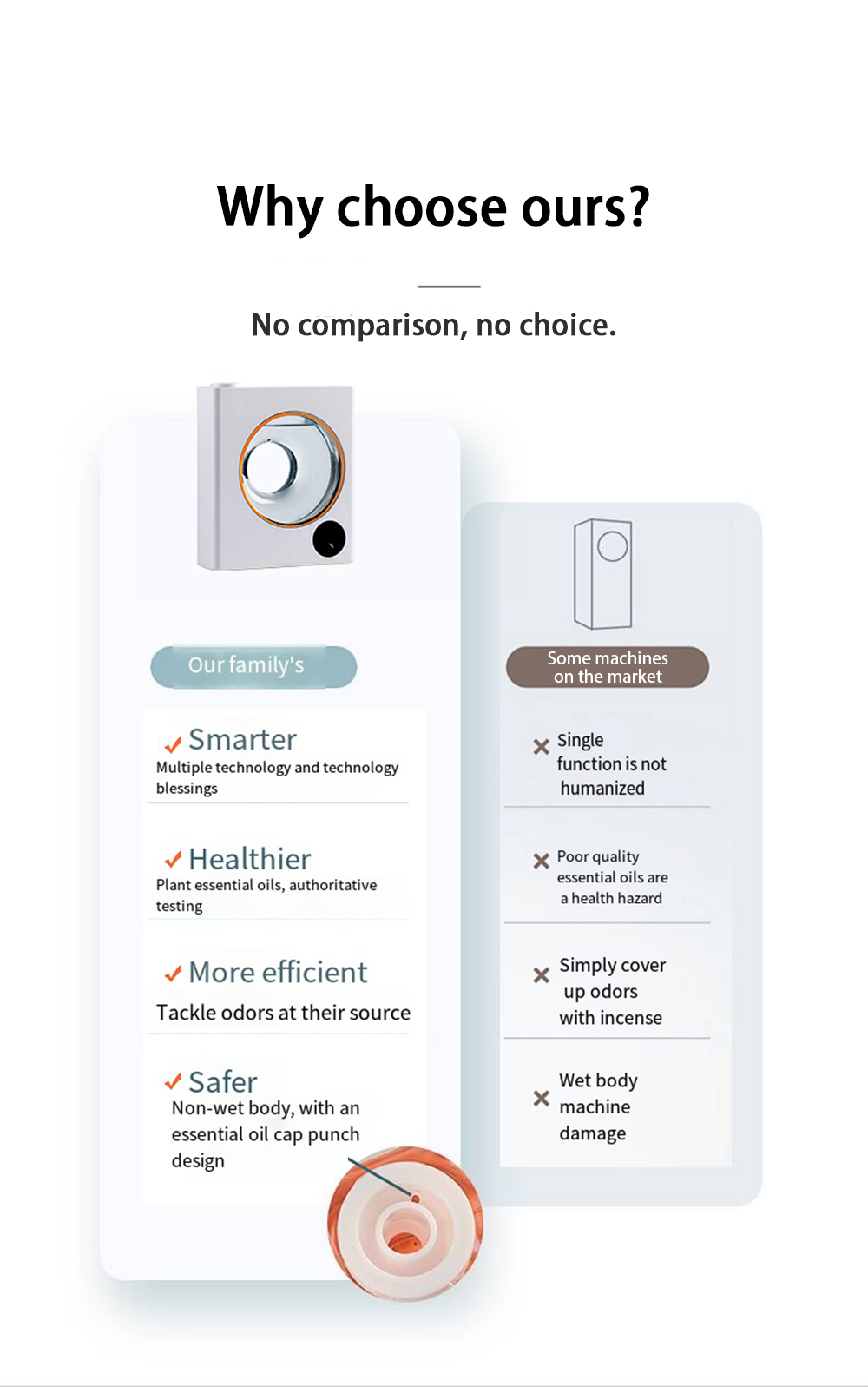 Bring a continuous and comfortable aroma experience to your home or commercial space. Our small automatic aromatherapy spray adopts wall mounted design to provide high-quality aromatherapy service for your family, hotel or office. Whether it's relaxing the body and mind or enhancing the environmental atmosphere, it can meet your needs.