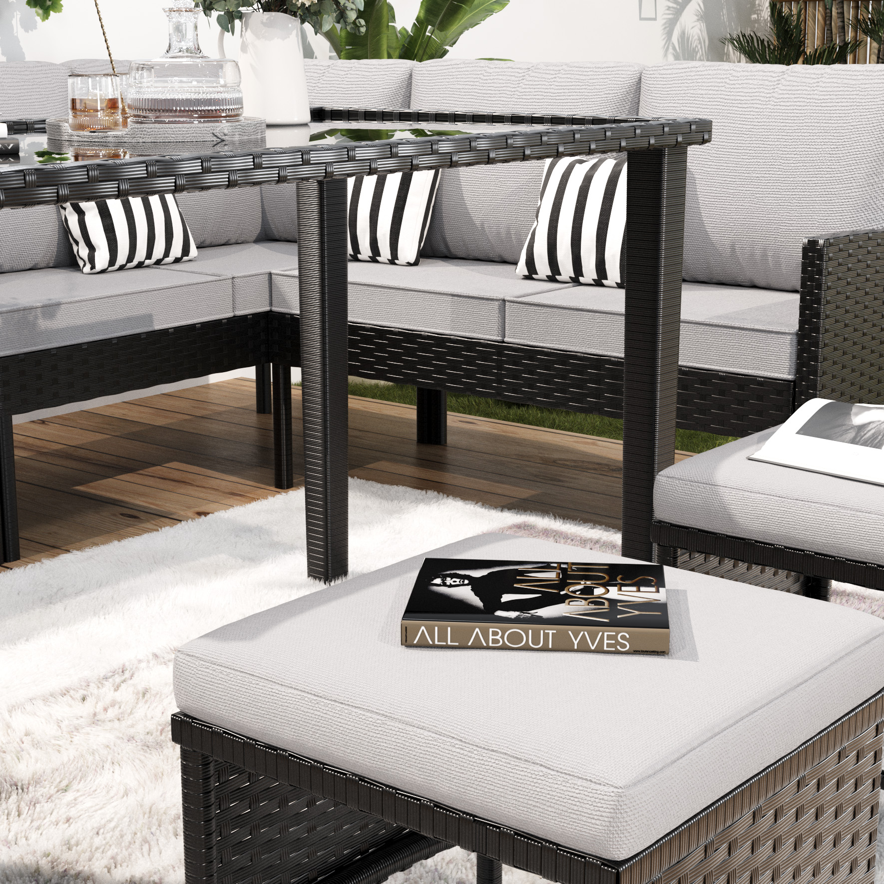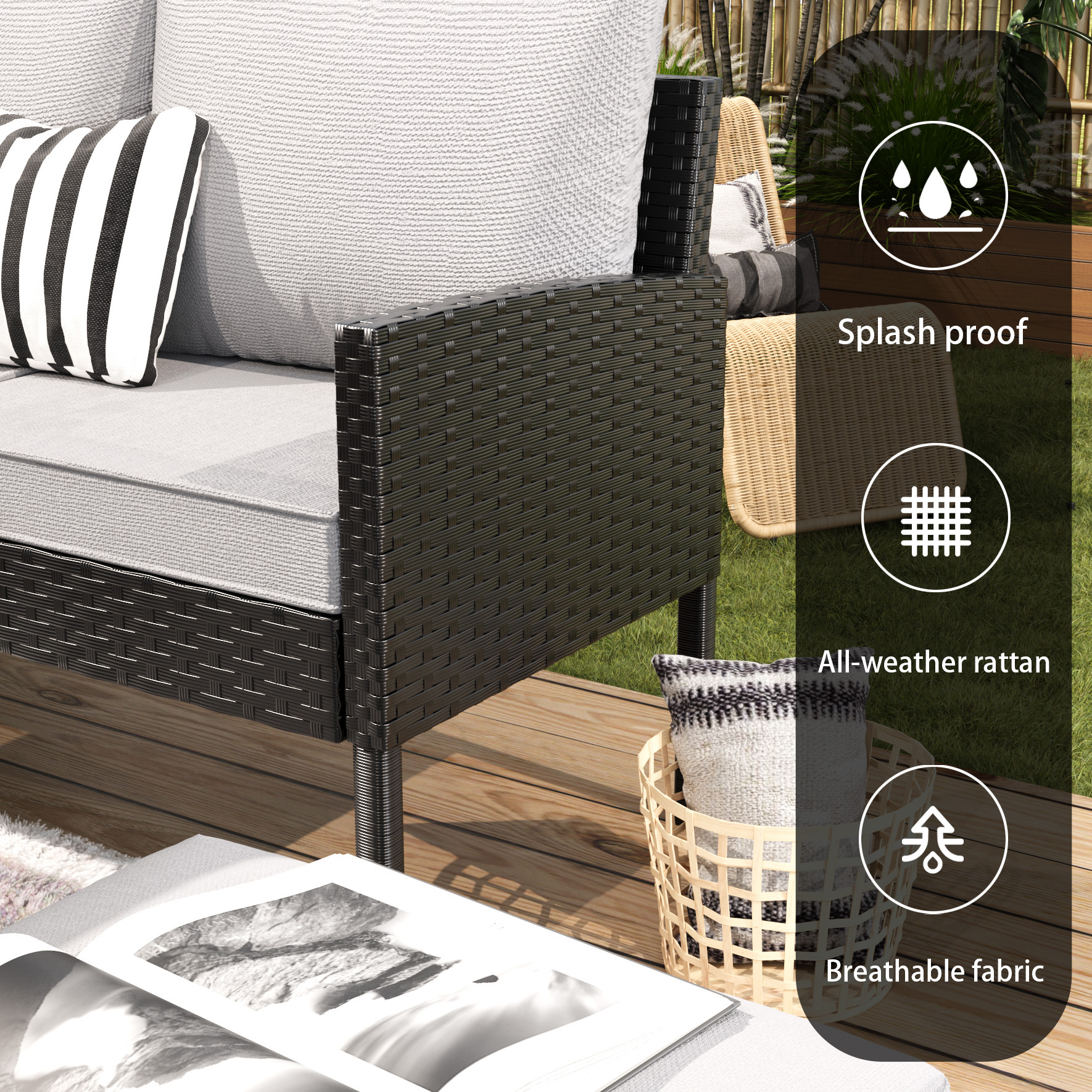 The surface is highly water-repellent, effectively protecting against accidental spills (such as water and beverages) in everyday life, keeping the interior dry and clean for easy care. It is woven from high-quality, eco-friendly rattan (PE rattan/imitation rattan) designed specifically for outdoor environments. It offers excellent weather resistance, withstanding sun, rain, heat, and cold, resisting cracking, fading, or deformation, ensuring long-lasting durability. The fabric is breathable, effectively promoting air circulation. It helps quickly dissipate moisture and heat, keeping the contact surface dry and comfortable even after extended use, enhancing the user experience.