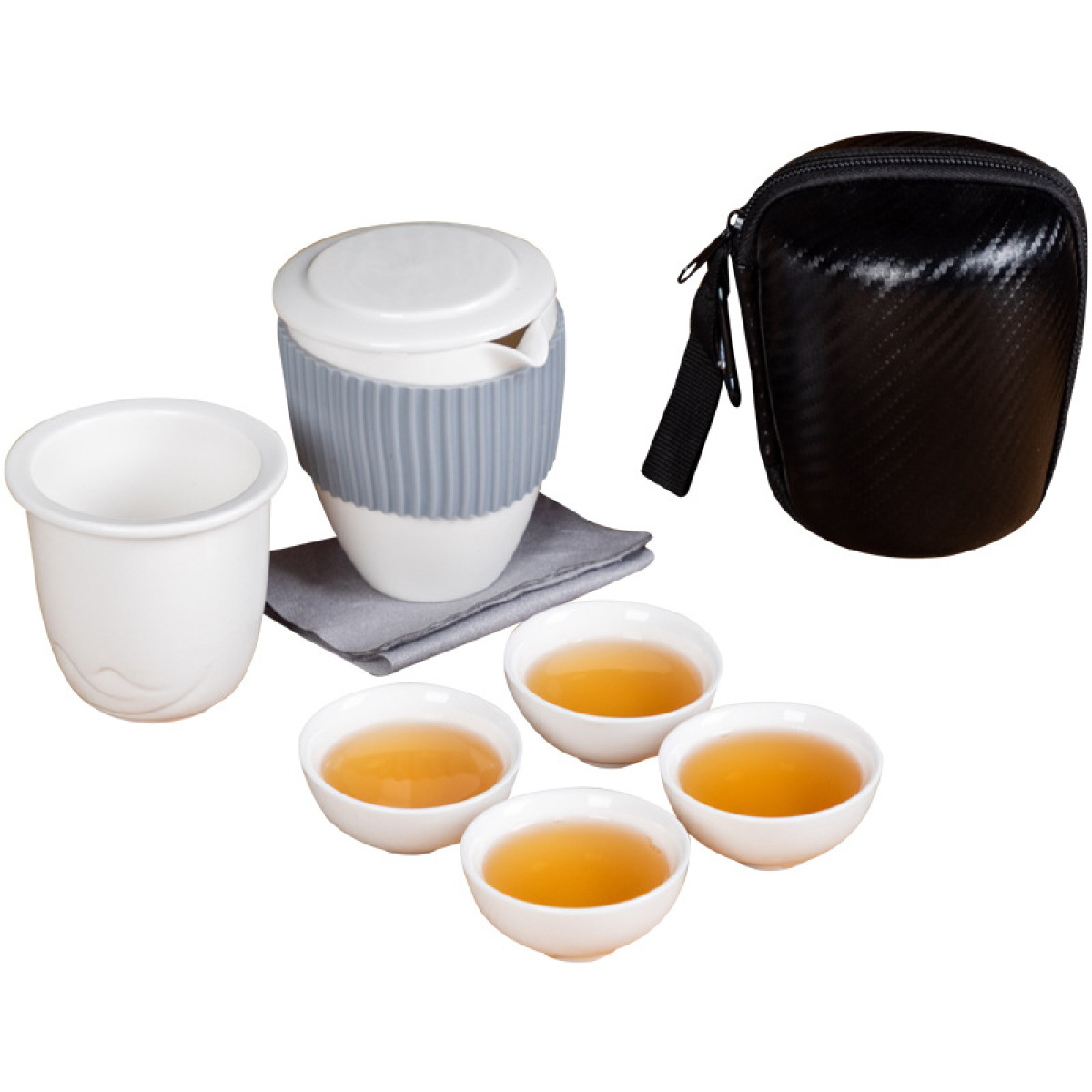 Component 1: tea sea, 1 filter, 4 tea cups, 1 tea towel, 1 travel bag