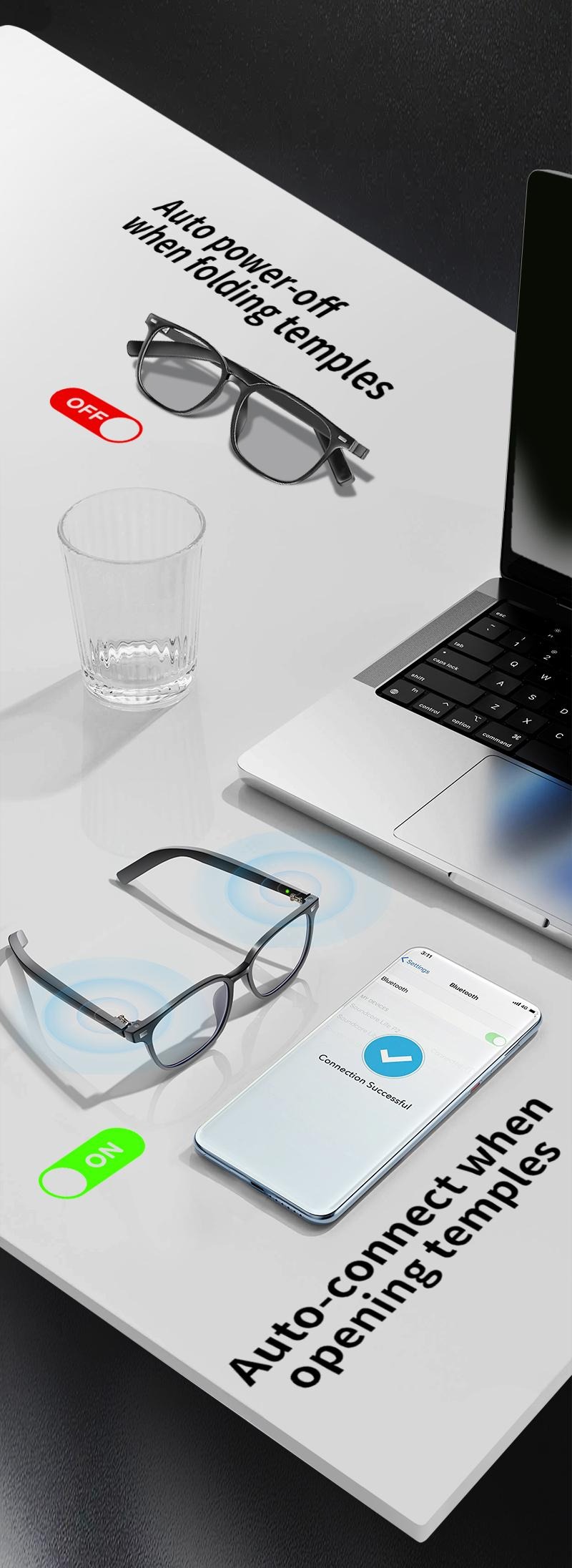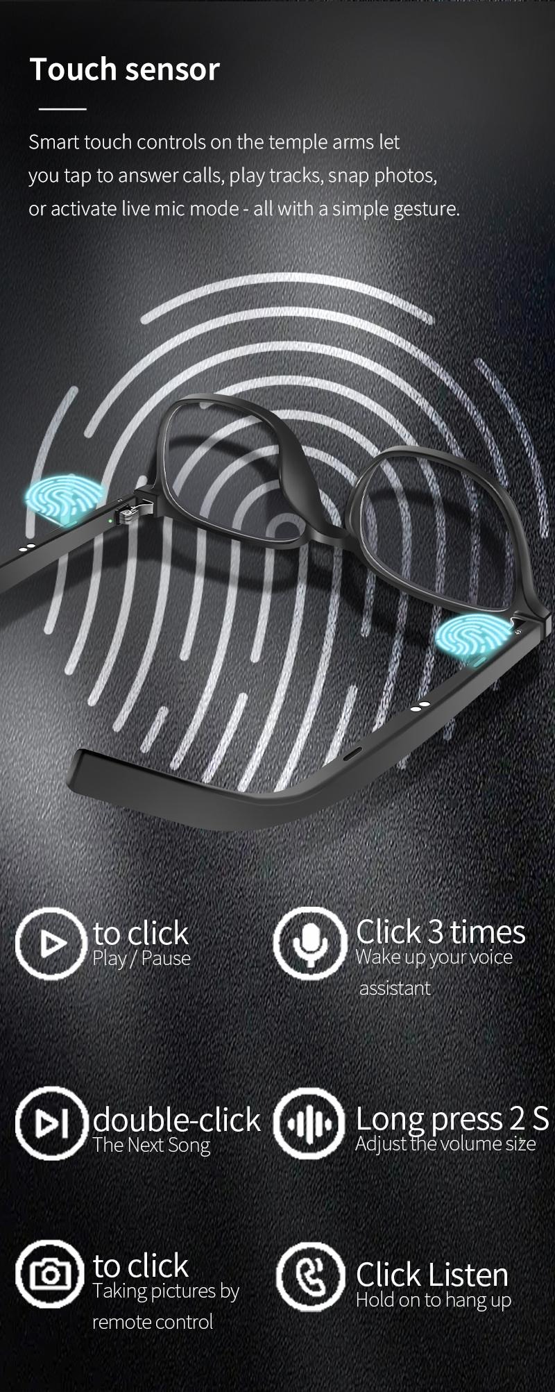Convenient touch sensors on the temples allow you to play/pause music, answer/end calls, skip tracks, adjust volume, and even remotely trigger your smartphone's camera with simple taps. The glasses automatically power on and reconnect when opened, and power off when folded.