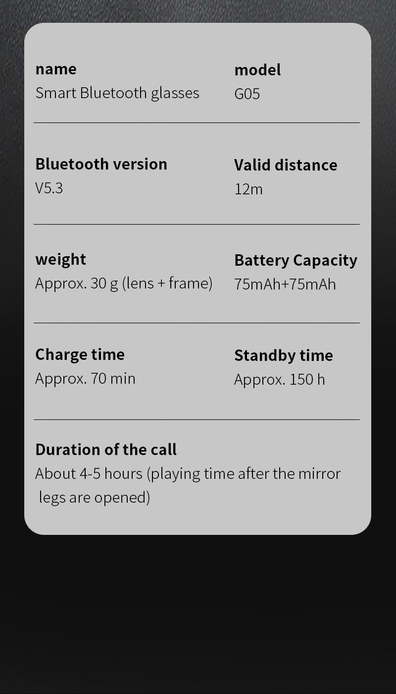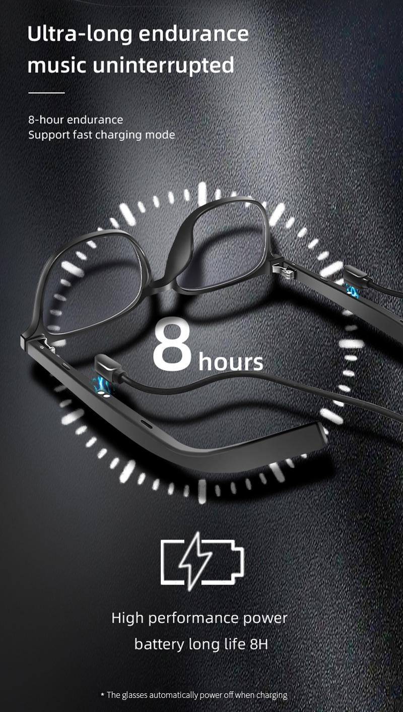 Enjoy up to 8 hours of continuous music or 4-5 hours of talk time on a single charge. With fast-charging support, power up quickly so your glasses are always ready when you are.