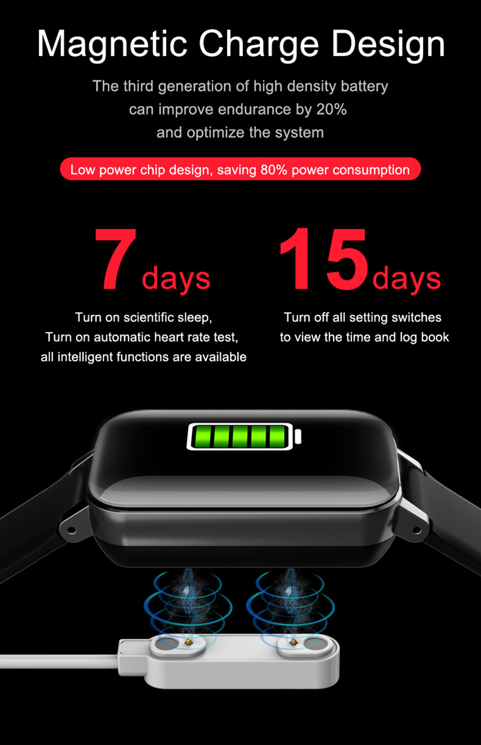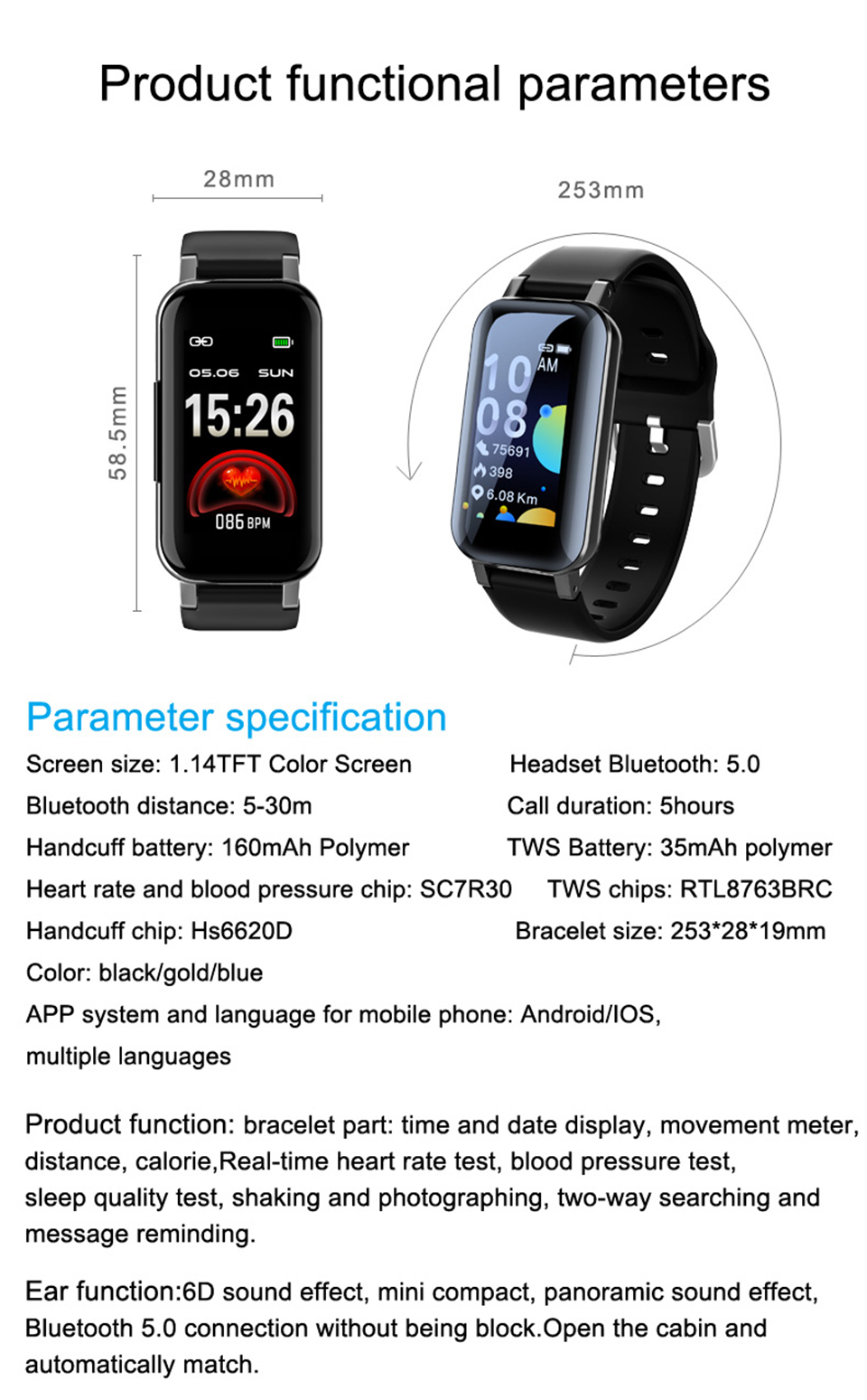 The bracelet APP supports multi-language, magnetic charging, safe and stable charging, non-destructive charging excuses, no damage to the built-in battery. TWS Bluetooth headset, ergonomic long wear painless, built-in Bluetooth 5.0 chip, HIFI level HD sound quality, touch sensor, for Siri's voice wake up.