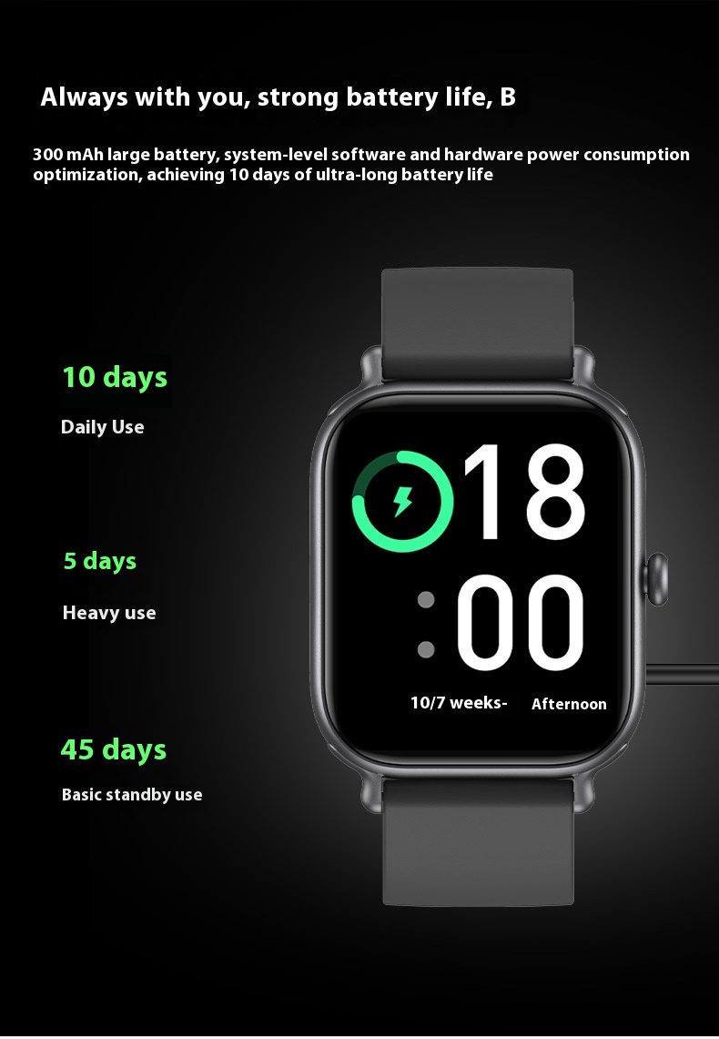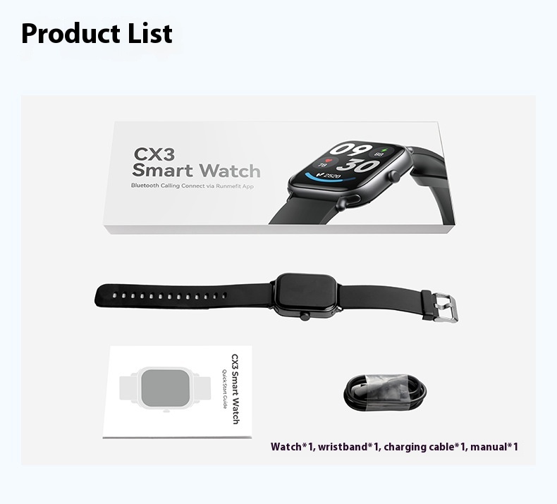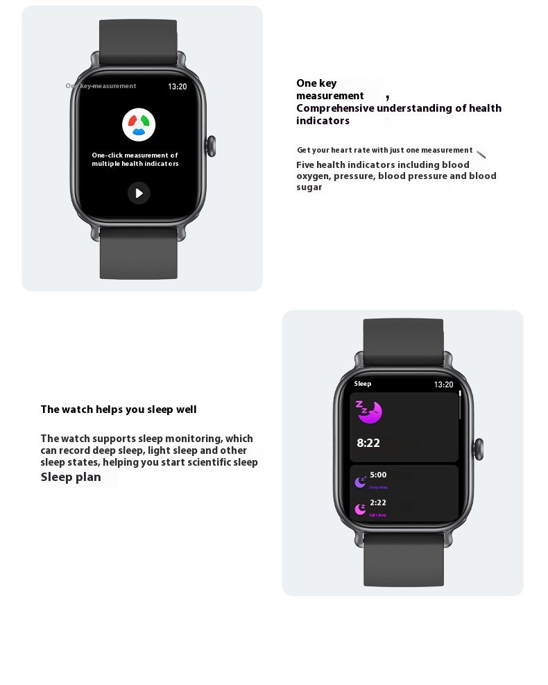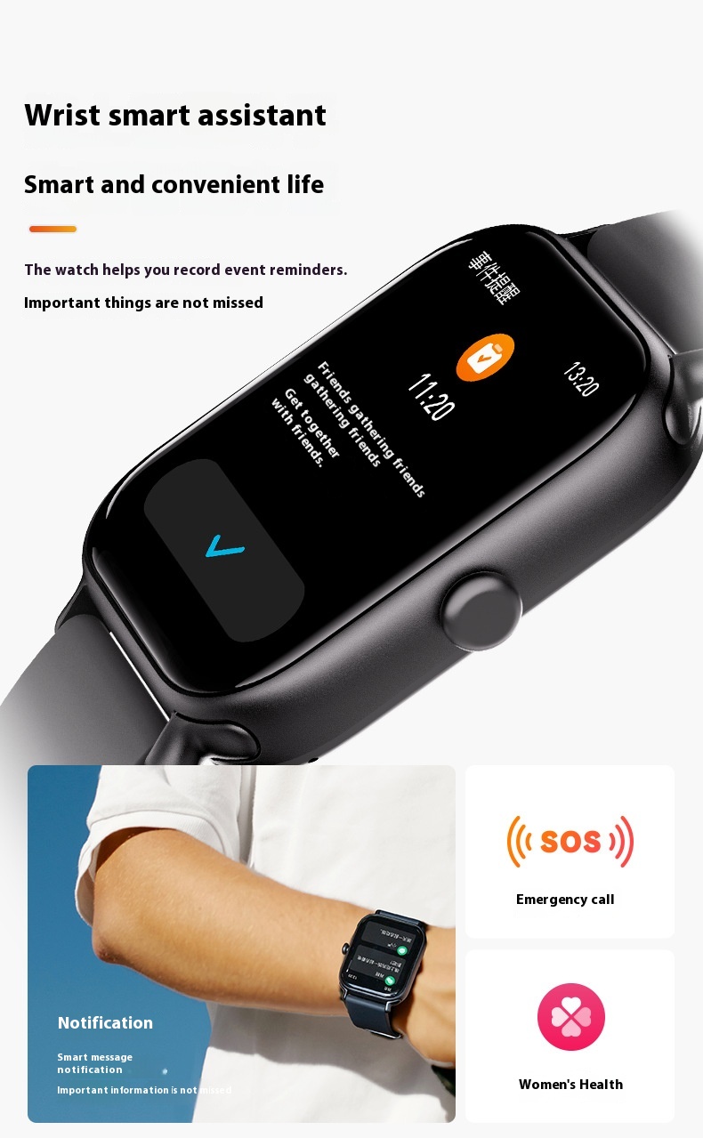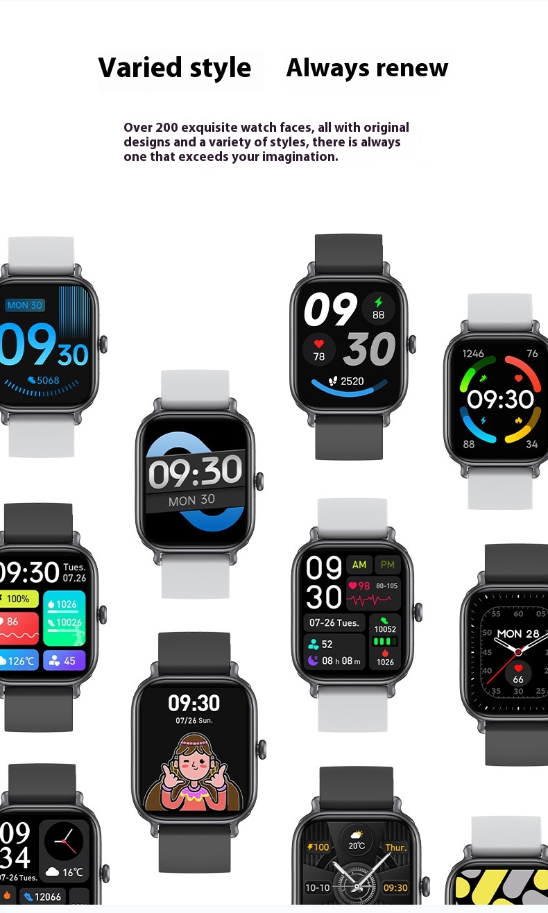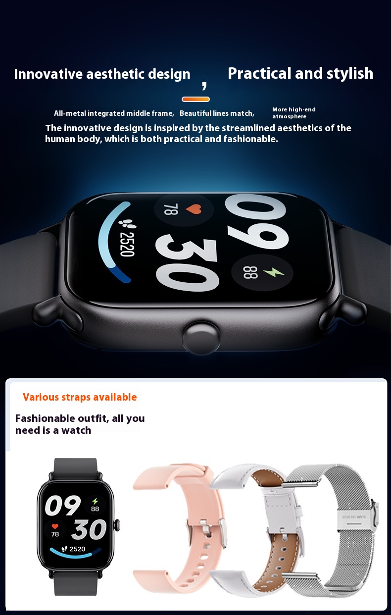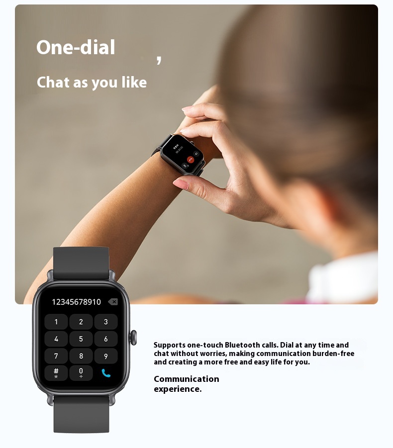 Functions: Waterproof, step counting, heart rate monitoring, Bluetooth calling, smart reminder, remote control selfie, sleep monitoring, blood oxygen detection
