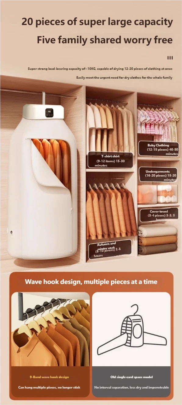 Large Capacity, Family-Friendly: 10kg load capacity, dries 12-20 garments in one cycle. Ideal for baby clothes, winter coats, bedding, and towels, meeting the needs of a family of five.
