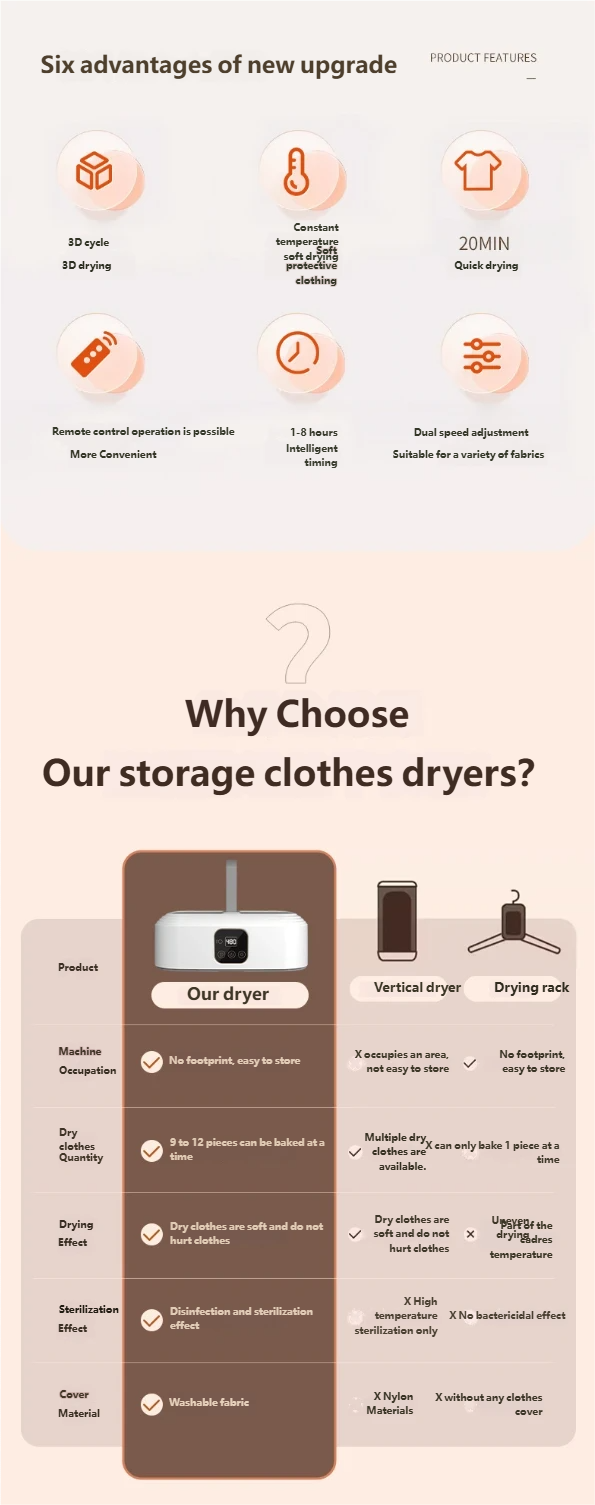 Smart Constant Temperature, Gentle Drying: PTC heating with two modes (Quiet/Standard), 1-8 hours timer, and 3D circulation for even drying. Protects delicate fabrics like silk and wool from damage.