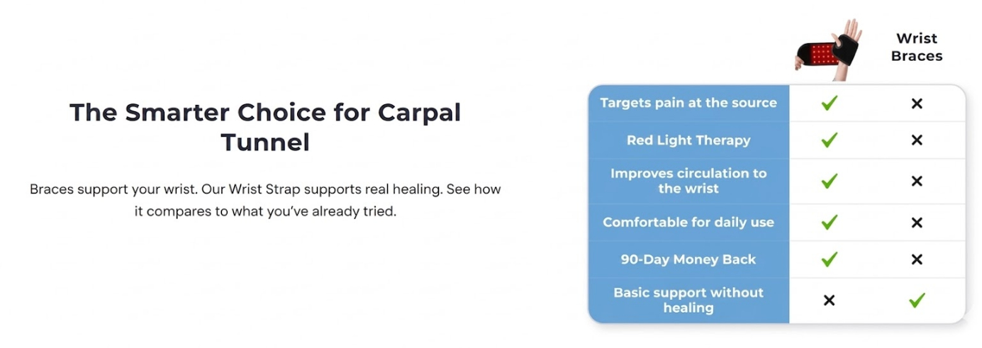 The light activates your cells to repair damage, improves circulation, and tells your body to calm down inflammation. Over time, this helps relieve pressure on the median nerve — the root cause of carpal tunnel.