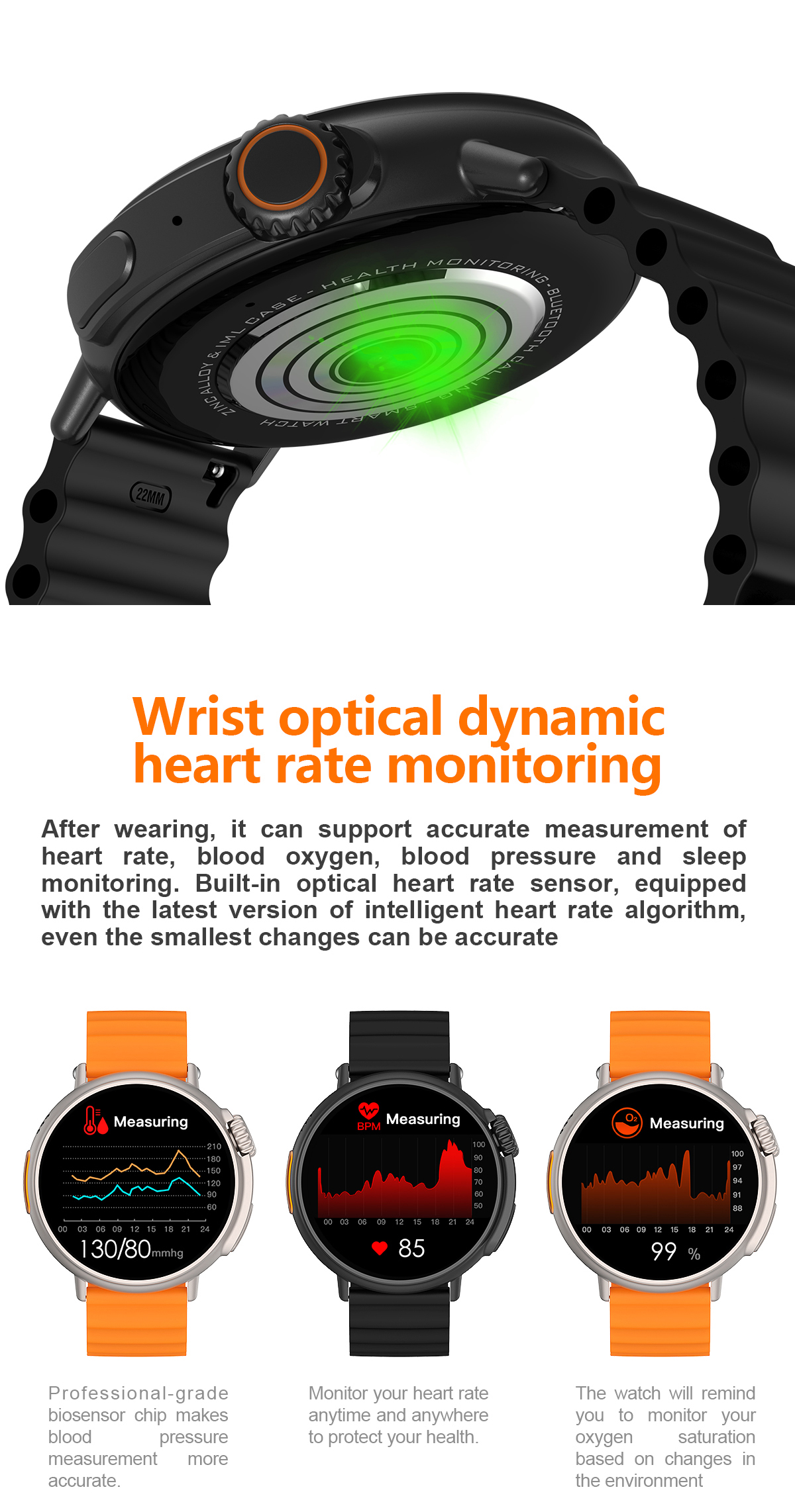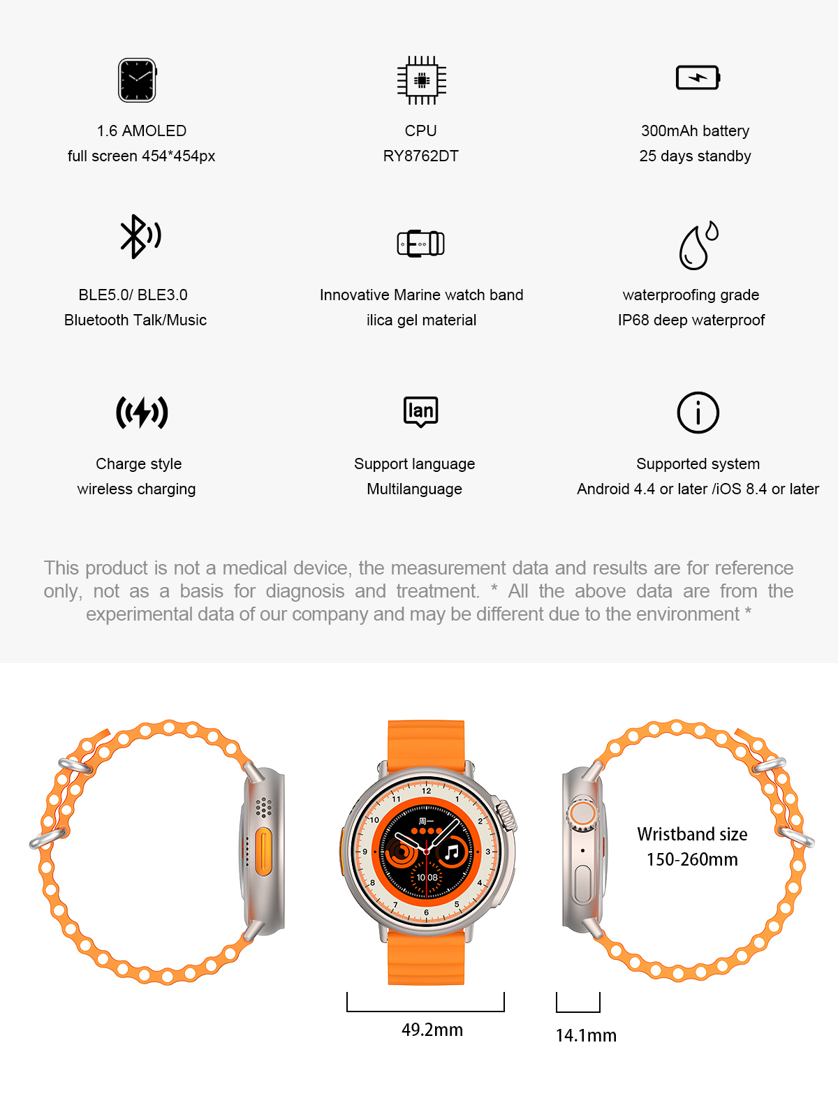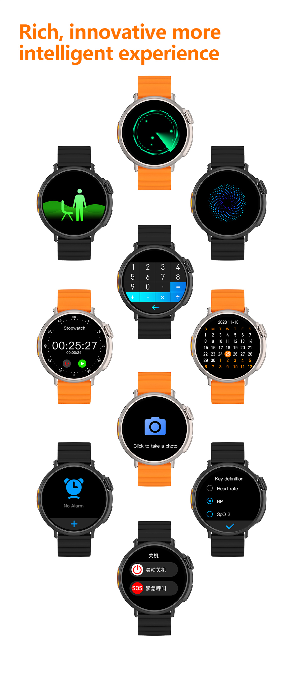 Features: Waterproof, taking photos, taking steps, heart rate monitoring, blood pressure measurement, social entertainment, Bluetooth calling, NFC function, intelligent reminder, remote selfie, sleep monitoring, blood oxygen detection