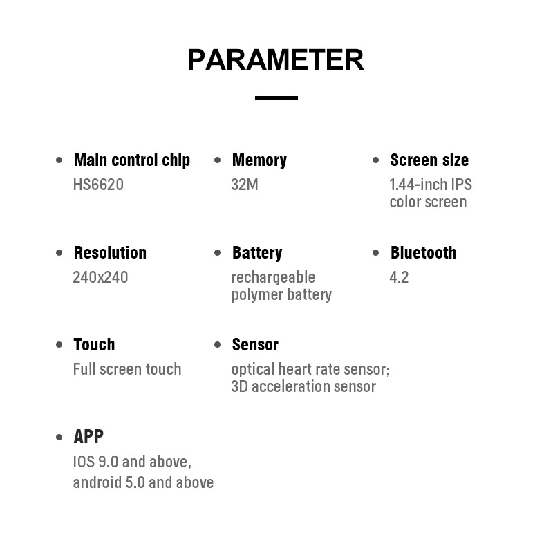 Functions: waterproof, audio-visual entertainment, step counting, heart rate monitoring, blood pressure measurement, social entertainment, Bluetooth call, intelligent reminder, remote self-timer, sleep monitoring, blood oxygen detection, information push, motion tracking.