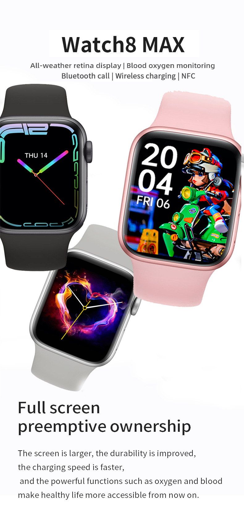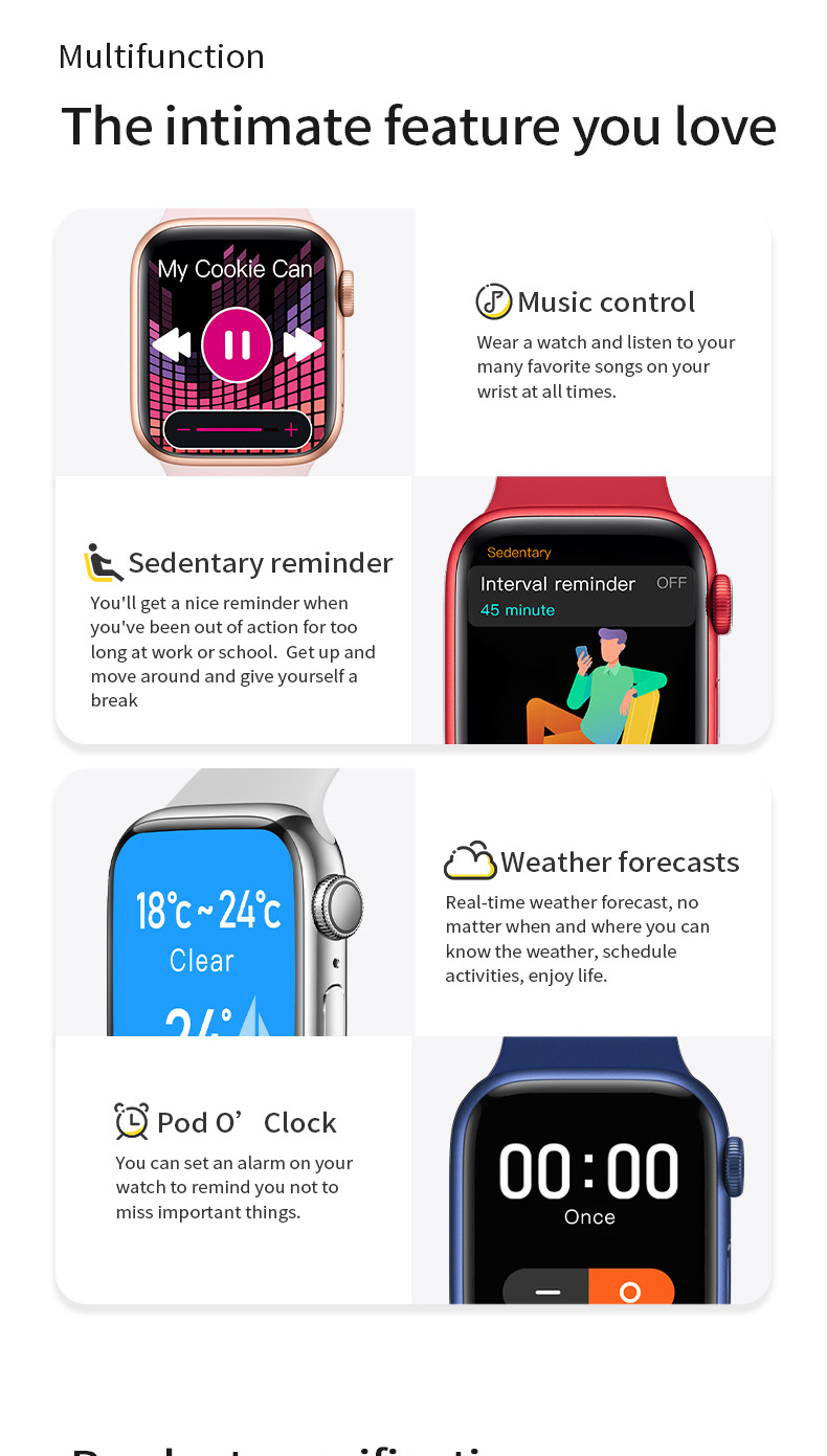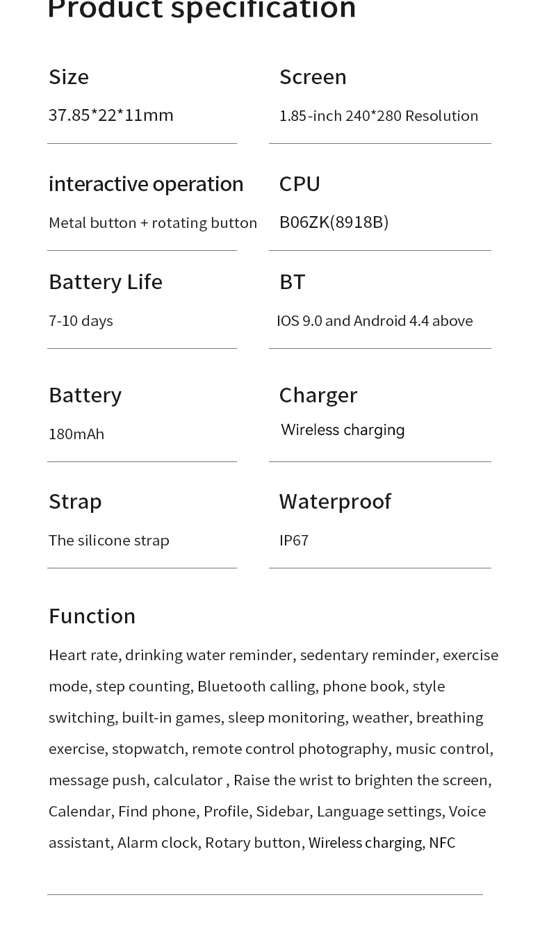 Functions: step counting, heart rate monitoring, social entertainment, Bluetooth calling, smart reminder, remote control selfie, sleep monitoring, blood oxygen detection