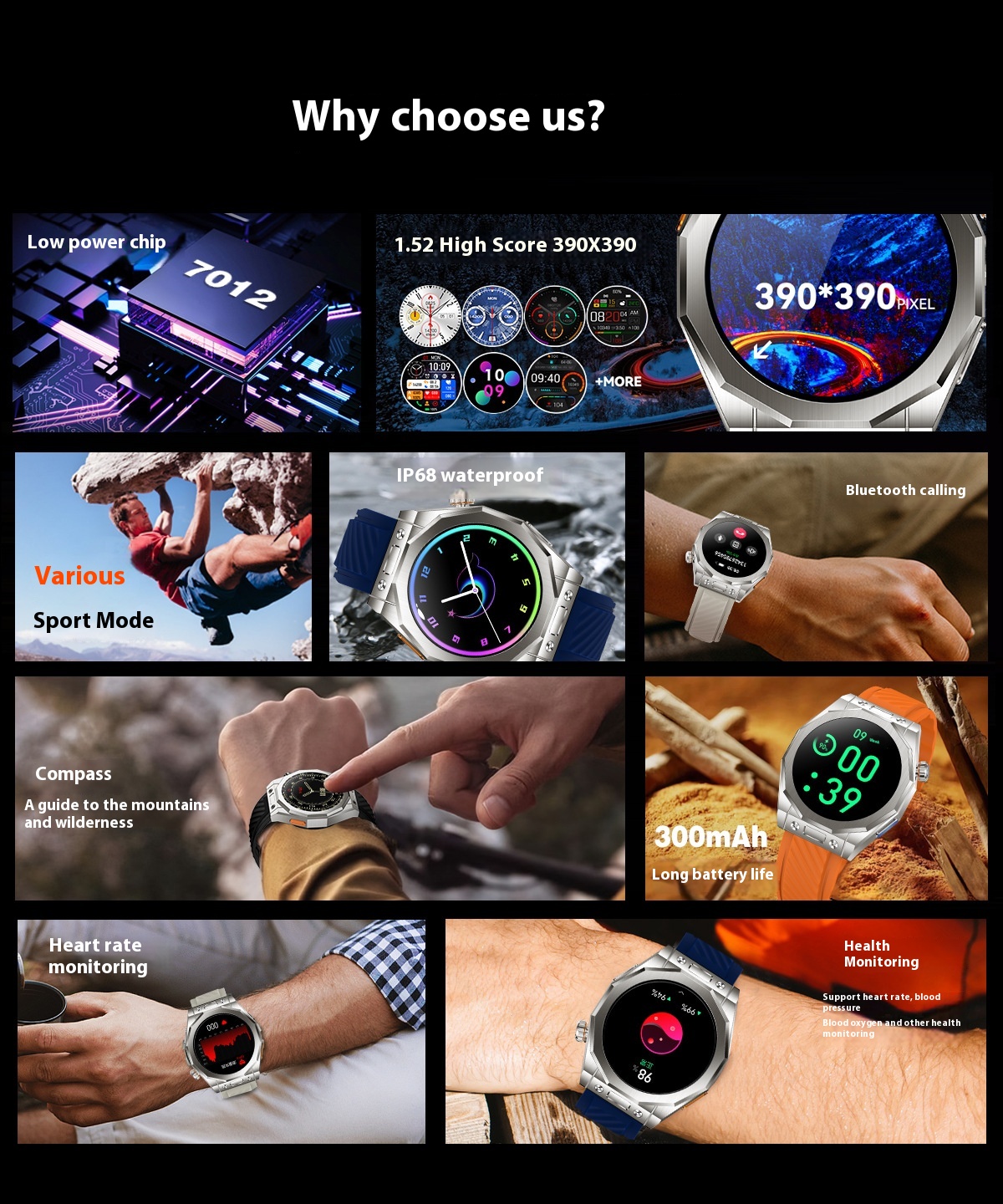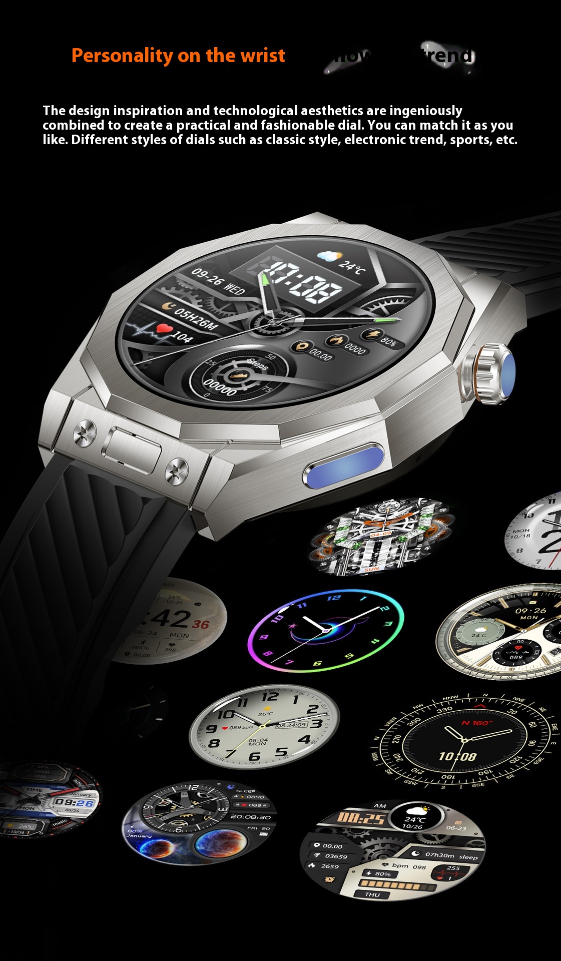 Functions: Waterproof, step counting, heart rate monitoring, blood pressure measurement, social entertainment, body temperature measurement, Bluetooth calling, NFC function, smart reminder, remote control selfie, sleep monitoring, blood oxygen detection